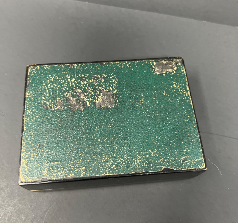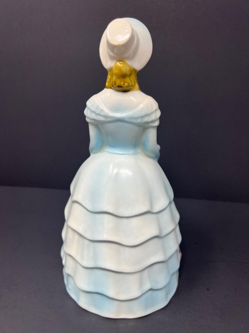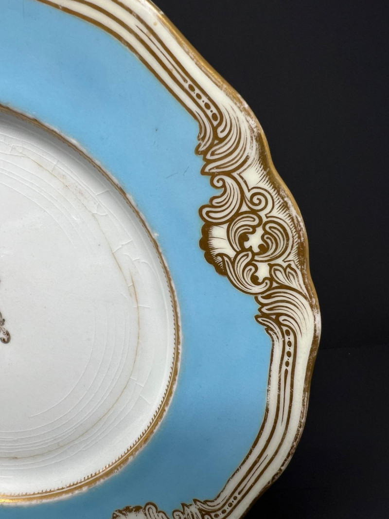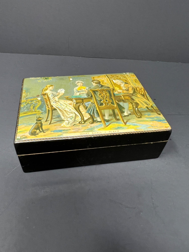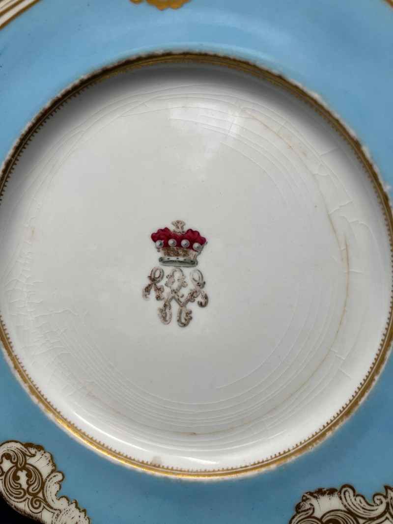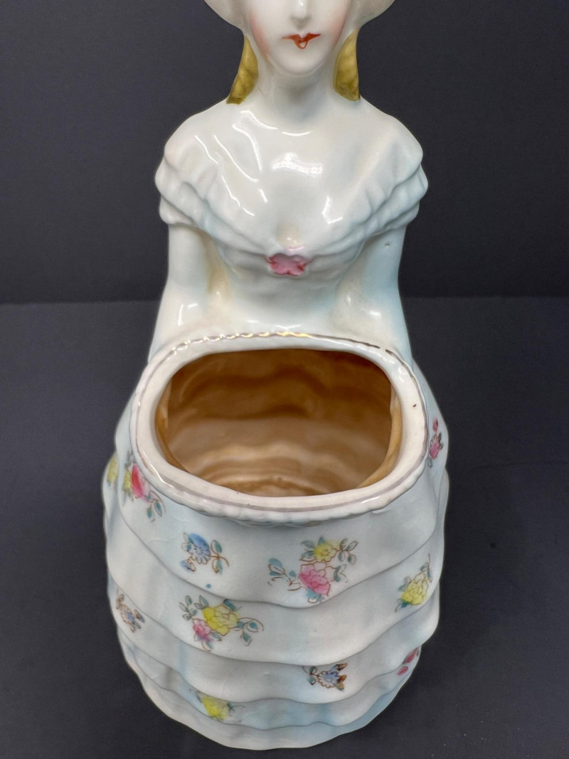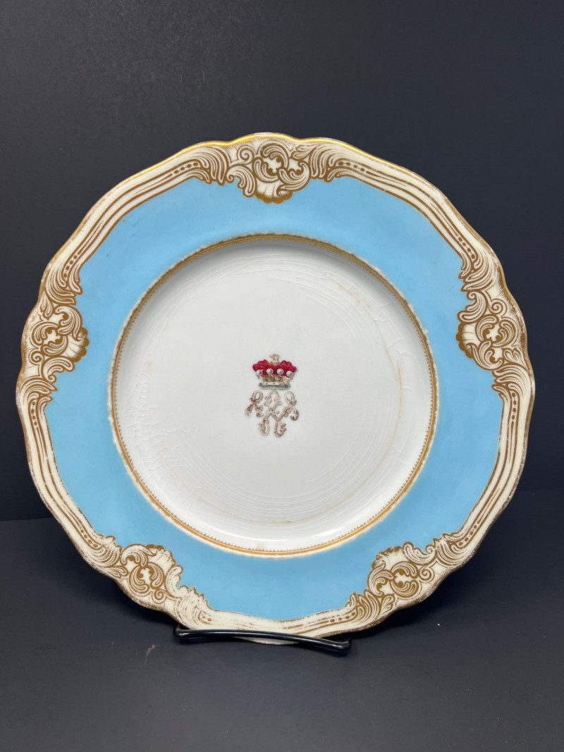 Charming Victorian-style decorative grouping featuring an antique Royal Worcester powder blue and gilt porcelain plate with crowned monogram crest. The backstamp reads “Hadley’s Worcester,” referencing noted Royal Worcester modeller James Hadley, associated with the factory’s decorative wares in the late 19th century. Also included is a porcelain lady vase figure with floral decoration and a small decorative box featuring a Victorian card-playing scene. A whimsical parlor-style vignette with classic Victorian charm. Wear consistent with age and use. Plate 10" diameter, Lady vase 8" in height, box 4.5" x 3.25"
