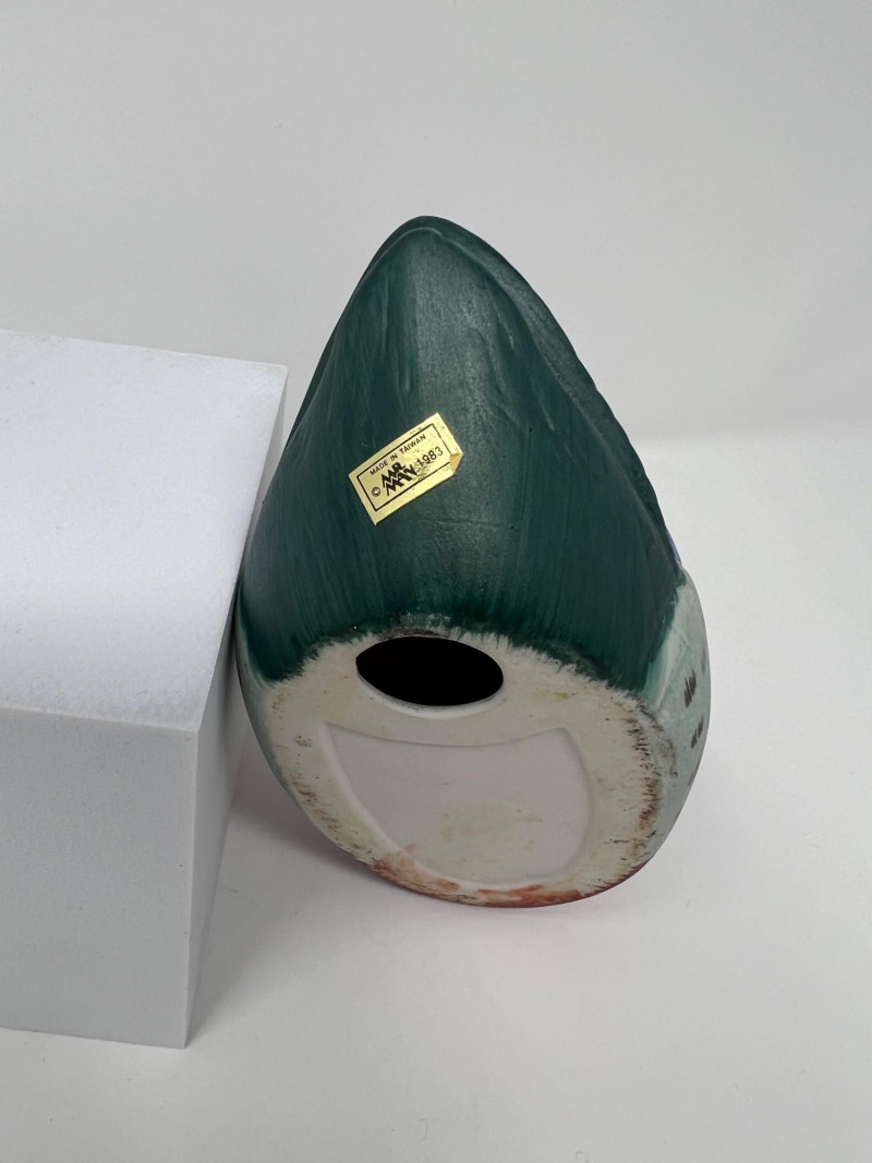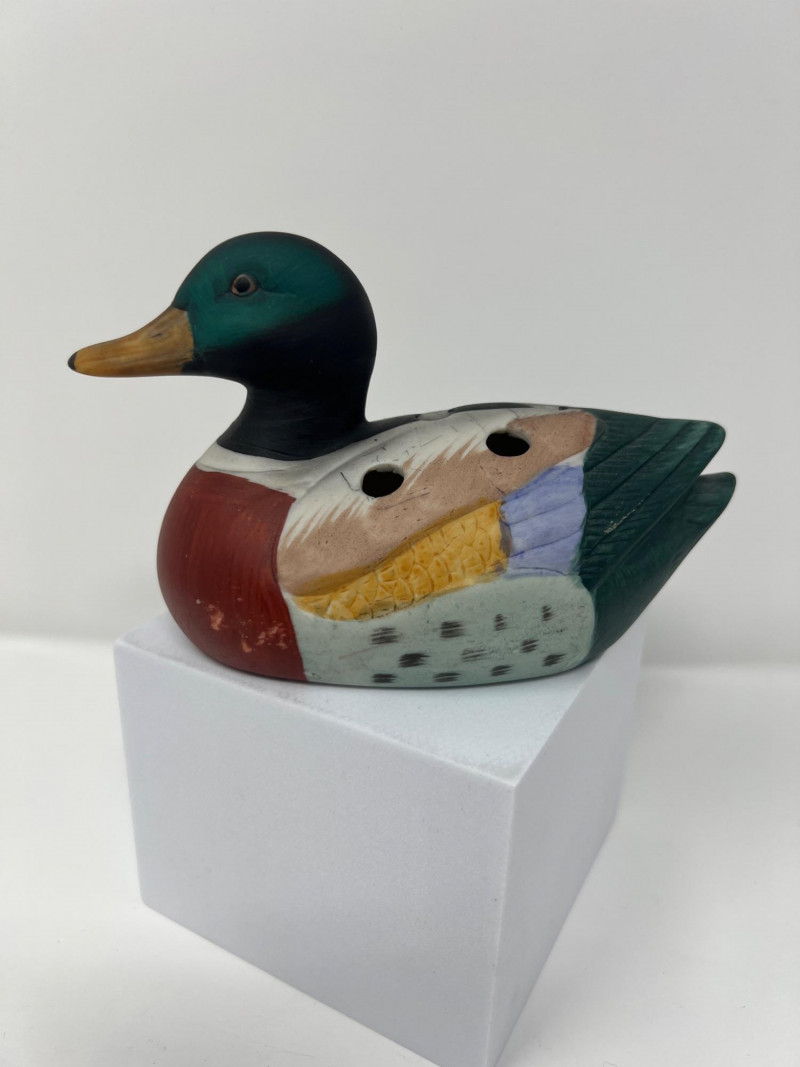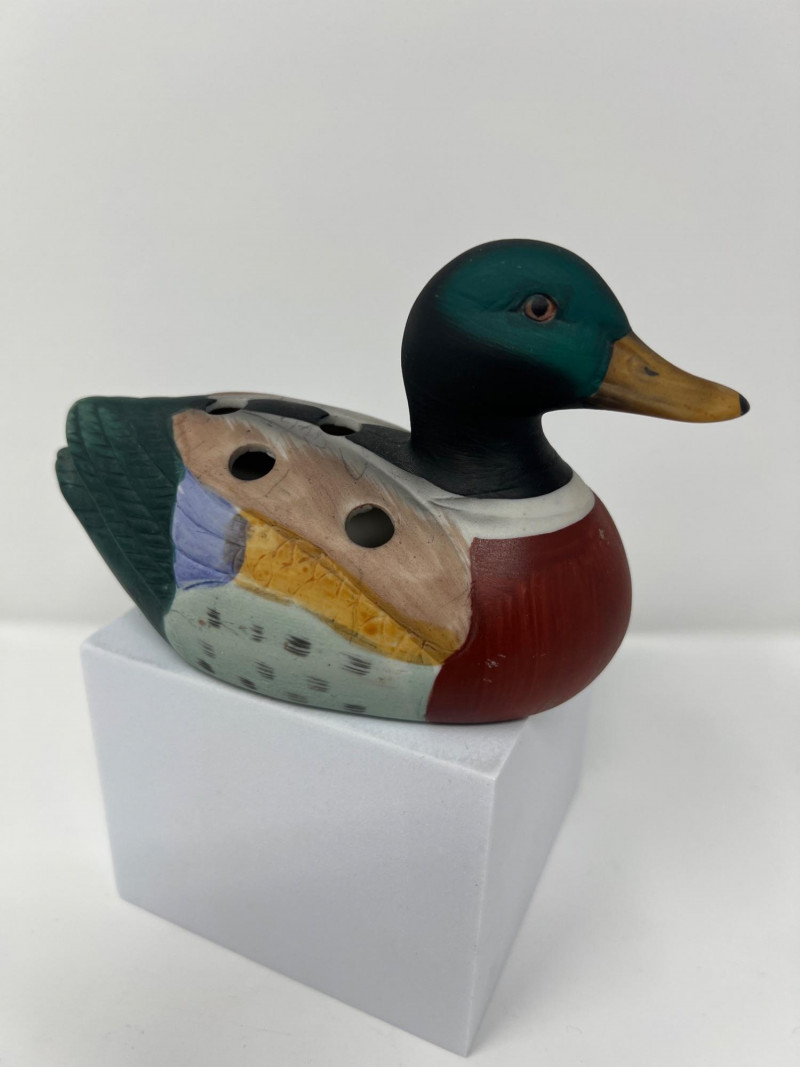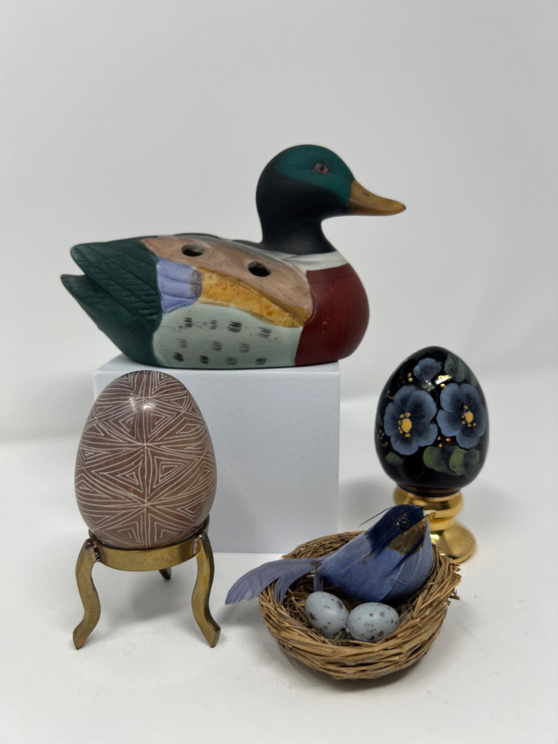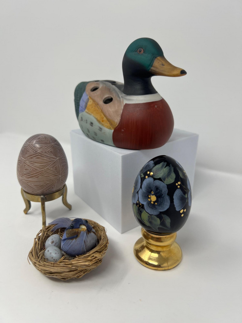A charming spring-themed decorative grouping featuring birds and eggs. The highlight is a hand-painted Fenton art glass egg signed by the artist D. Whetstone and numbered 1209 of 2500, with gold decorated pedestal base. Also included is a carved folk art stone egg with geometric star pattern on brass stand, a ceramic mallard duck flower frog made in Taiwan (1983), and a bluebird in nest figurine with speckled eggs. A cheerful vintage vignette perfect for spring or Easter display. All pieces in good vintage condition with light age wear. Duck flower frog 6" x 3.75". Fenton egg 3.25".