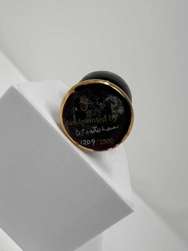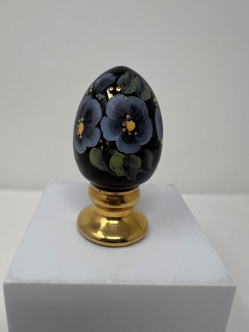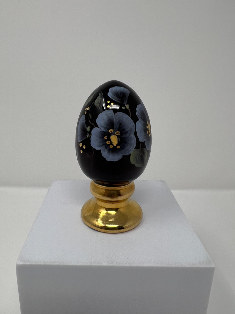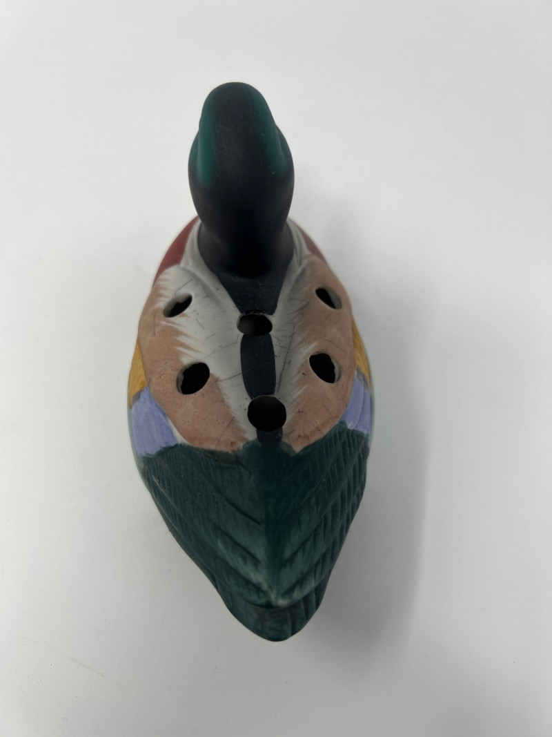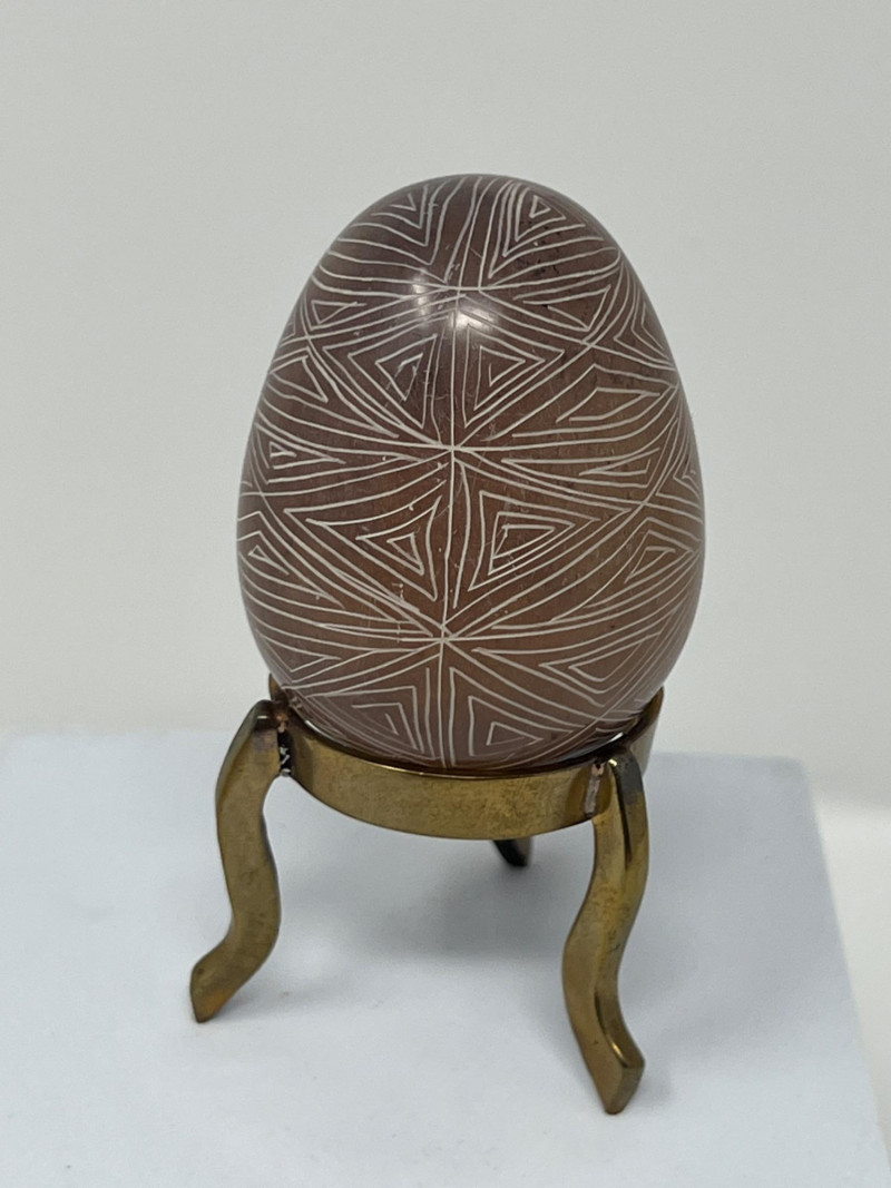 A charming spring-themed decorative grouping featuring birds and eggs. The highlight is a hand-painted Fenton art glass egg signed by the artist D. Whetstone and numbered 1209 of 2500, with gold decorated pedestal base. Also included is a carved folk art stone egg with geometric star pattern on brass stand, a ceramic mallard duck flower frog made in Taiwan (1983), and a bluebird in nest figurine with speckled eggs. A cheerful vintage vignette perfect for spring or Easter display. All pieces in good vintage condition with light age wear. Duck flower frog 6" x 3.75". Fenton egg 3.25".