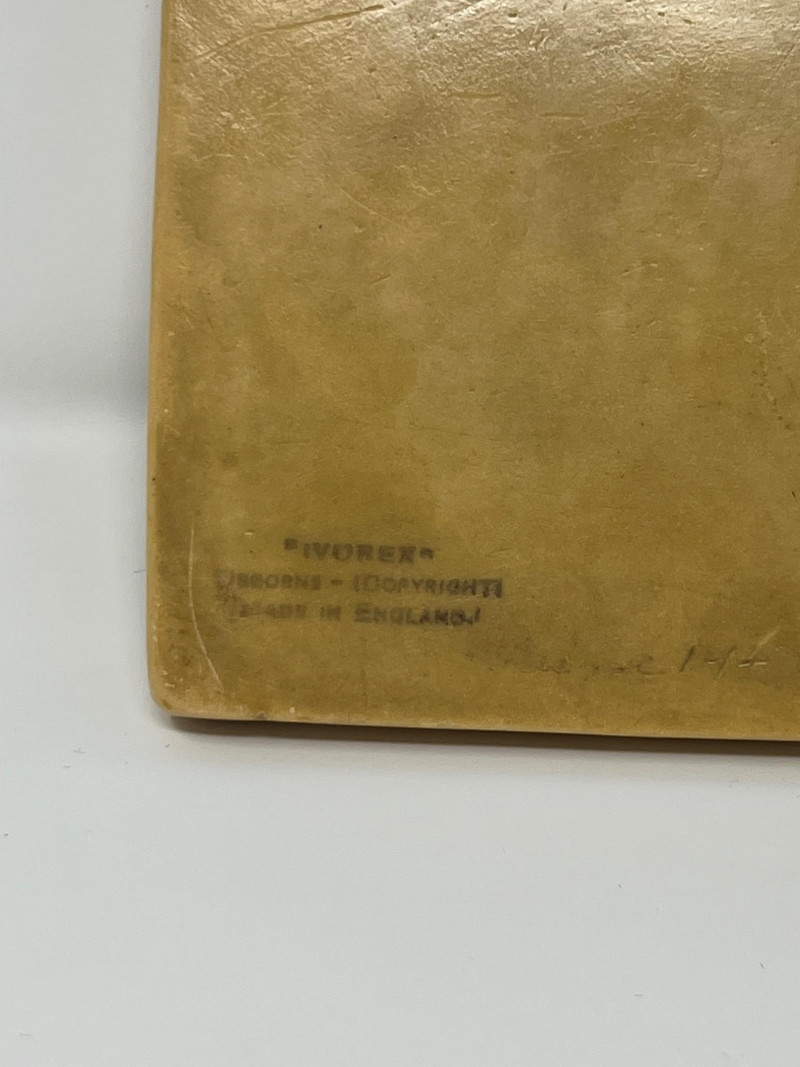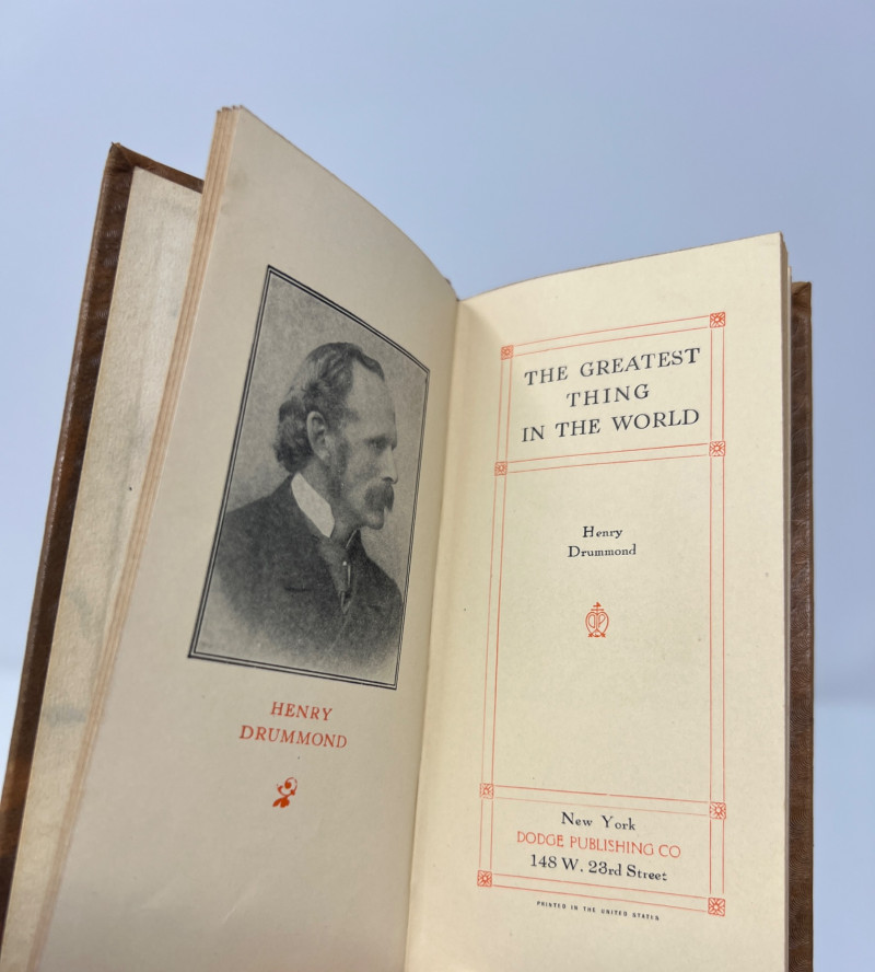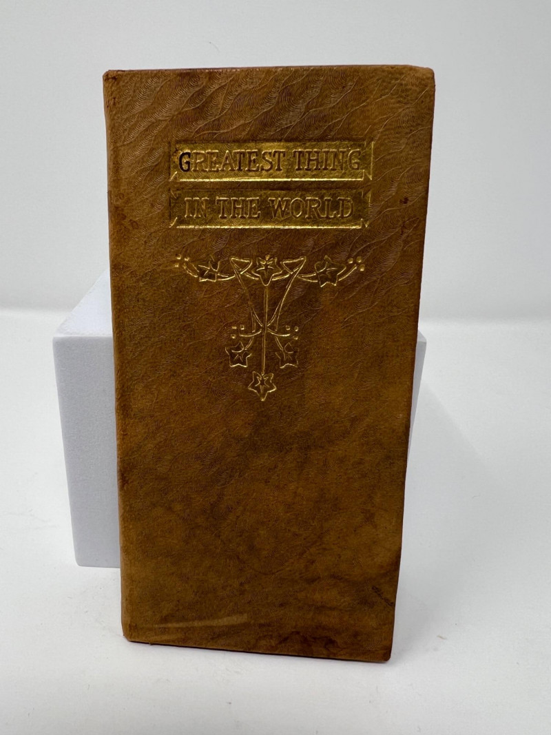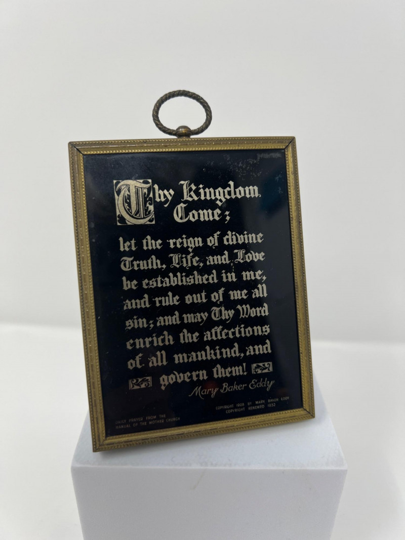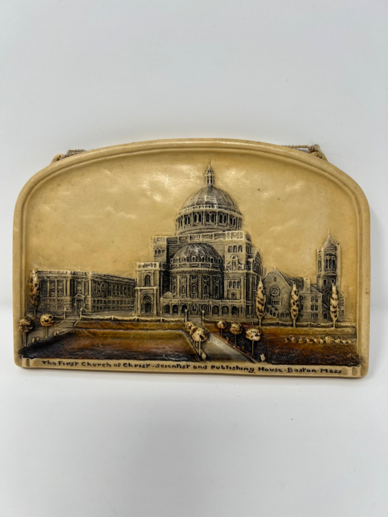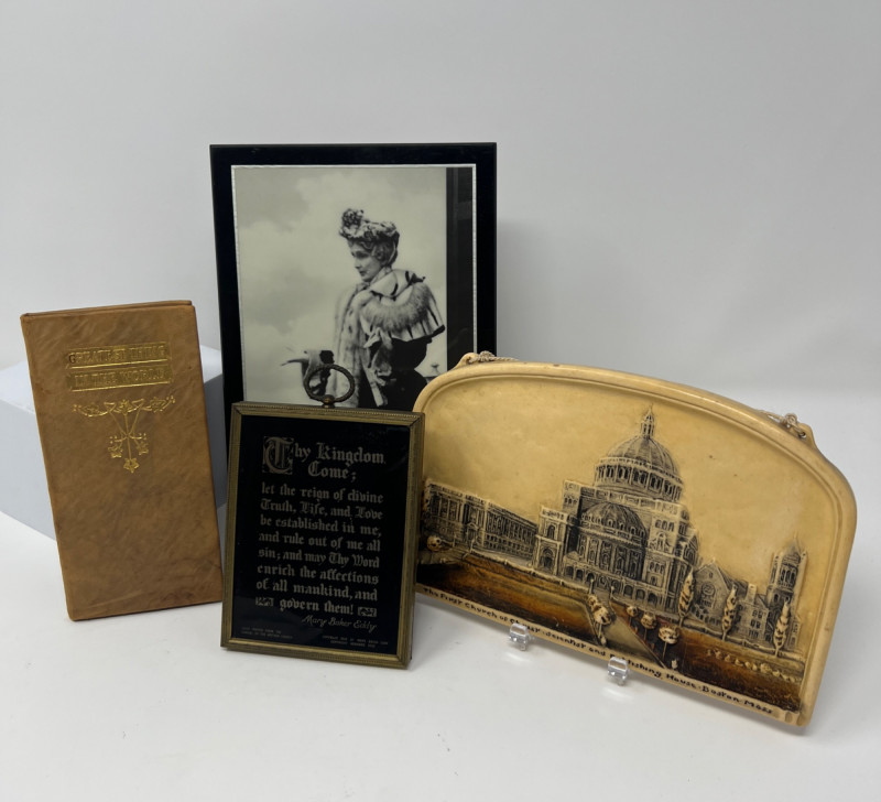 Small collection of Christian Science related devotional items including an Ivorex molded wall plaque depicting The First Church of Christ, Scientist and Publishing House, Boston, Massachusetts, a framed devotional plaque dated 1932 featuring a quotation attributed to Mary Baker Eddy, a leather bound gift edition of “The Greatest Thing in the World” by Henry Drummond, and a vintage framed portrait photograph. An attractive grouping with strong Boston religious history and Christian Science collector interest, ideal for display or devotional collections. Portrait 5.5" x 7.25" Ivorex plaque 7.25" x 5"