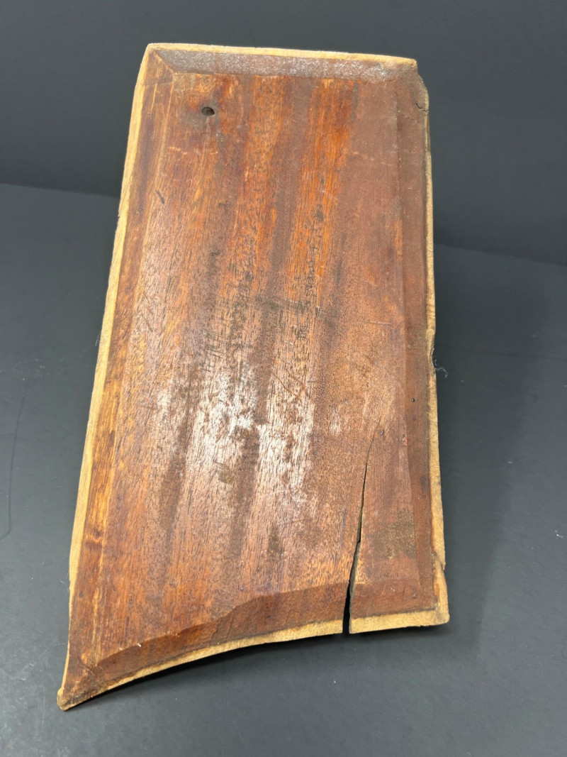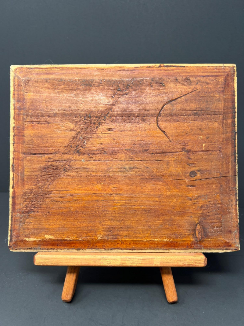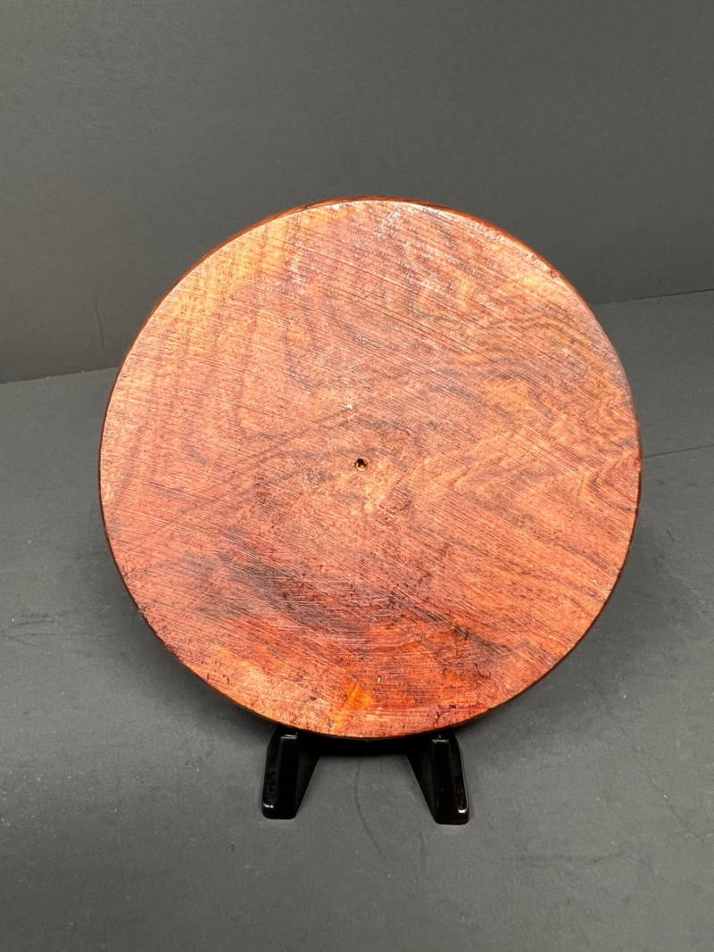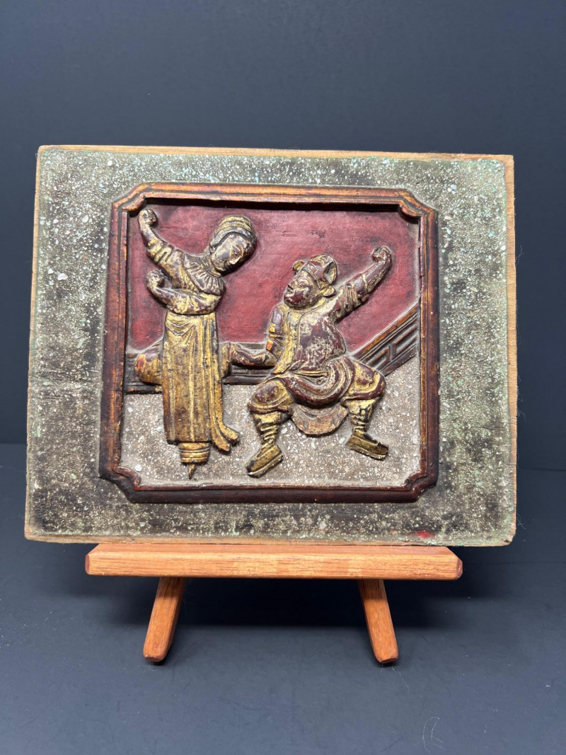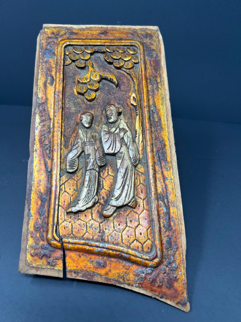 Asian-inspired decorative grouping including two carved wooden relief panels depicting traditional figural scenes, a tall textured pottery vase with raised ornament and blue enamel accents, and a turned wooden incense burner dish featuring a Yin-Yang symbol with brass-lined incense holes. The carved panels may have originally served as furniture or architectural elements and now display beautifully as wall décor. A striking decorative vignette with Asian and Chinoiserie influence, ideal for shelf, console, or wall display. One panel showing minor age-related wear including a small crack consistent with age. Vase 16", panels 10 x 5" & 8.25 x 7", Yin Yang burner 4" in diameter.
