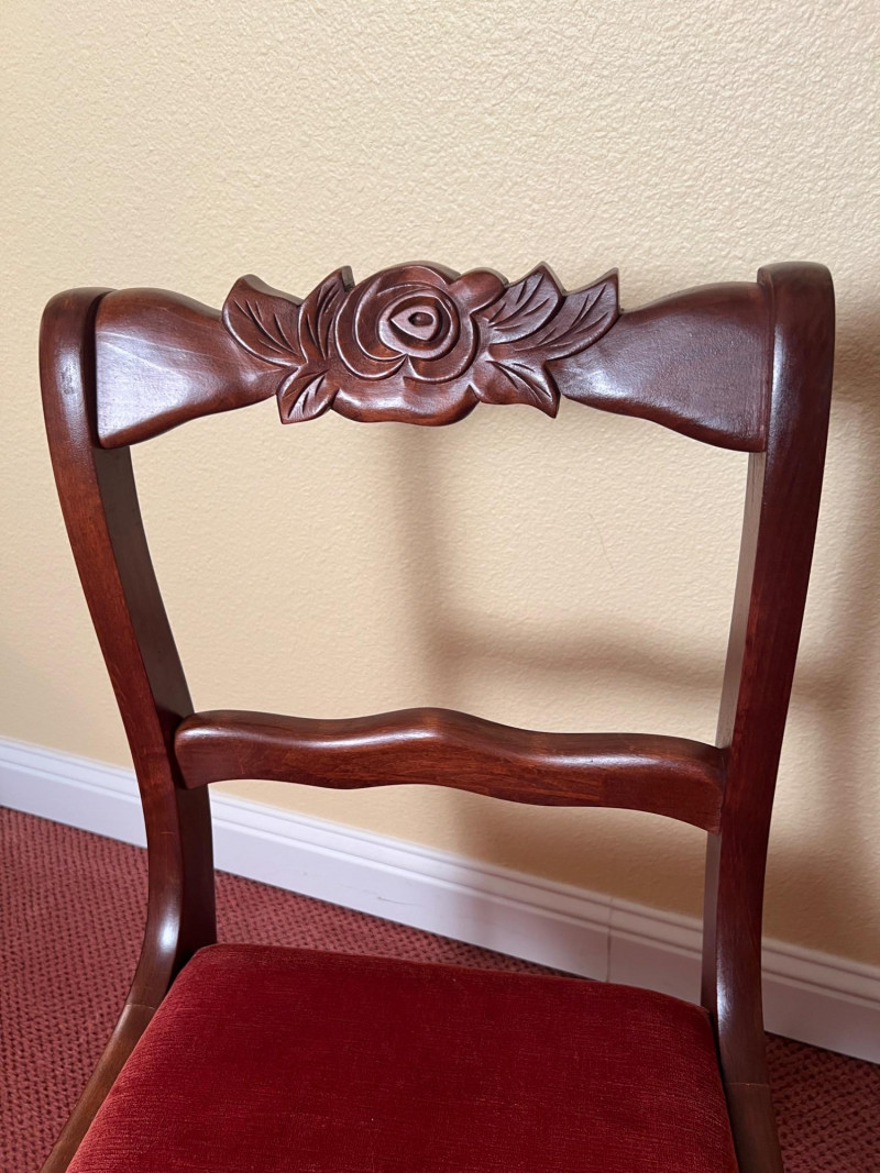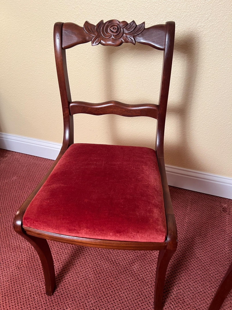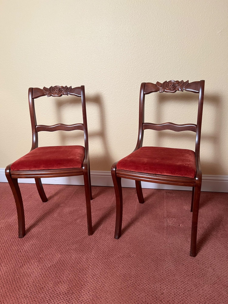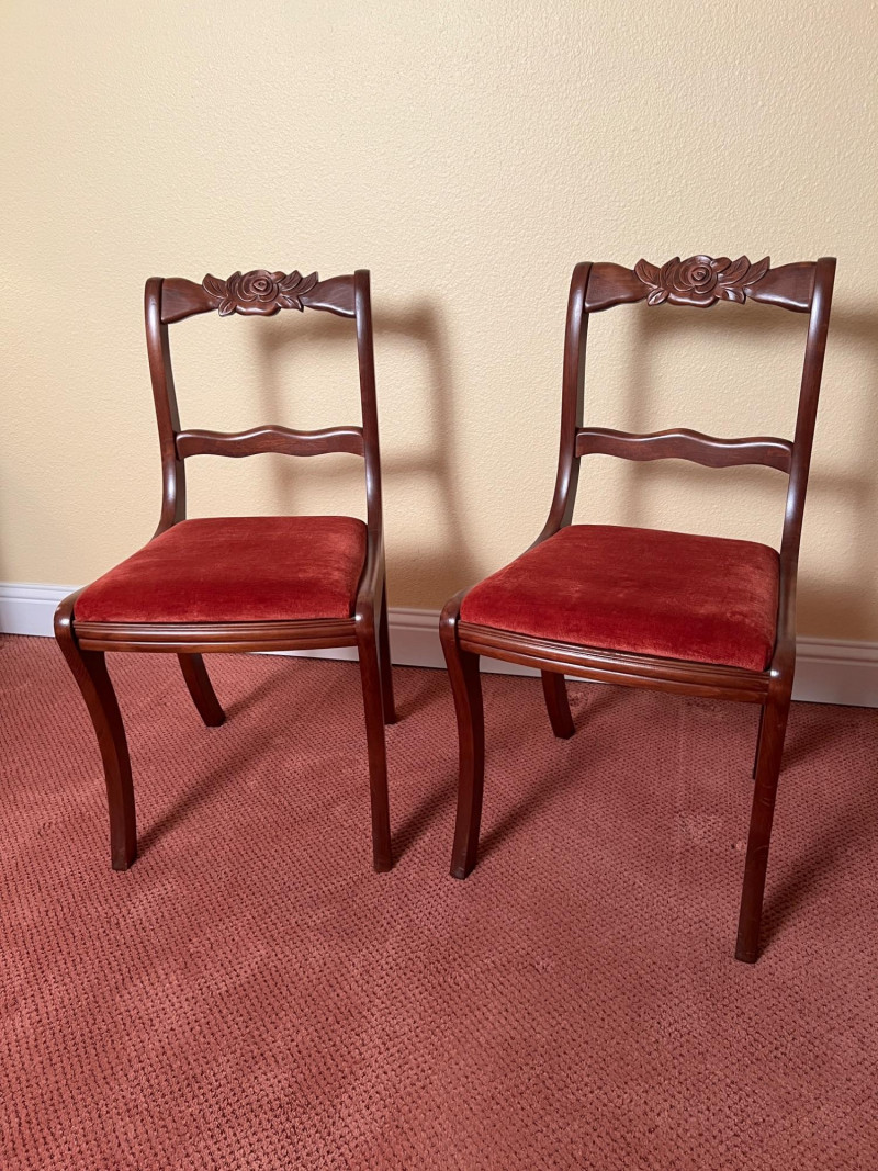 Pair of vintage French Provincial style side chairs featuring carved rose crest rails, curved ladder backs, and elegant cabriole legs. Finished in a warm mahogany tone and upholstered in rich rust-red fabric seats. Classic mid-century revival design inspired by Louis XV furniture, making these suitable for dining, bedroom, or accent seating. Good vintage condition with normal light wear consistent with age. 33.5" OAH, 18" seat height x 17" wide x 16" deep Sold as a pair.