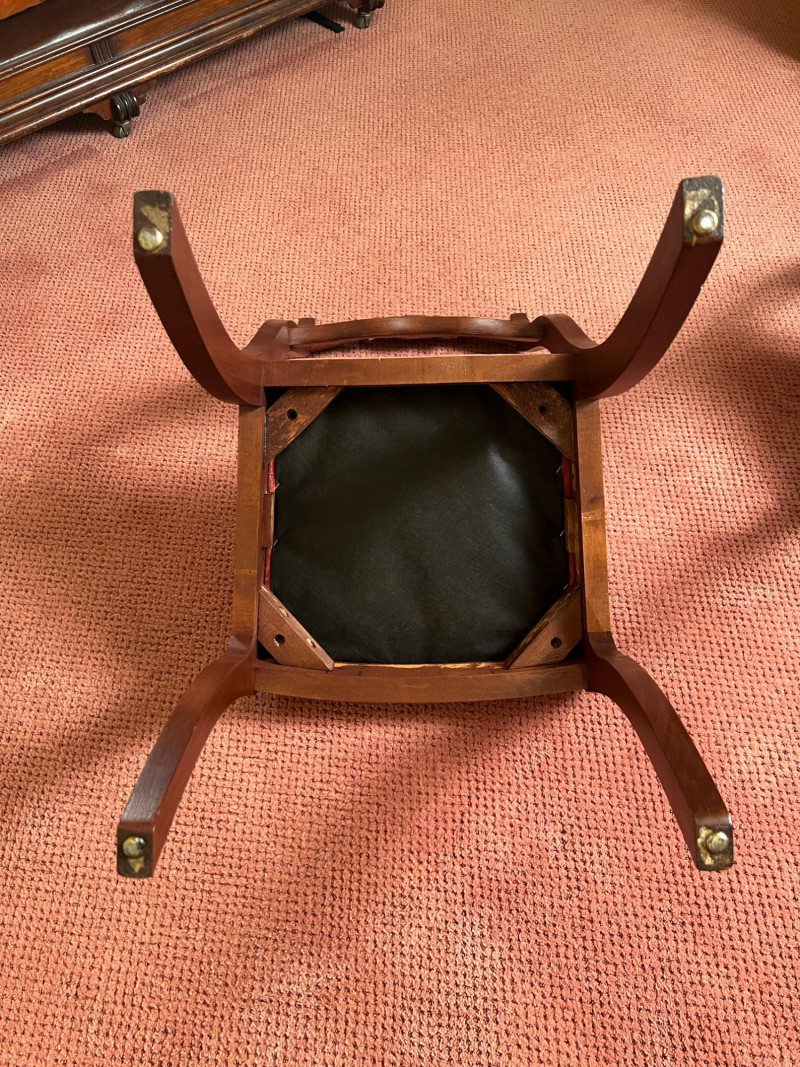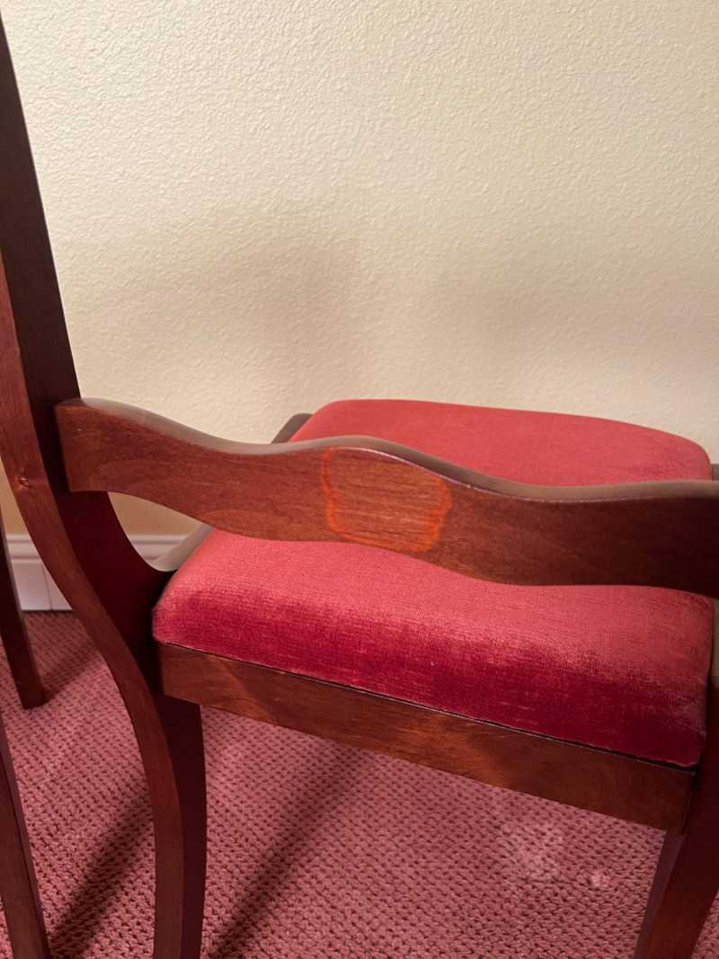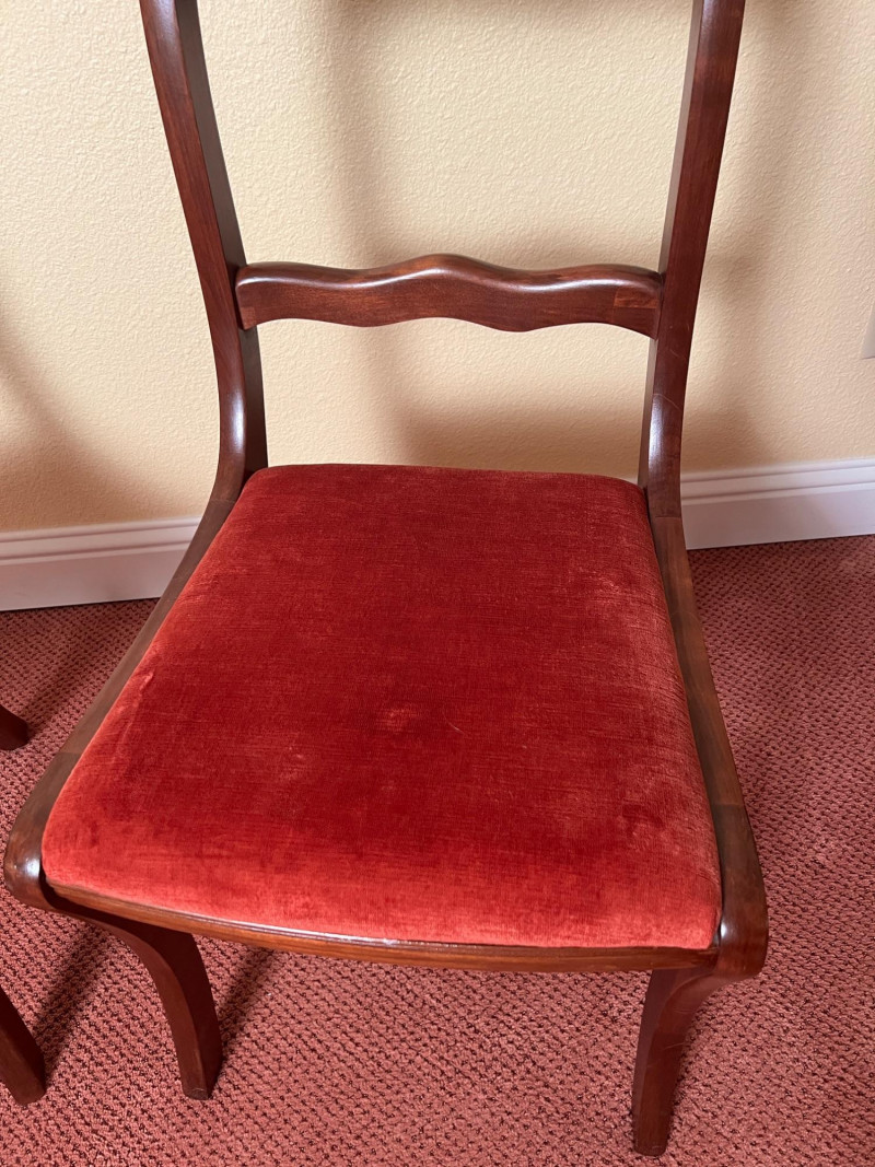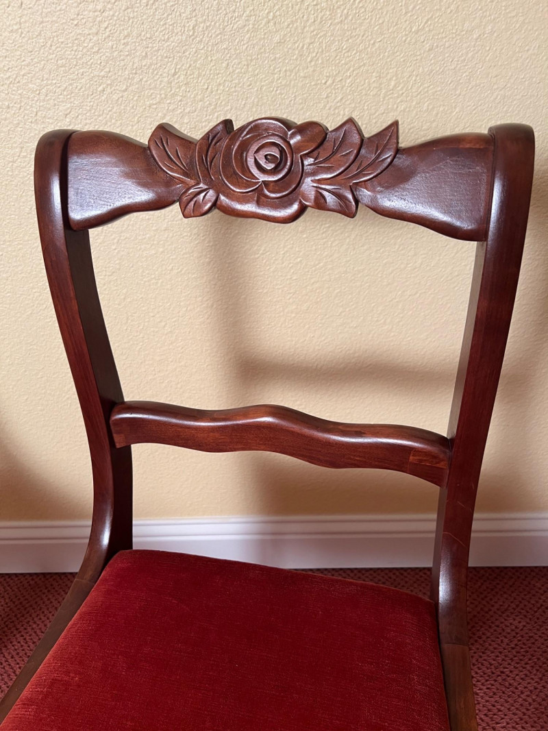 Pair of vintage French Provincial style side chairs featuring carved rose crest rails, curved ladder backs, and elegant cabriole legs. Finished in a warm mahogany tone and upholstered in rich rust-red fabric seats. Classic mid-century revival design inspired by Louis XV furniture, making these suitable for dining, bedroom, or accent seating. Good vintage condition with normal light wear consistent with age. 33.5" OAH, 18" seat height x 17" wide x 16" deep Sold as a pair.
