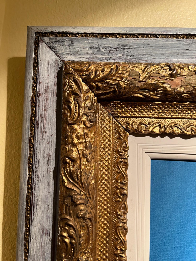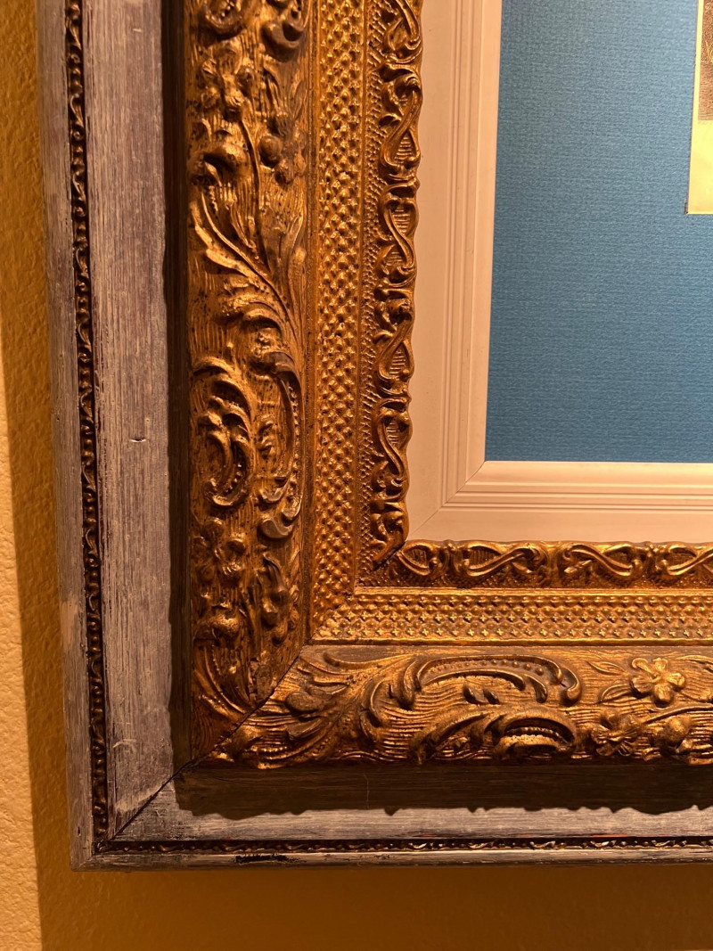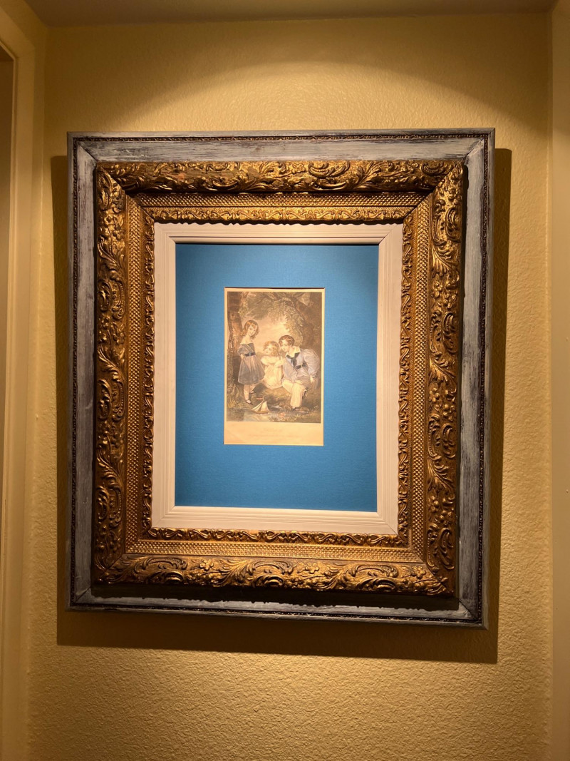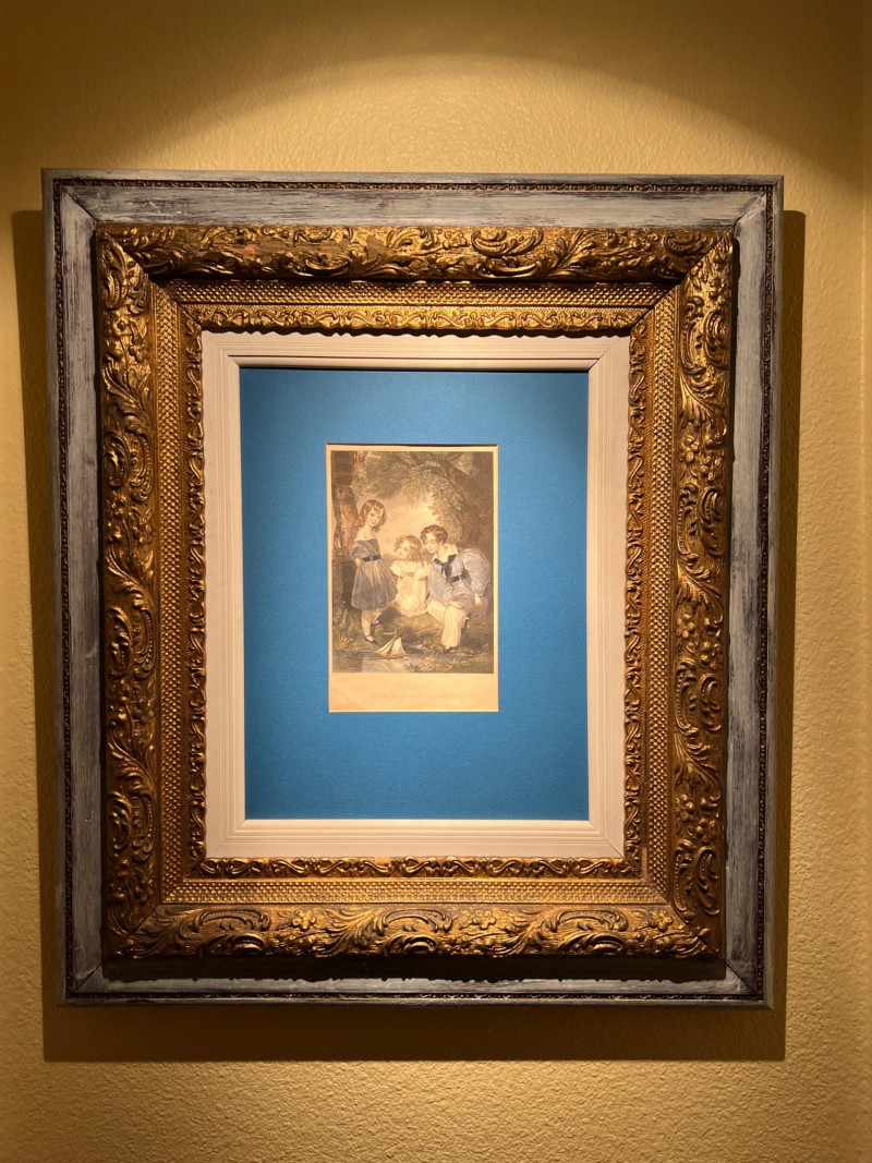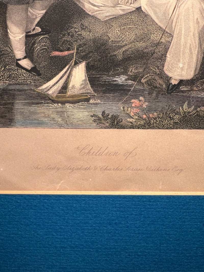 Mid-19th century English hand-colored engraving after F. Corbaux, depicting children in a romantic pastoral setting with fine stipple detail. Elegantly presented in a richly ornamented gilt frame with deep relief carving, adding strong visual presence. Light age toning consistent with period. A timeless Victorian decorative piece that blends softness, narrative charm, and classic wall appeal.