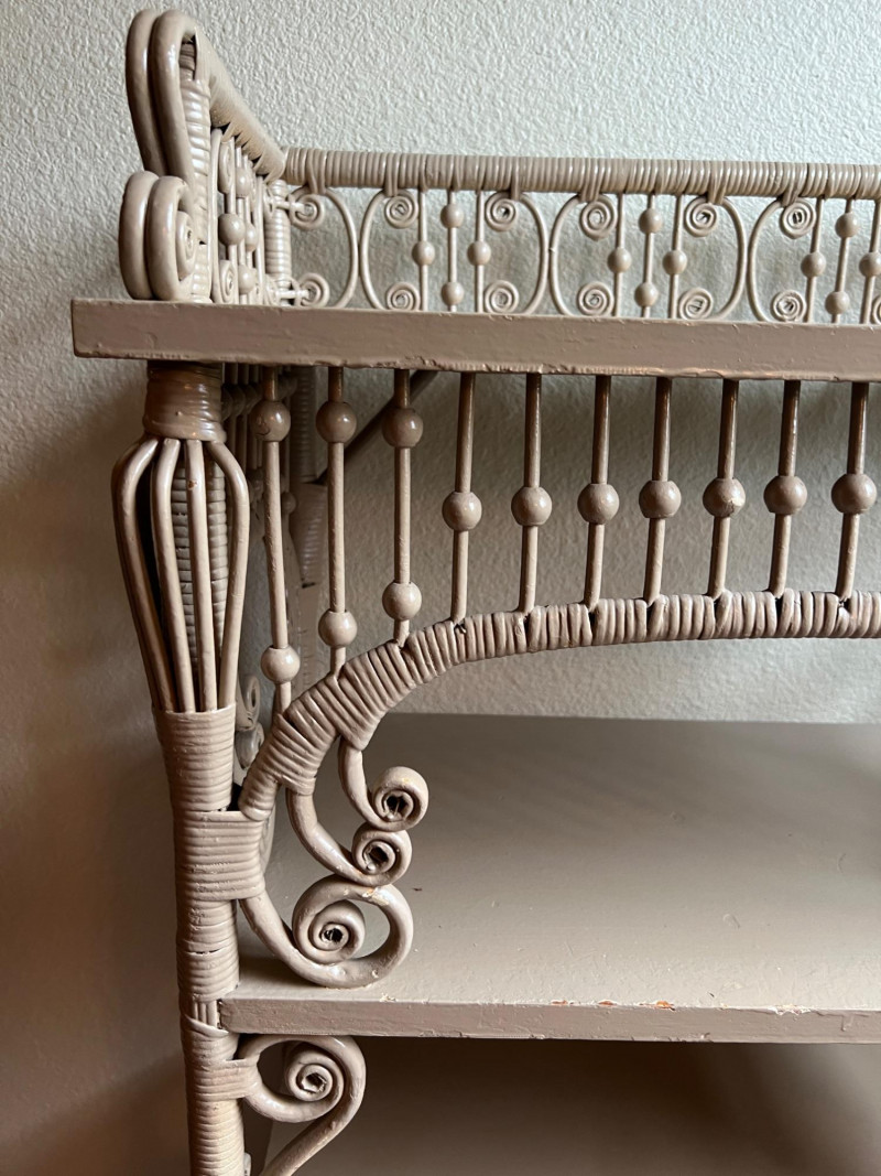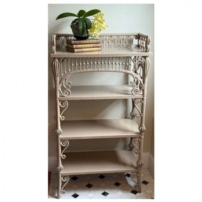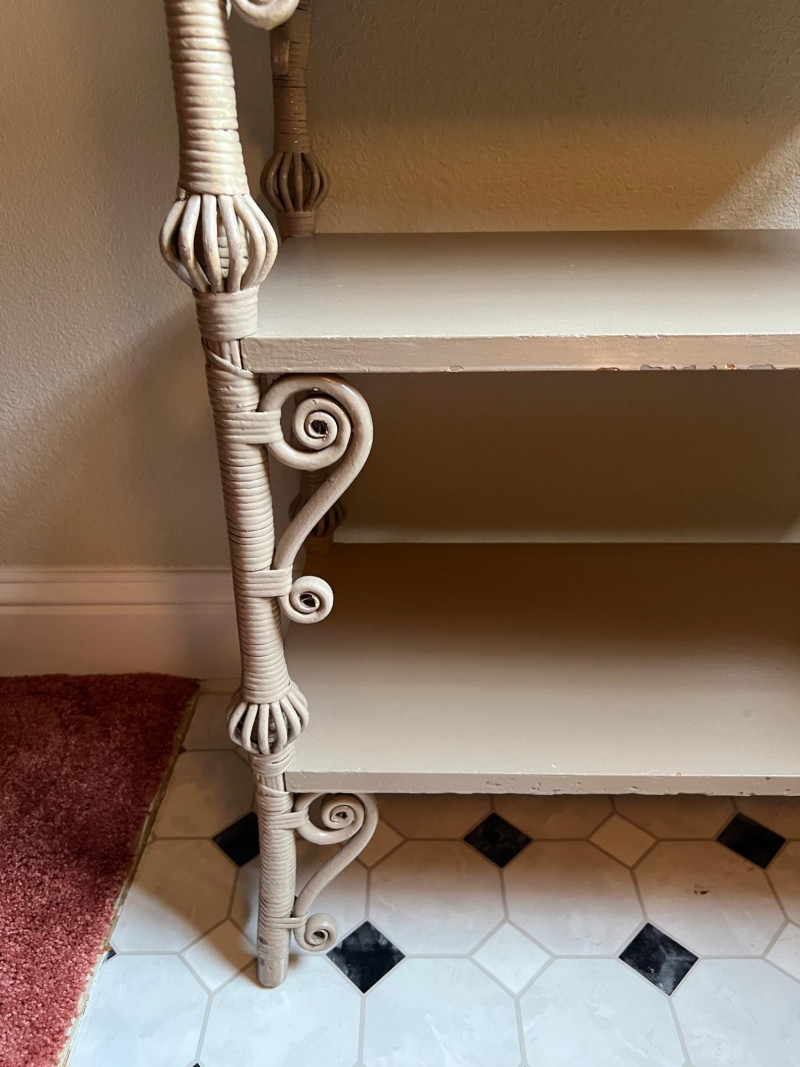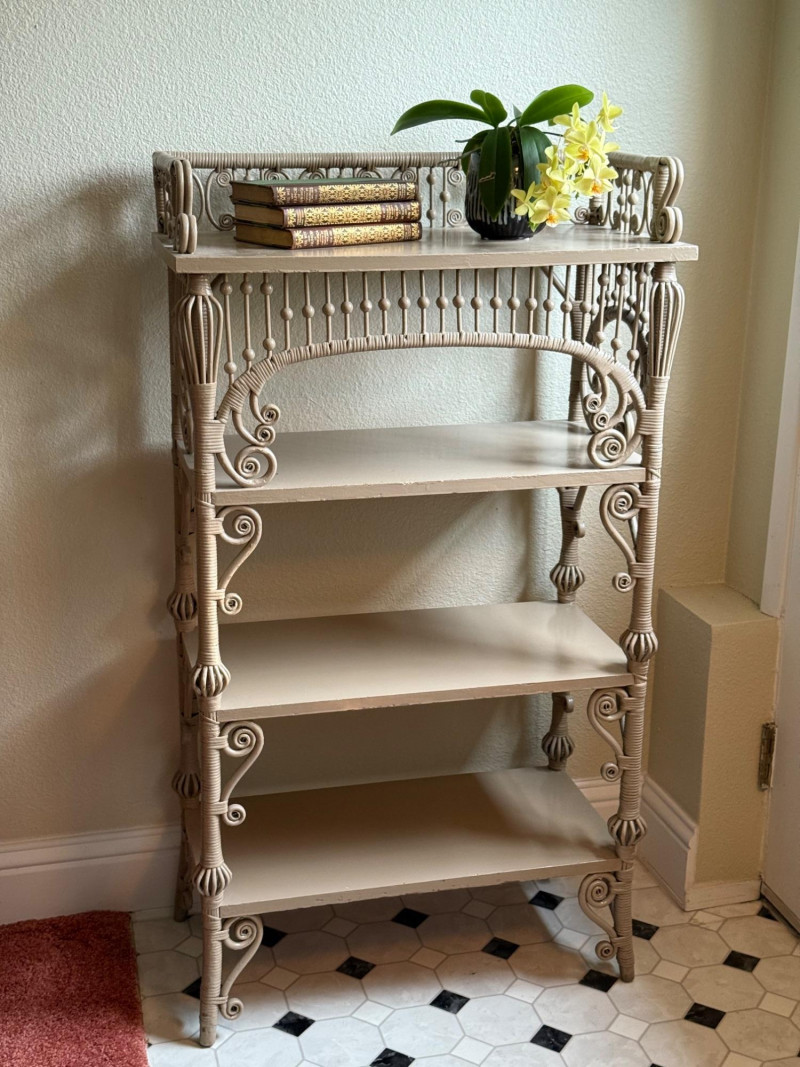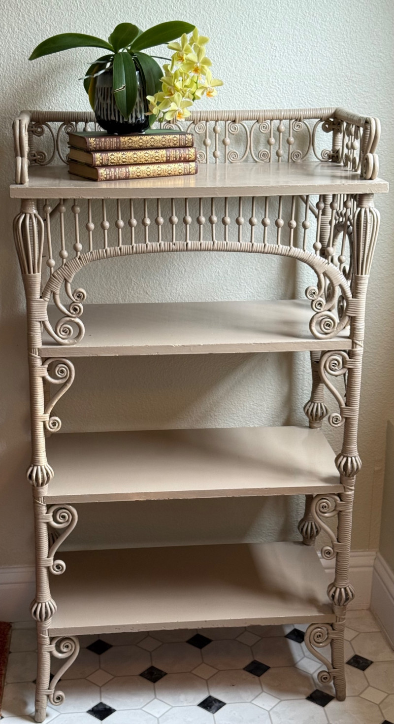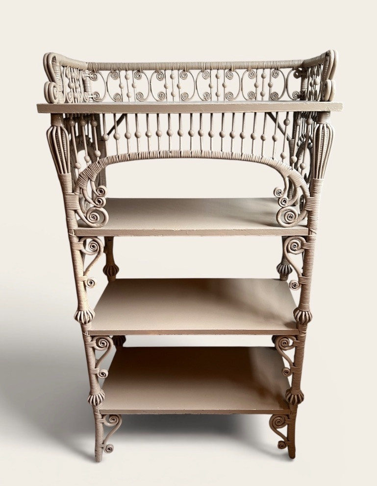 Elegant late 19th century Victorian wicker étagère featuring four graduated display shelves, intricate scrollwork brackets, and finely turned spindle gallery. Constructed with wrapped rattan over a wood frame, retaining a soft painted finish consistent with American wicker production of the period. A highly decorative and functional form, ideal for displaying ceramics, books, or collectibles. The open, airy design and sculptural details make this a standout accent piece in both traditional and modern interiors. Condition consistent with age and use, including minor surface wear to painted finish. Structurally sound and ready for use. Books & plant not included.