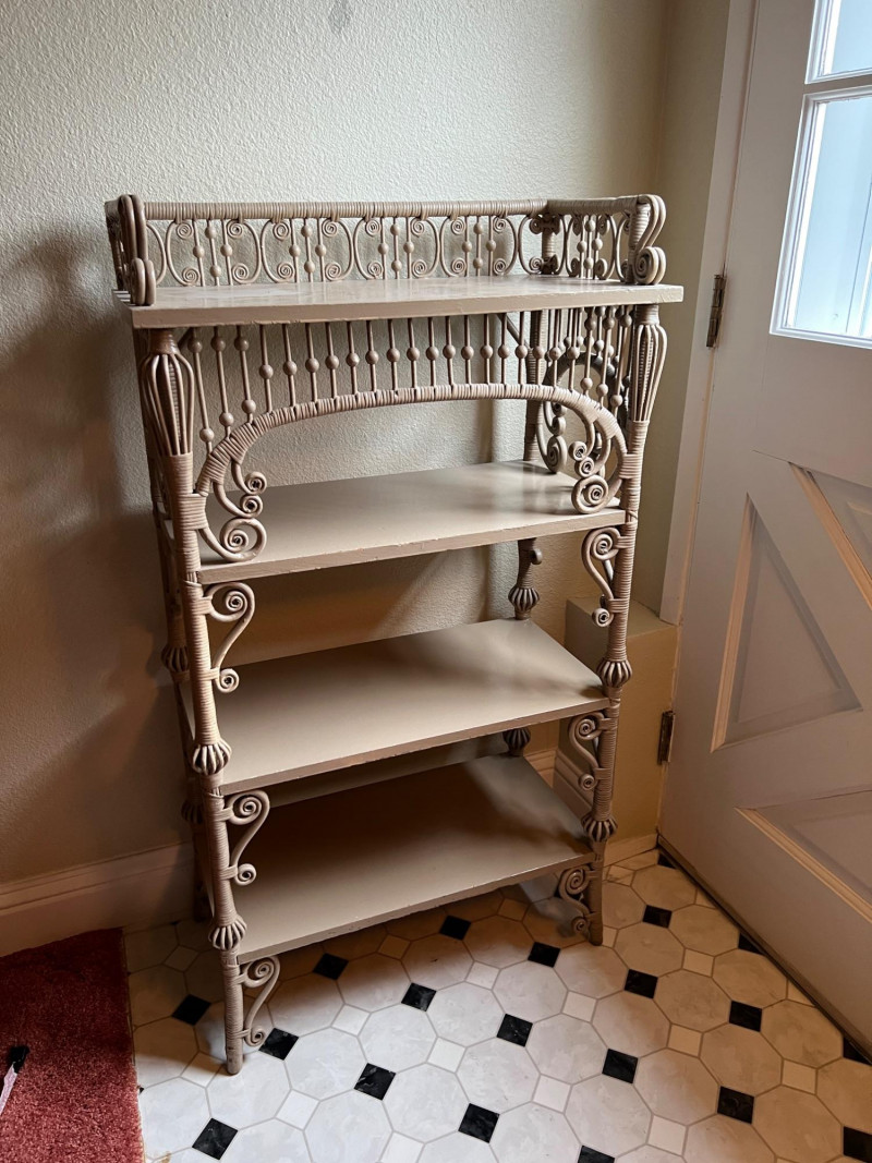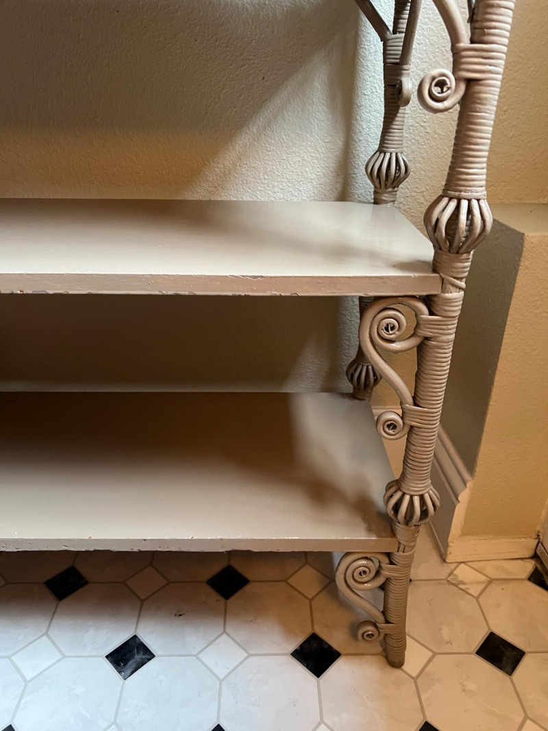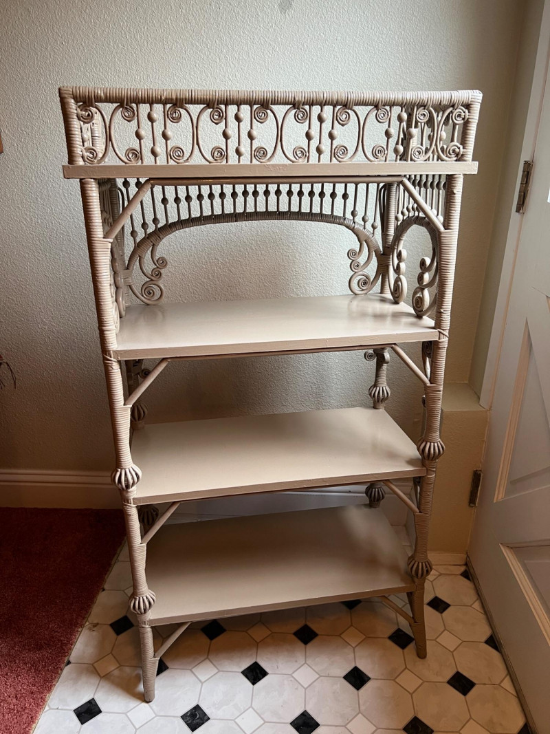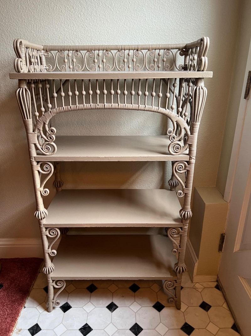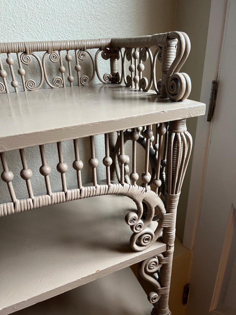 Elegant late 19th century Victorian wicker étagère featuring four graduated display shelves, intricate scrollwork brackets, and finely turned spindle gallery. Constructed with wrapped rattan over a wood frame, retaining a soft painted finish consistent with American wicker production of the period. A highly decorative and functional form, ideal for displaying ceramics, books, or collectibles. The open, airy design and sculptural details make this a standout accent piece in both traditional and modern interiors. Condition consistent with age and use, including minor surface wear to painted finish. Structurally sound and ready for use. Books & plant not included.