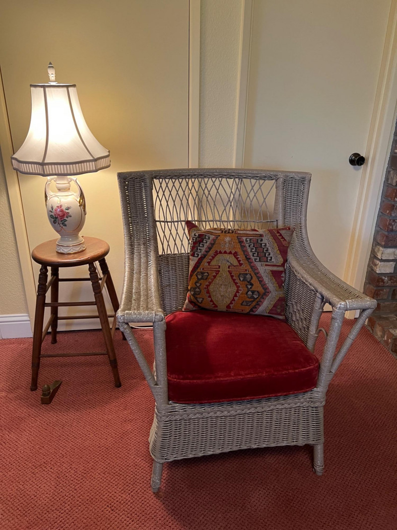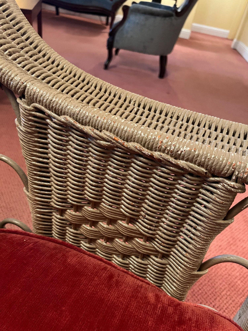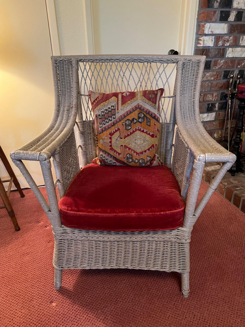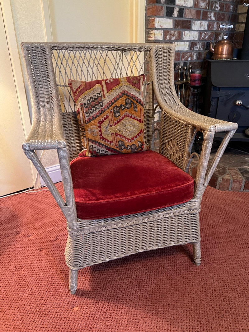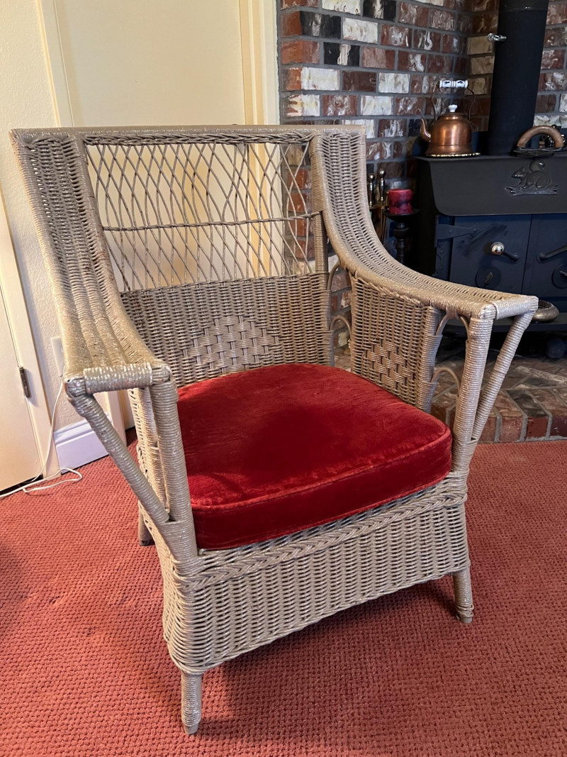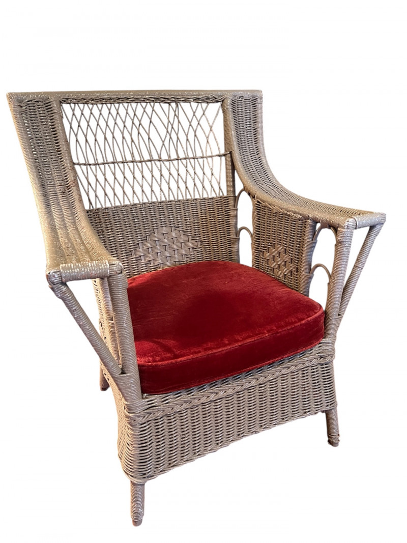 Early 20th century American wicker armchair featuring rolled arms, open lattice back, and decorative woven panels. Painted finish with a warm neutral tone. Includes red upholstered seat cushion and coordinating accent pillow. Chair is sturdy overall; seat support has been modified with a later insert and may benefit from restoration depending on preference. A stylish accent chair ideal for porch, sunroom, or relaxed bohemian interiors. Overall height is 36", seat height with cushion is 17", without cushion 13.5", seat depth is 20".
