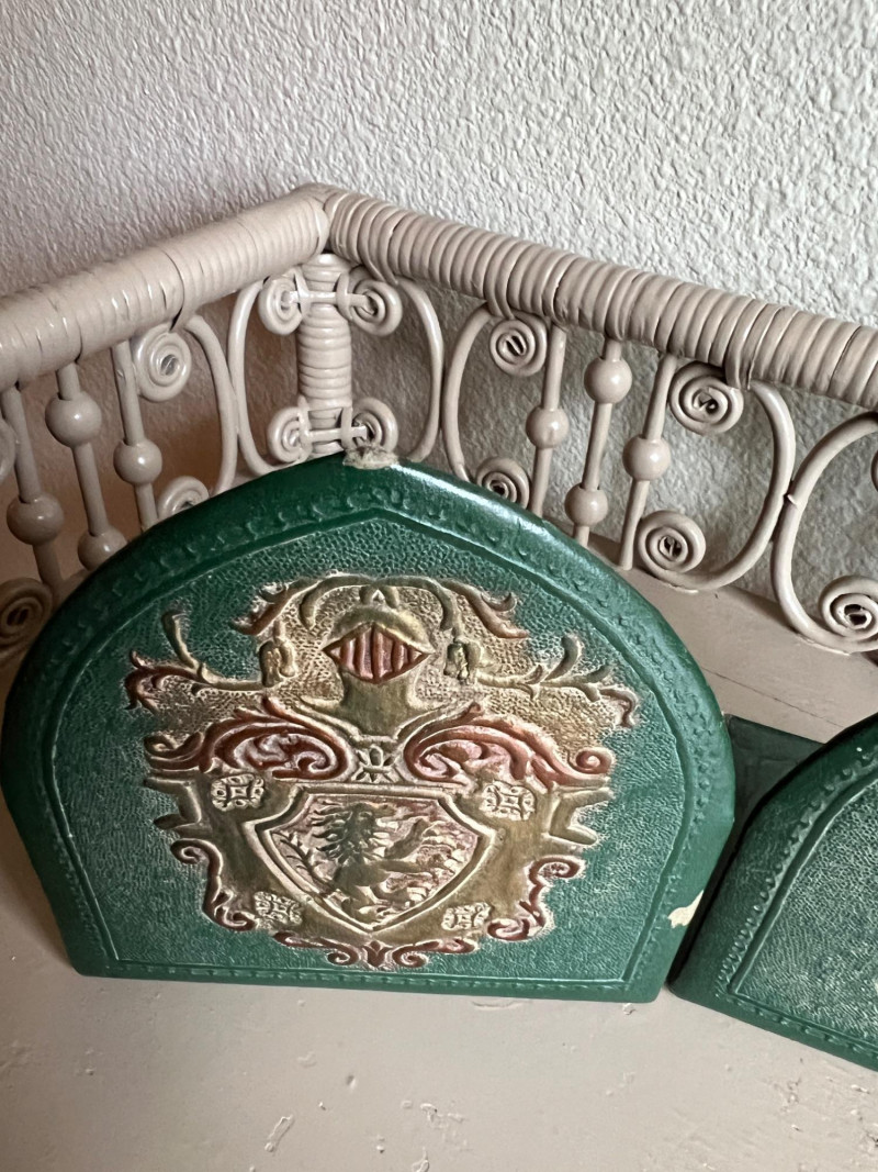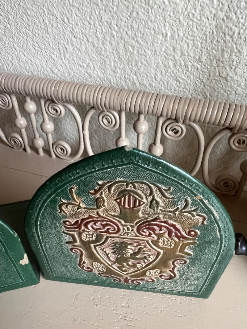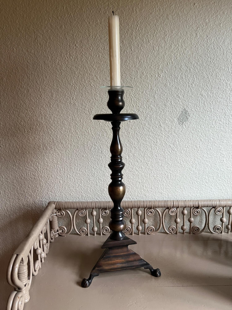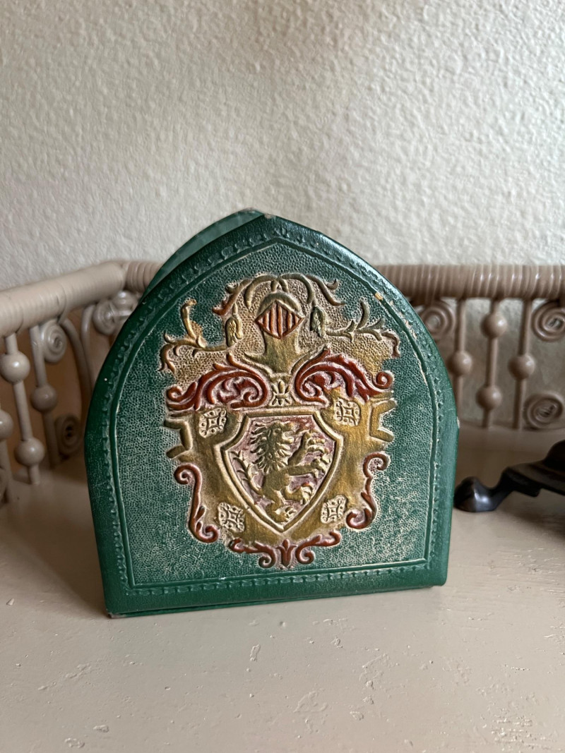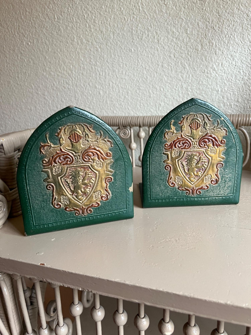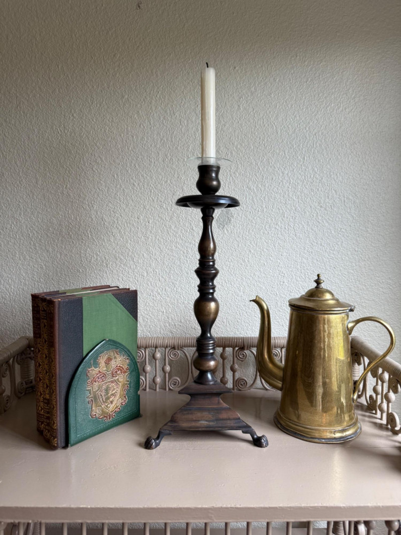 A thoughtfully curated grouping of Old World–inspired decorative pieces, including a tall turned brass candlestick with tripod base, a classic lidded brass coffee pot with elegant curved spout, and a pair of leather-covered bookends with embossed detailing. Together, these elements create a warm and inviting vignette ideal for a study, mantel, or tabletop display. The combination of aged brass and richly toned leather offers depth, texture, and timeless character. All pieces show light, age-appropriate wear consistent with use. Candlestick is 16" tall, coffee pot is 9.75" tall.
