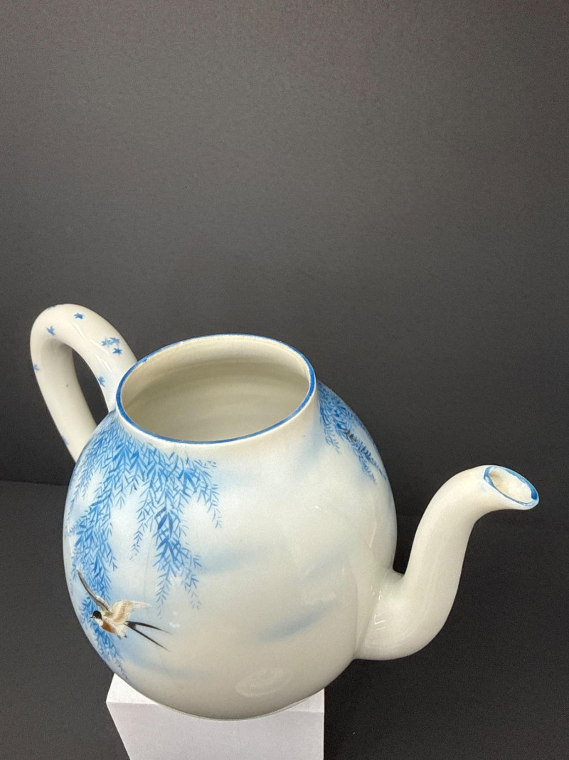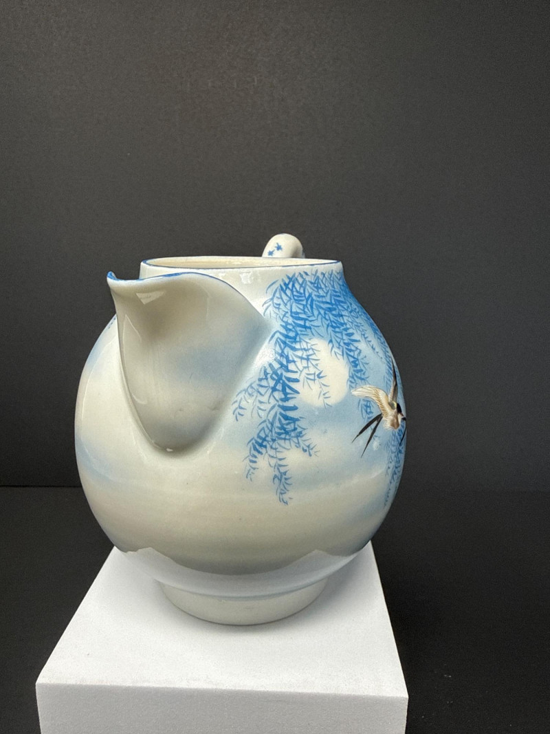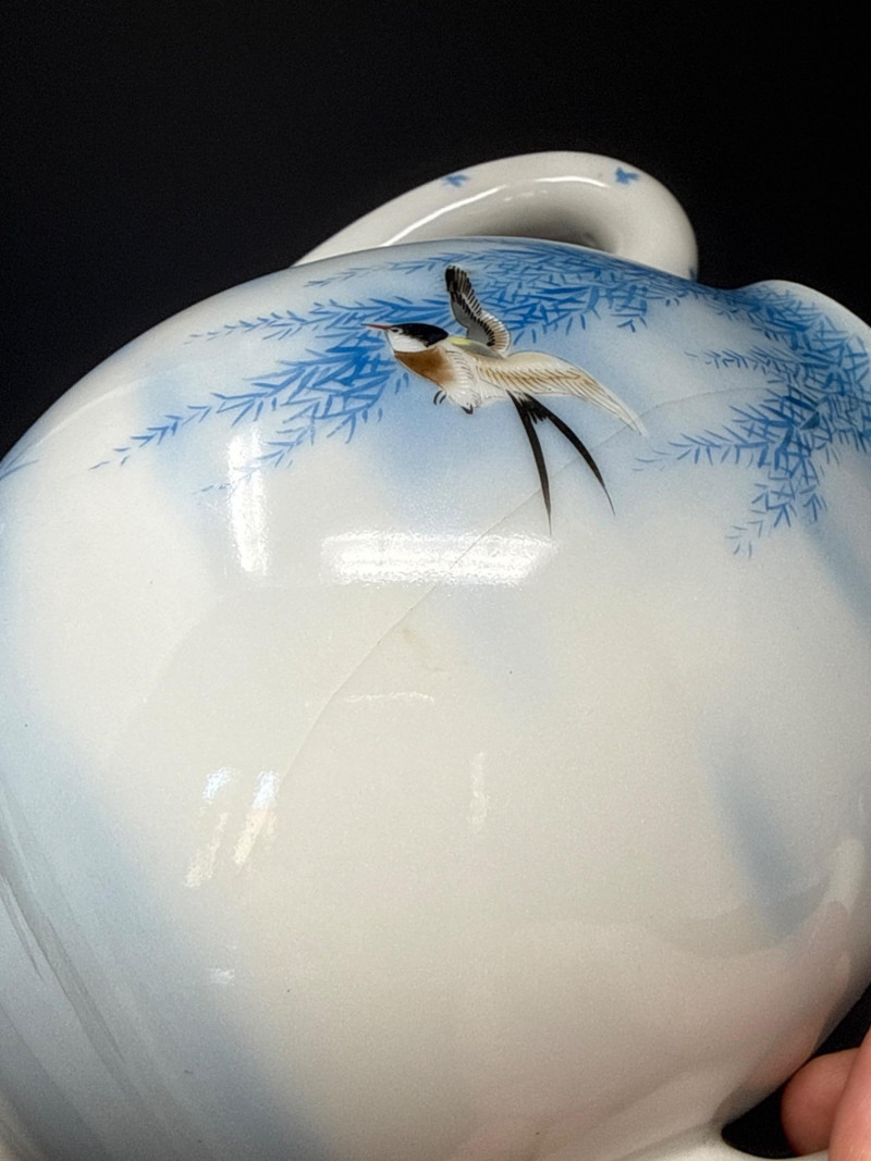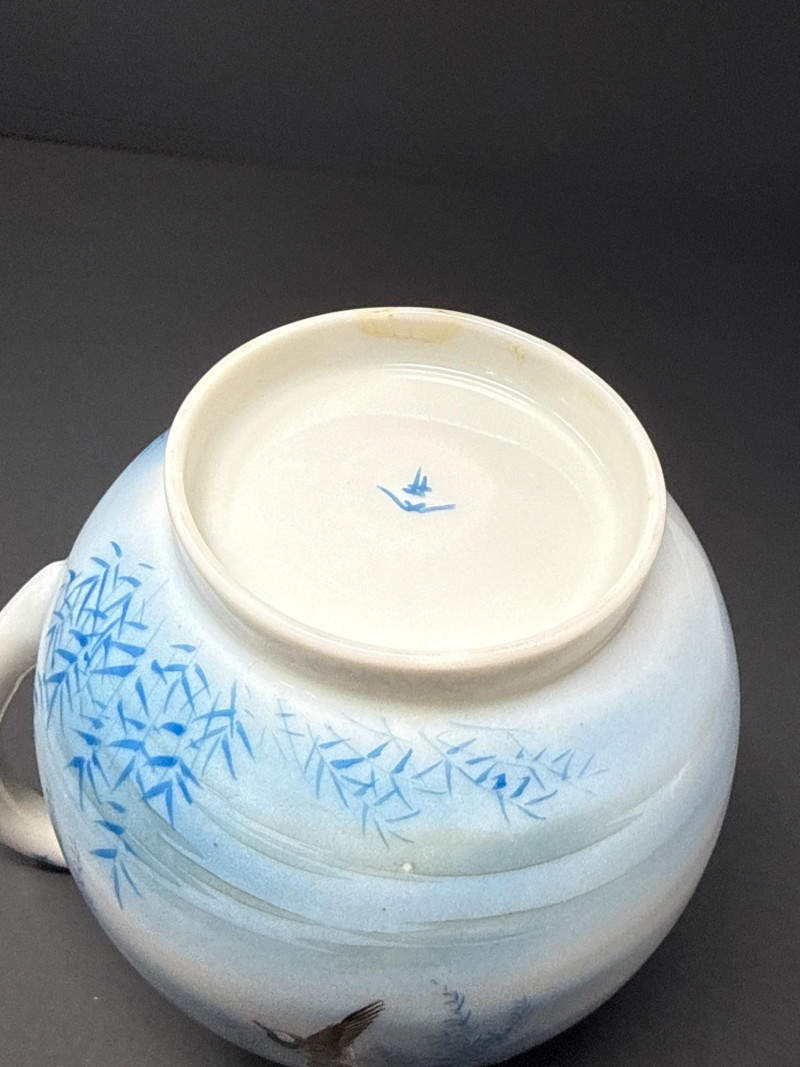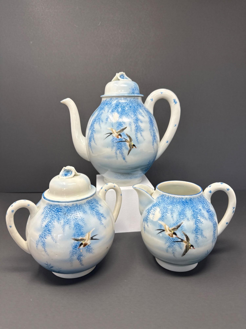 A beautifully coordinated Japanese Kutani porcelain tea service set including a teapot, covered sugar bowl, and creamer, each decorated in a serene blue scenic motif featuring birds in flight beneath a glowing moon with cascading willow branches. Each piece is finely crafted with soft gradient washes and delicate hand-painted detail, characteristic of mid-20th century Kutani export ware. The underside bears traditional Kutani markings, including a red seal and artist signature. This grouping represents a refined and cohesive serving set, ideal for display or use, and pairs with a larger matching service from the same collection. Includes: Condition: Good vintage condition with light, age-appropriate wear. No major chips or cracks observed; minor surface wear consistent with gentle use. Tea Pot- 8.5 T x 9 W (handle to Spout) Creamer- 5 x 5 Sugar- 6.5 W x 6 T