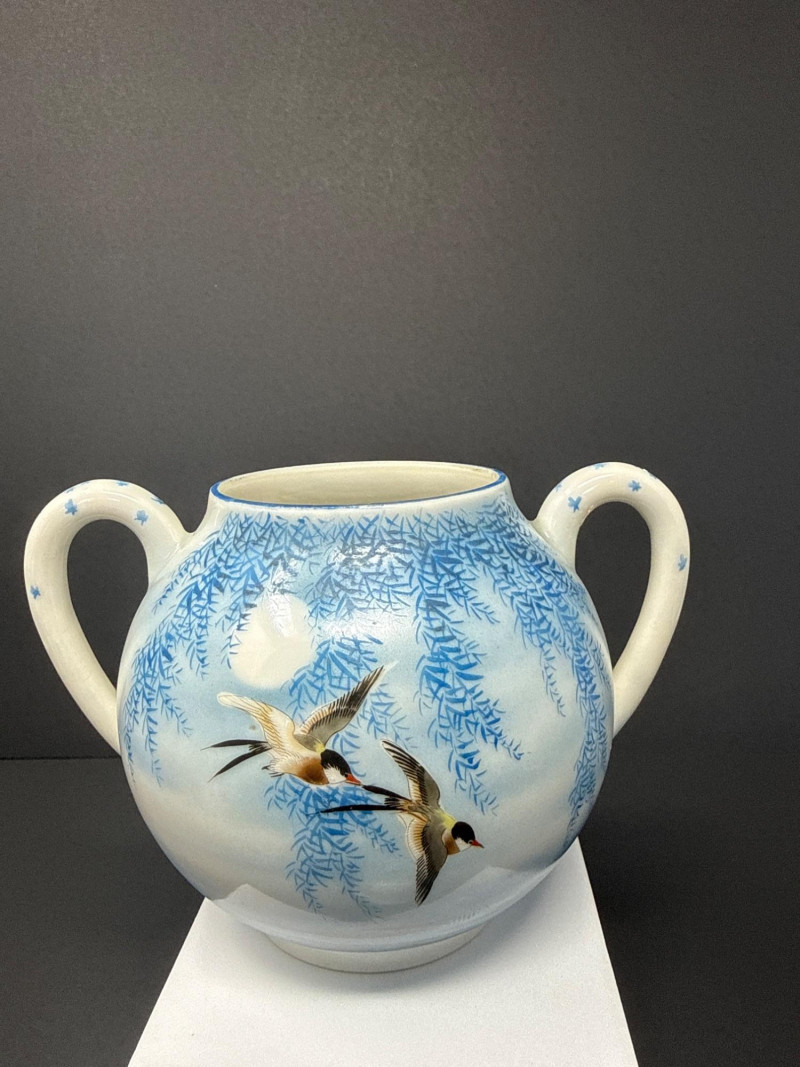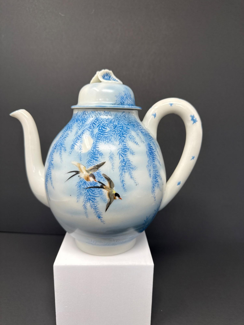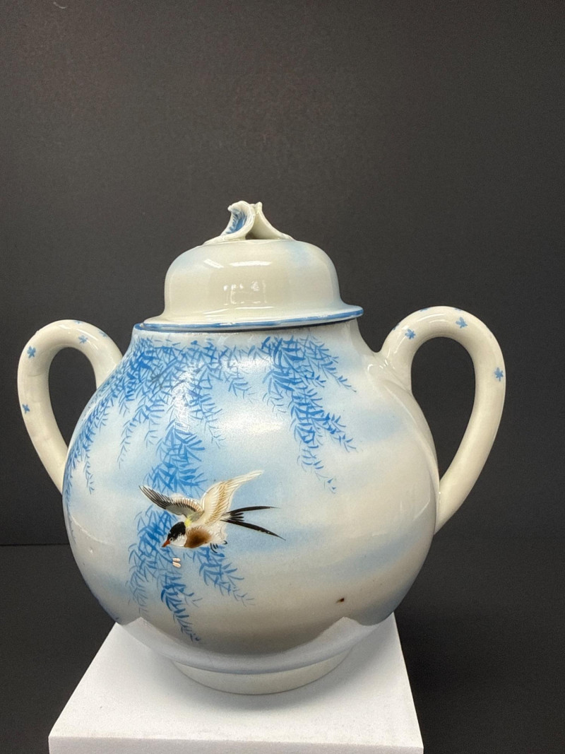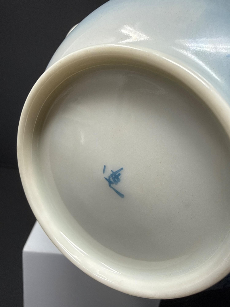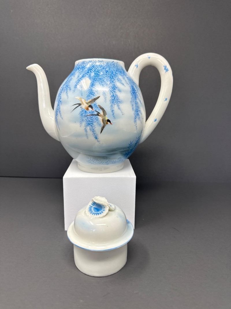 A beautifully coordinated Japanese Kutani porcelain tea service set including a teapot, covered sugar bowl, and creamer, each decorated in a serene blue scenic motif featuring birds in flight beneath a glowing moon with cascading willow branches. Each piece is finely crafted with soft gradient washes and delicate hand-painted detail, characteristic of mid-20th century Kutani export ware. The underside bears traditional Kutani markings, including a red seal and artist signature. This grouping represents a refined and cohesive serving set, ideal for display or use, and pairs with a larger matching service from the same collection. Includes: Condition: Good vintage condition with light, age-appropriate wear. No major chips or cracks observed; minor surface wear consistent with gentle use. Tea Pot- 8.5 T x 9 W (handle to Spout) Creamer- 5 x 5 Sugar- 6.5 W x 6 T