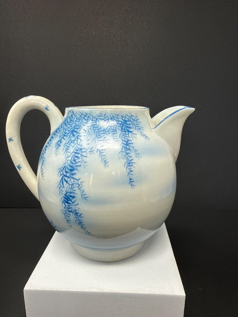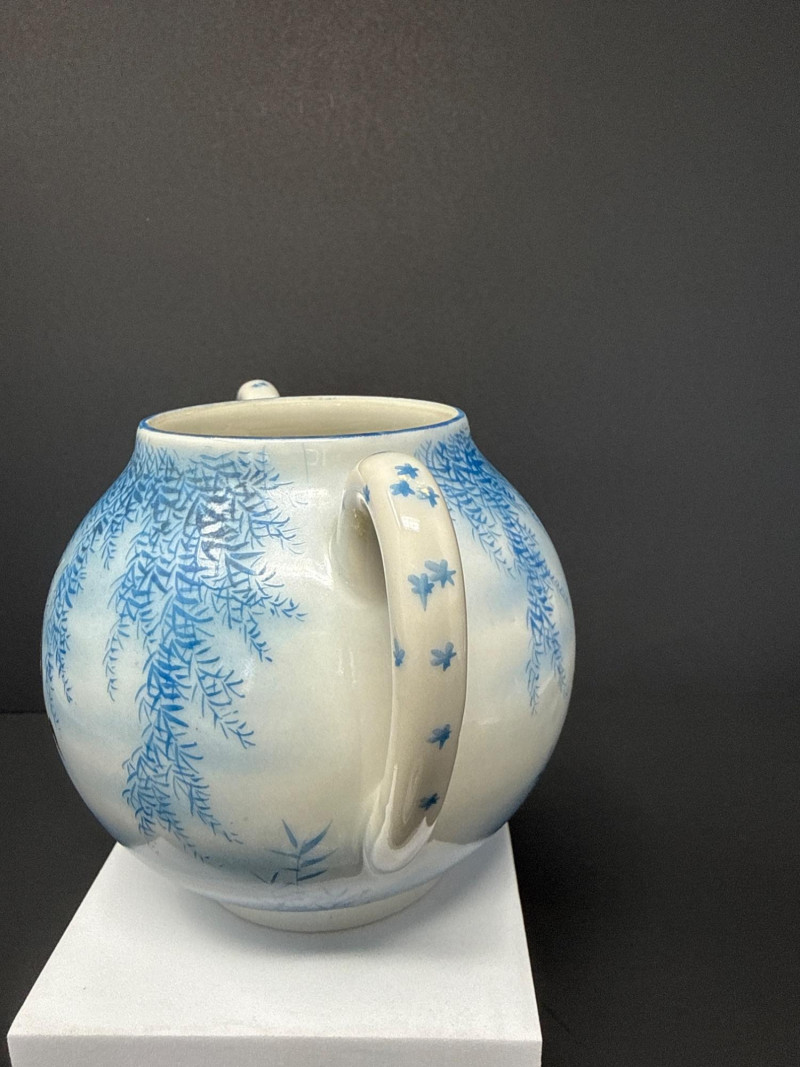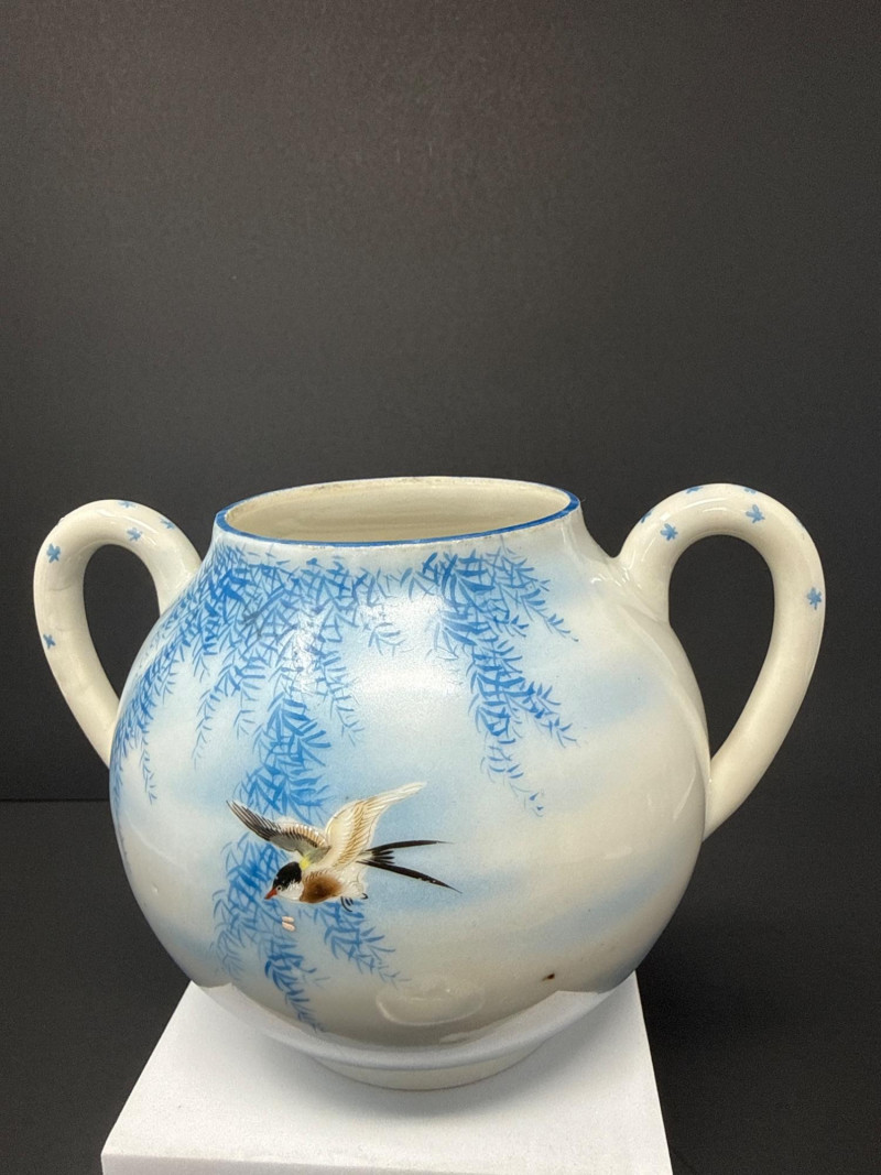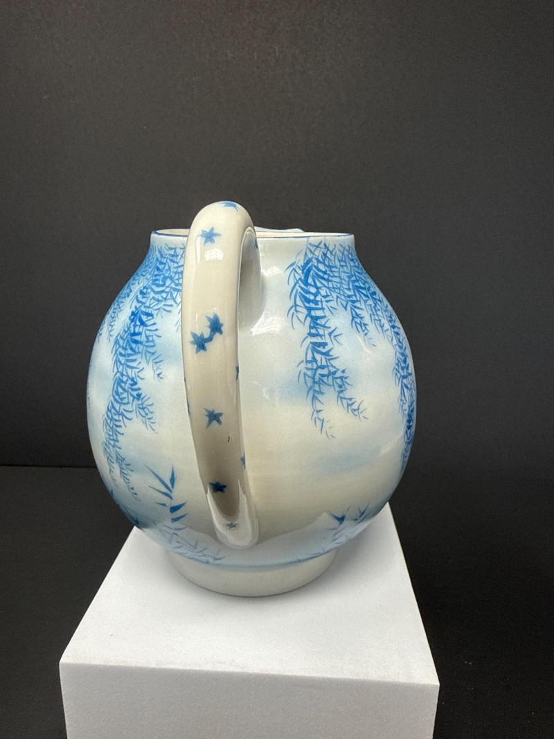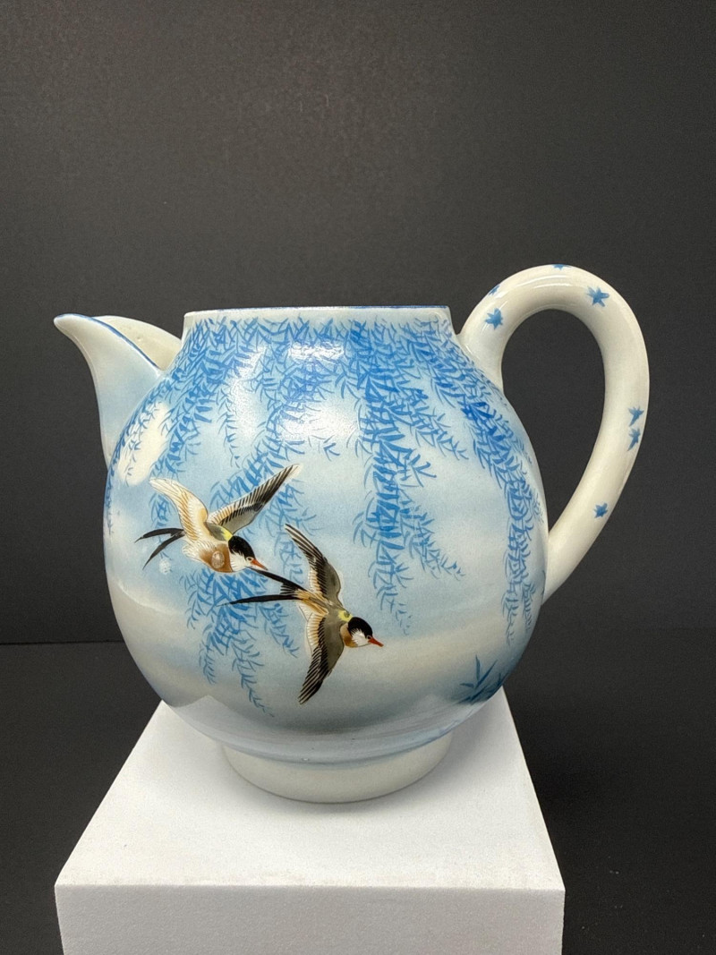 A beautifully coordinated Japanese Kutani porcelain tea service set including a teapot, covered sugar bowl, and creamer, each decorated in a serene blue scenic motif featuring birds in flight beneath a glowing moon with cascading willow branches. Each piece is finely crafted with soft gradient washes and delicate hand-painted detail, characteristic of mid-20th century Kutani export ware. The underside bears traditional Kutani markings, including a red seal and artist signature. This grouping represents a refined and cohesive serving set, ideal for display or use, and pairs with a larger matching service from the same collection. Includes: Condition: Good vintage condition with light, age-appropriate wear. No major chips or cracks observed; minor surface wear consistent with gentle use. Tea Pot- 8.5 T x 9 W (handle to Spout) Creamer- 5 x 5 Sugar- 6.5 W x 6 T
