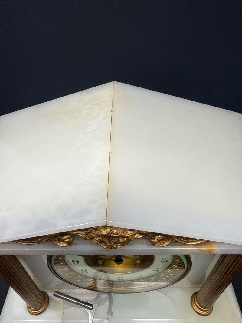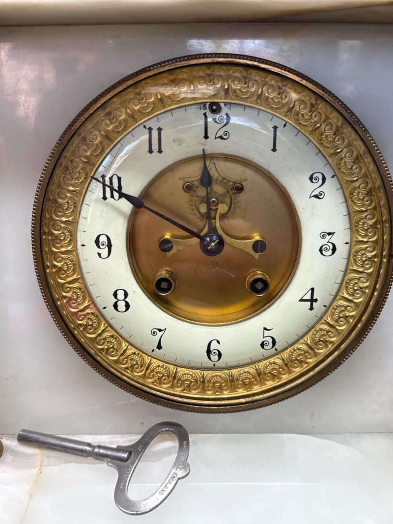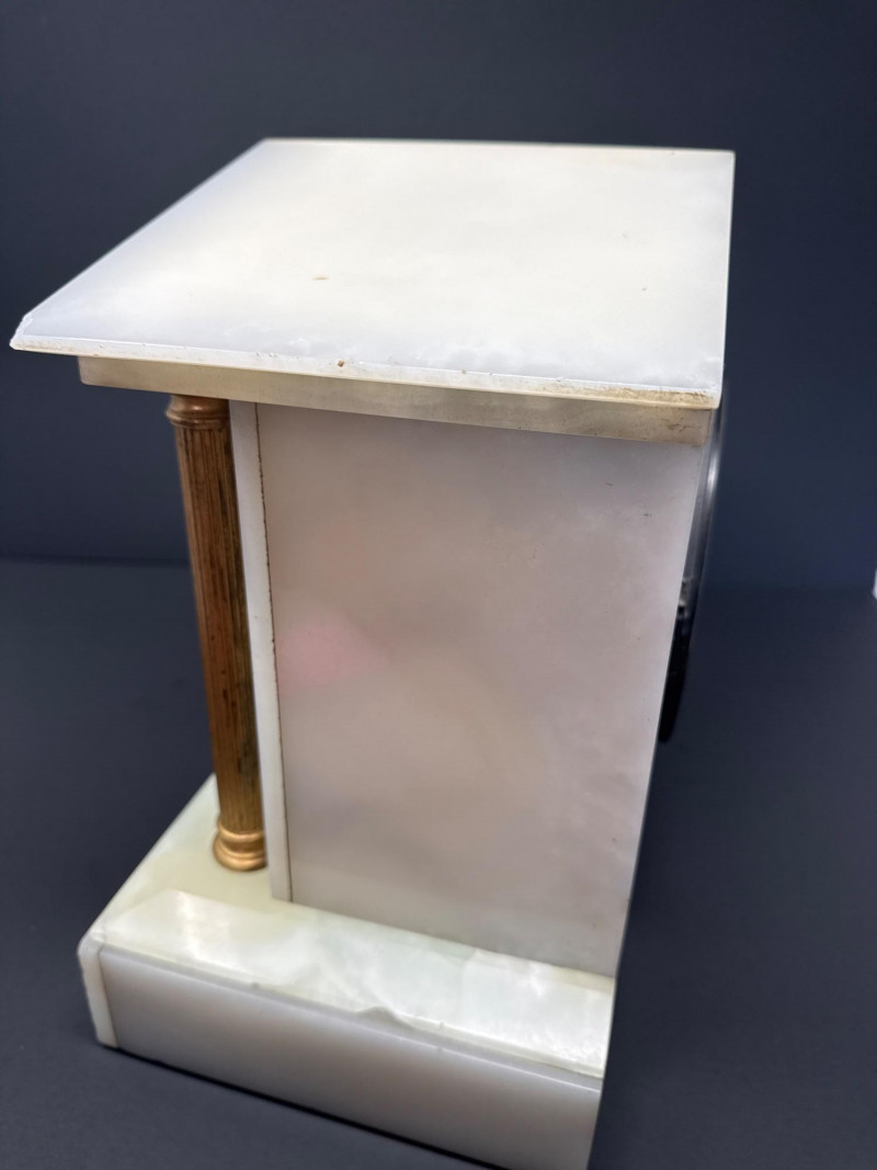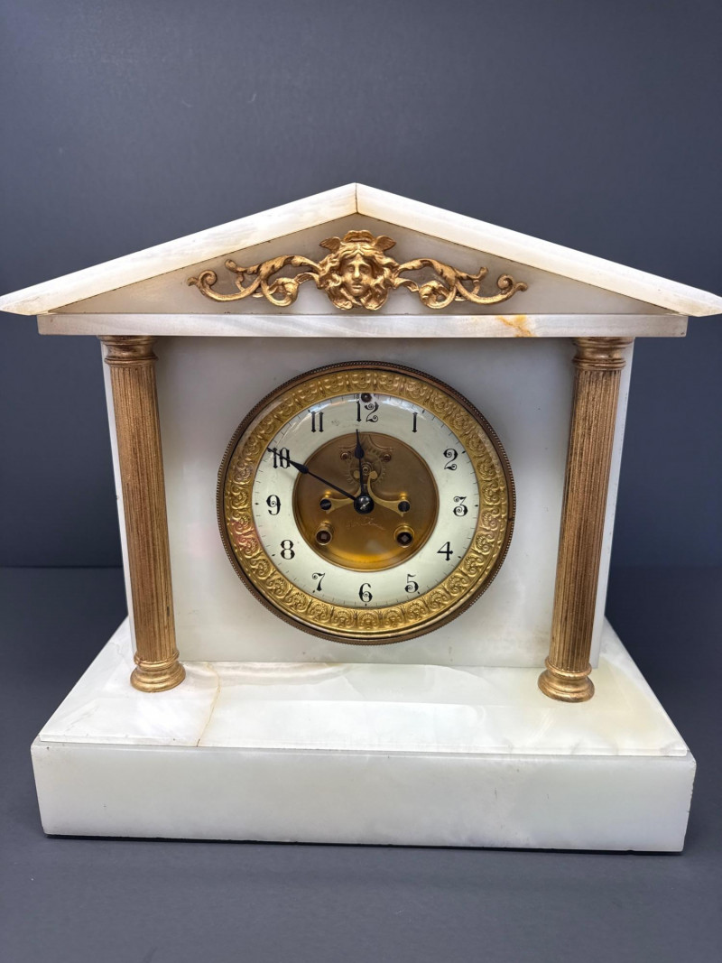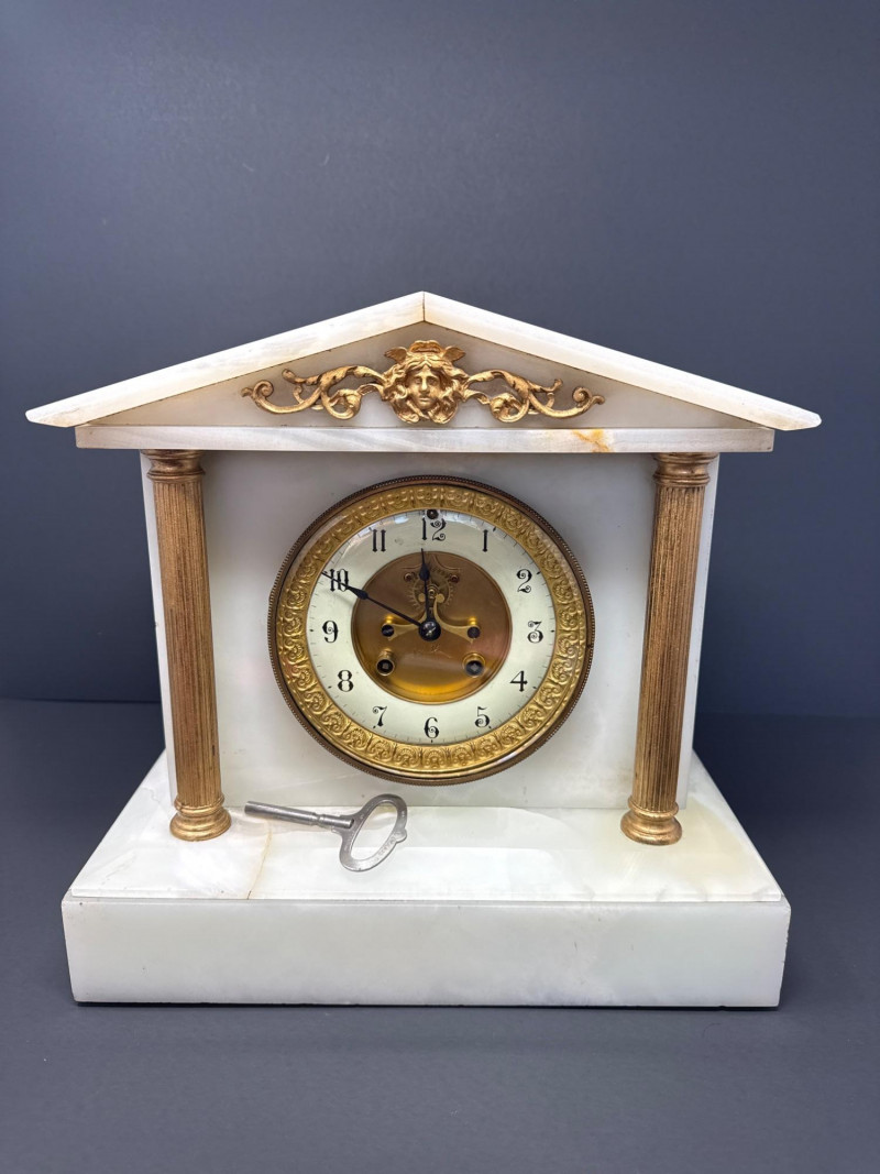 Elegant antique French mantel clock crafted in white marble and embellished with ornate gilt bronze (ormolu) mounts. Designed in the form of a classical temple, the clock features a triangular pediment with decorative gilt motifs, supported by two fluted gilt columns framing the circular dial. The enamel dial displays black Arabic numerals with gilt detailing around the bezel, and the clock retains its original winding key, shown with the piece. The combination of marble architecture and finely cast gilt bronze elements reflects the refined neoclassical taste popular in 19th‑century French decorative arts.