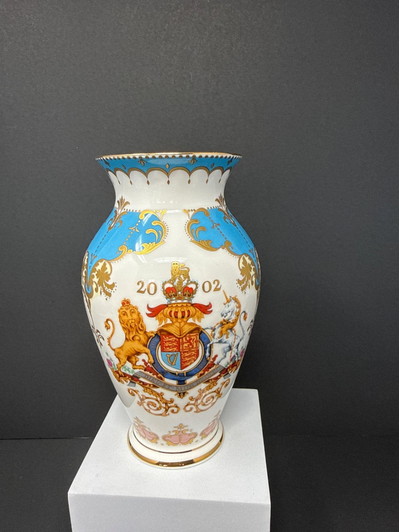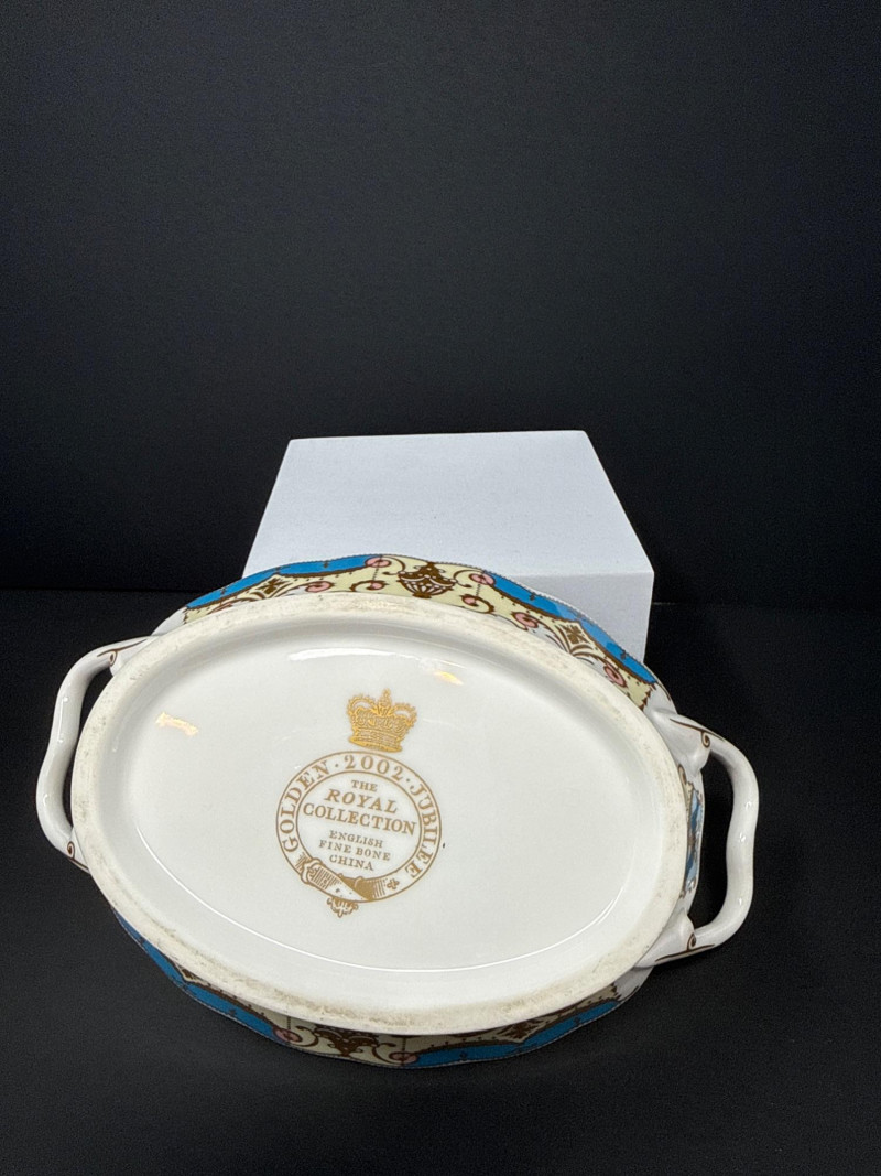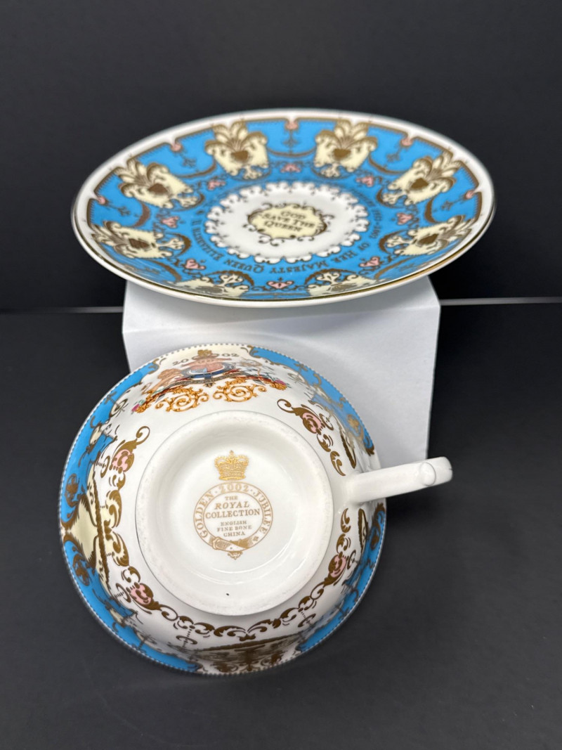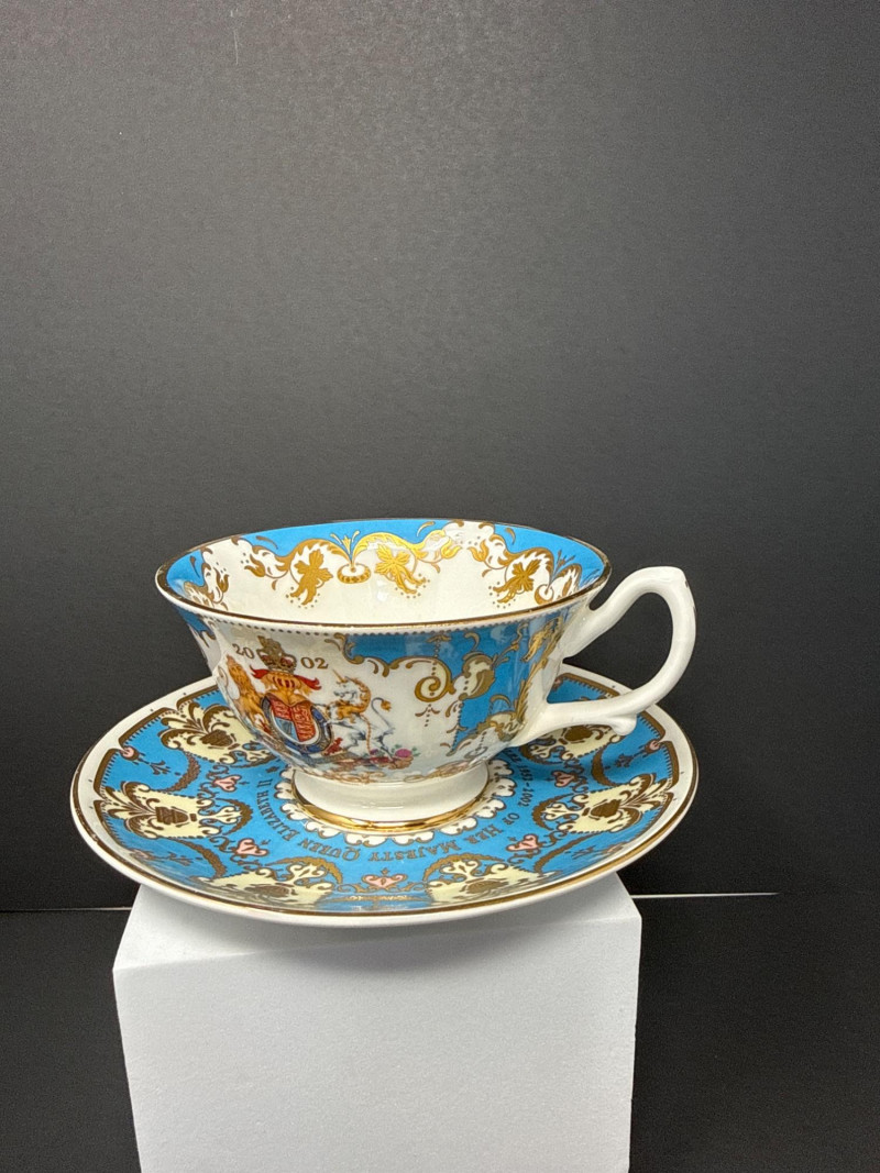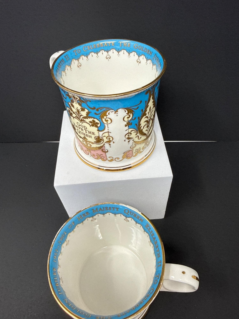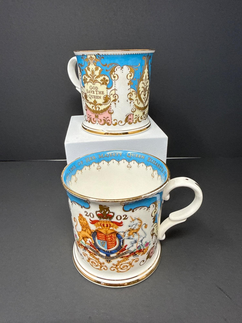 Elegant grouping of Royal Collection English fine bone china, each piece richly decorated in the signature royal palette of cobalt blue, blush pink, and raised gilt detailing. The set features royal crests, floral garlands, and commemorative motifs, including pieces marking the year 2002 and inscriptions such as “God Save the Queen.” The assortment includes a vase, two handled mugs, a teacup with matching saucer, and a small handled bowl, all executed with the refined craftsmanship and opulent gilding characteristic of official Royal Collection releases. Vase- 6.5 T x 3.5 W Dish- 7.5 W x 4.5 x 2” T Two 3” Cups One Tea Cup and Saucer
