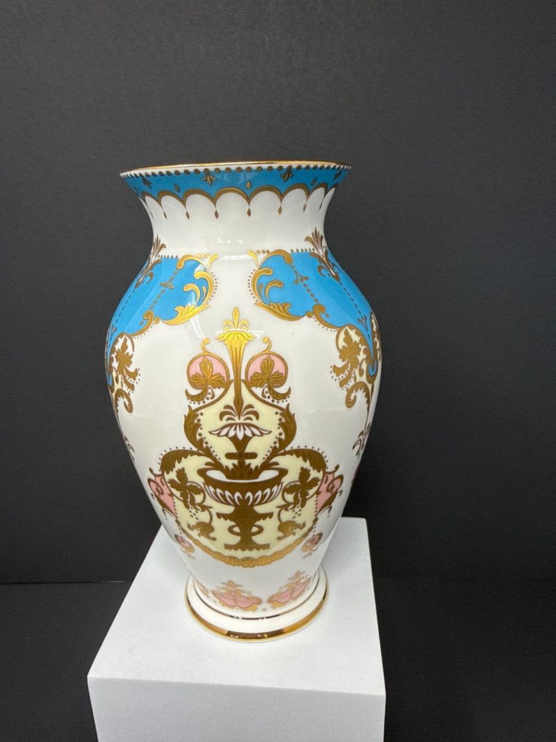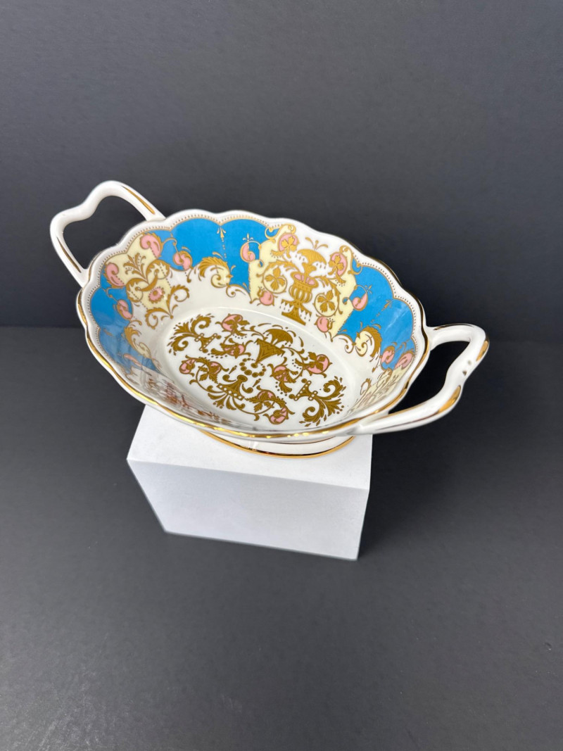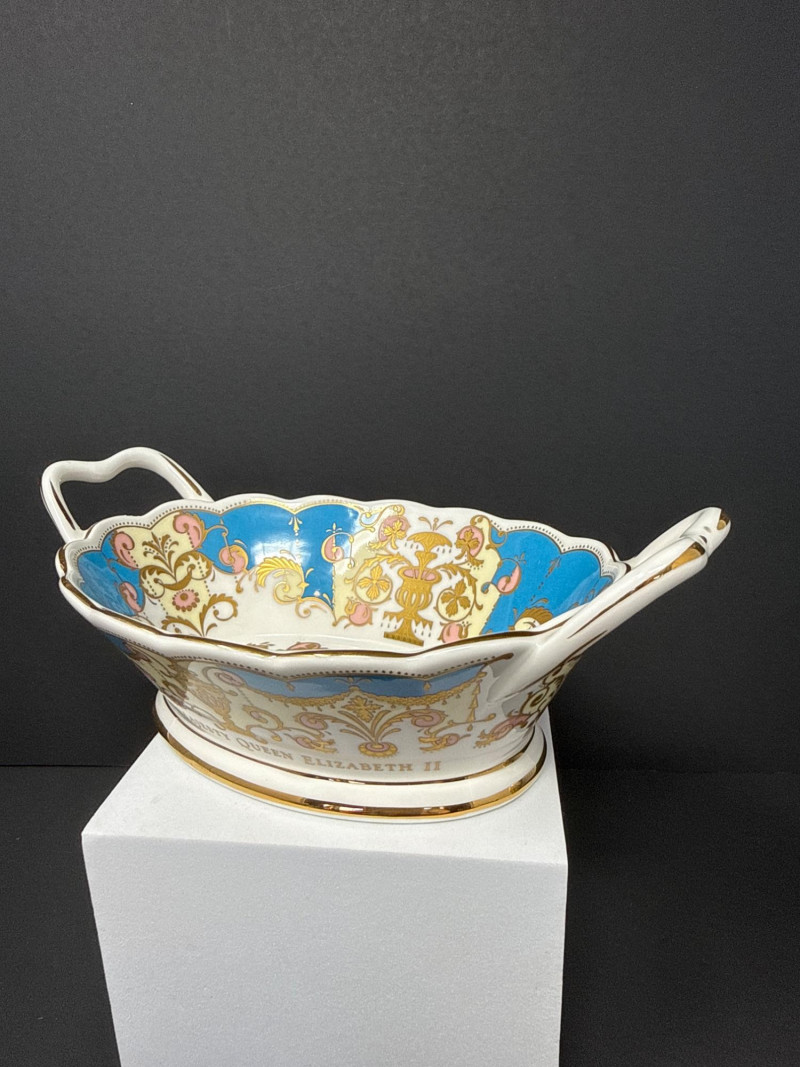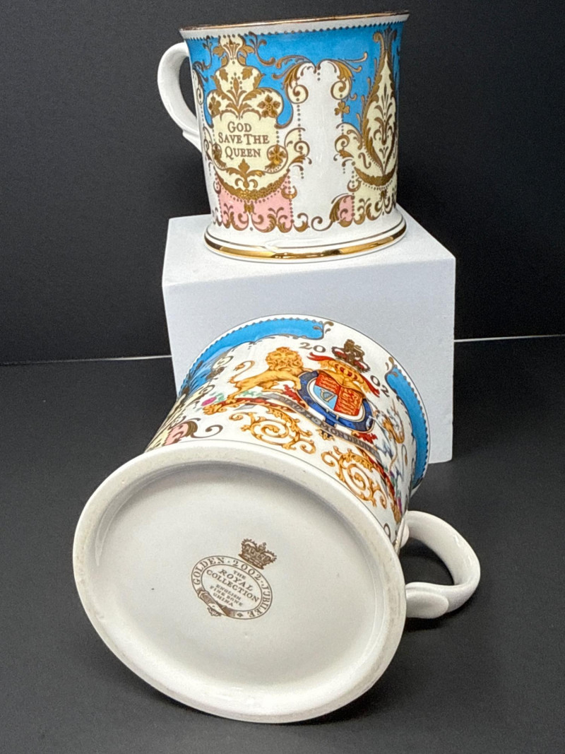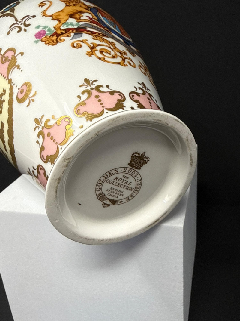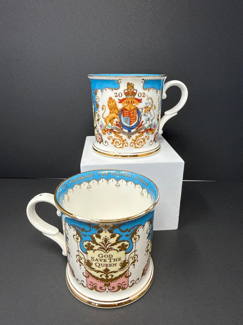 Elegant grouping of Royal Collection English fine bone china, each piece richly decorated in the signature royal palette of cobalt blue, blush pink, and raised gilt detailing. The set features royal crests, floral garlands, and commemorative motifs, including pieces marking the year 2002 and inscriptions such as “God Save the Queen.” The assortment includes a vase, two handled mugs, a teacup with matching saucer, and a small handled bowl, all executed with the refined craftsmanship and opulent gilding characteristic of official Royal Collection releases. Vase- 6.5 T x 3.5 W Dish- 7.5 W x 4.5 x 2” T Two 3” Cups One Tea Cup and Saucer