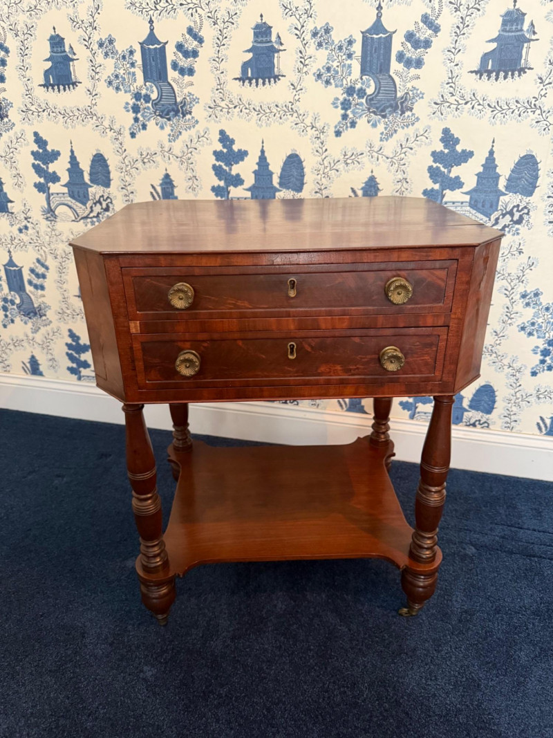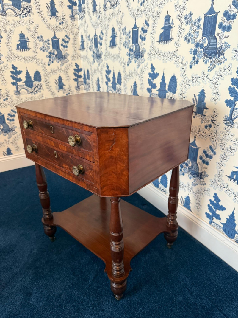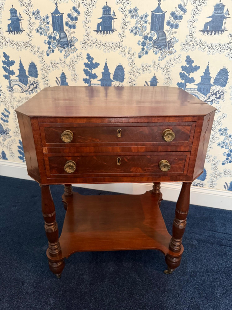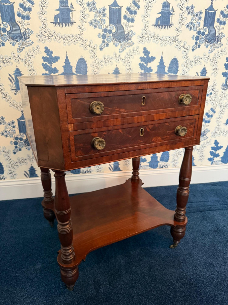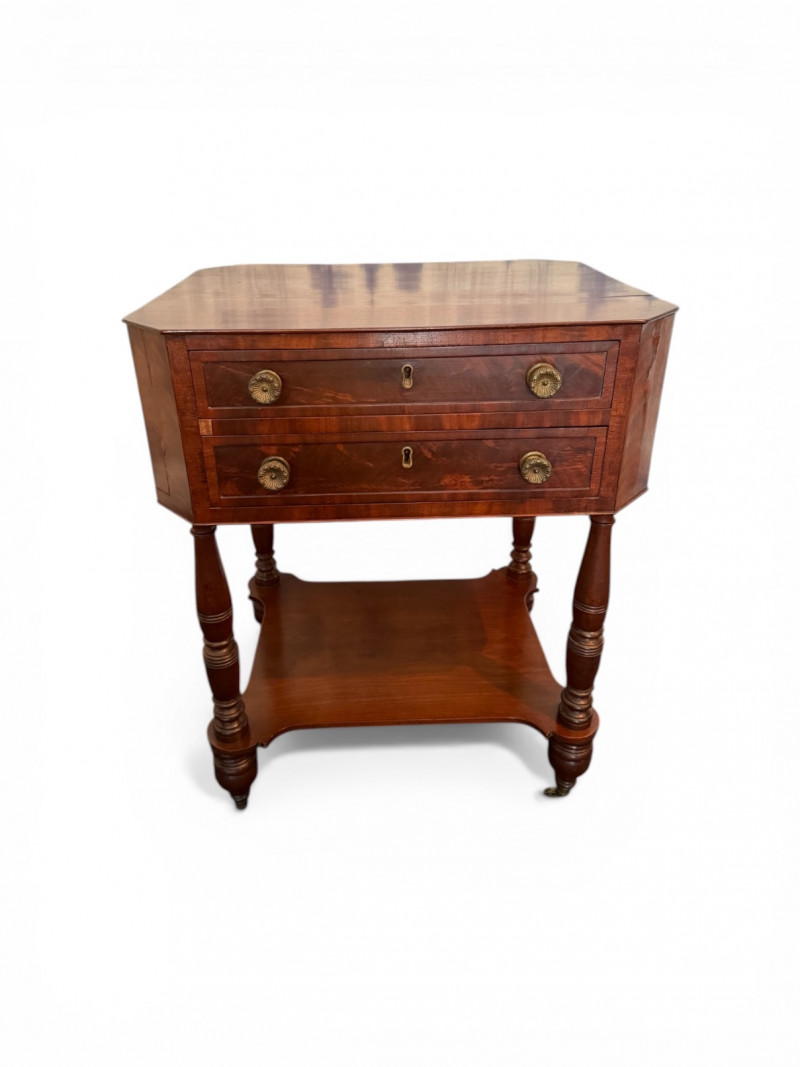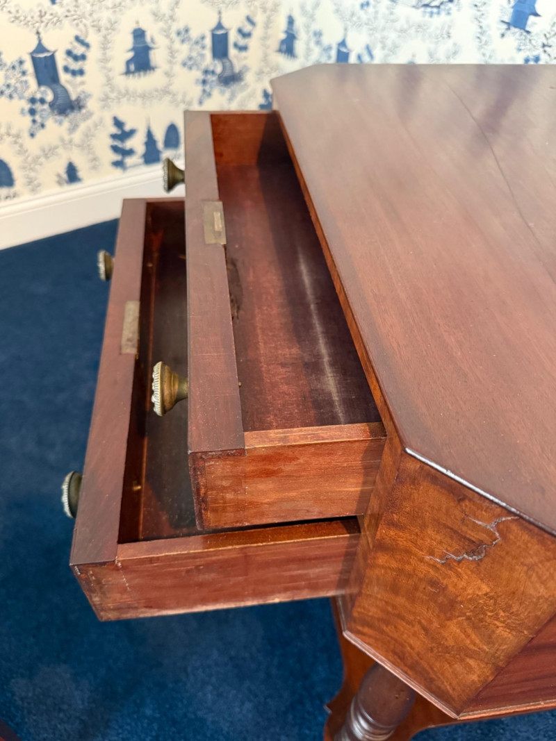 Crafted with warm-toned mahogany veneers, the drawer fronts display subtle figuring, lending depth and richness to this otherwise restrained and versatile form. Originally intended as a lady’s work or dressing table, the piece transitions effortlessly today as a bedside stand, entry accent, or small writing table. A timeless silhouette with clean Regency-inspired lines, offering both function and understated elegance.
