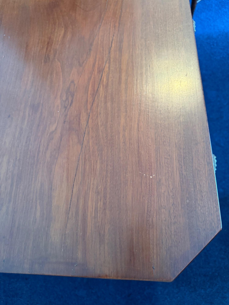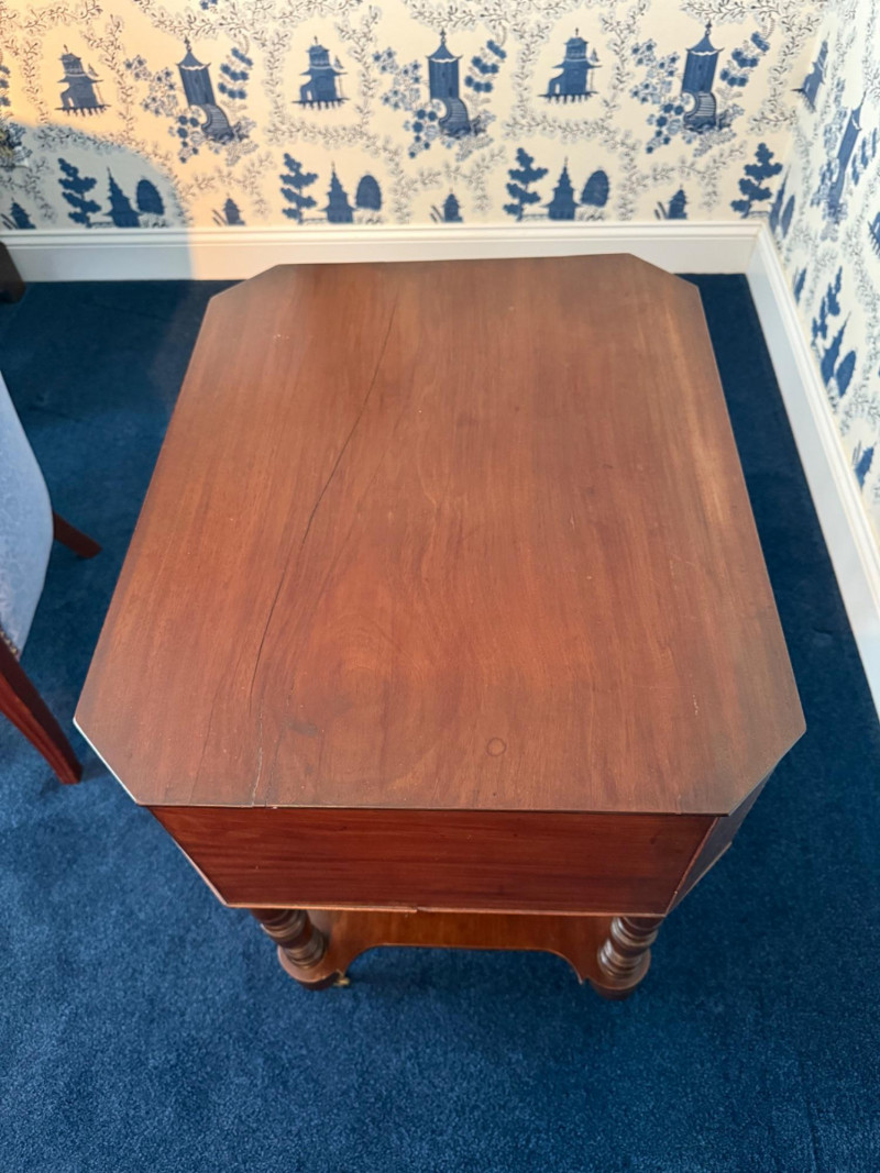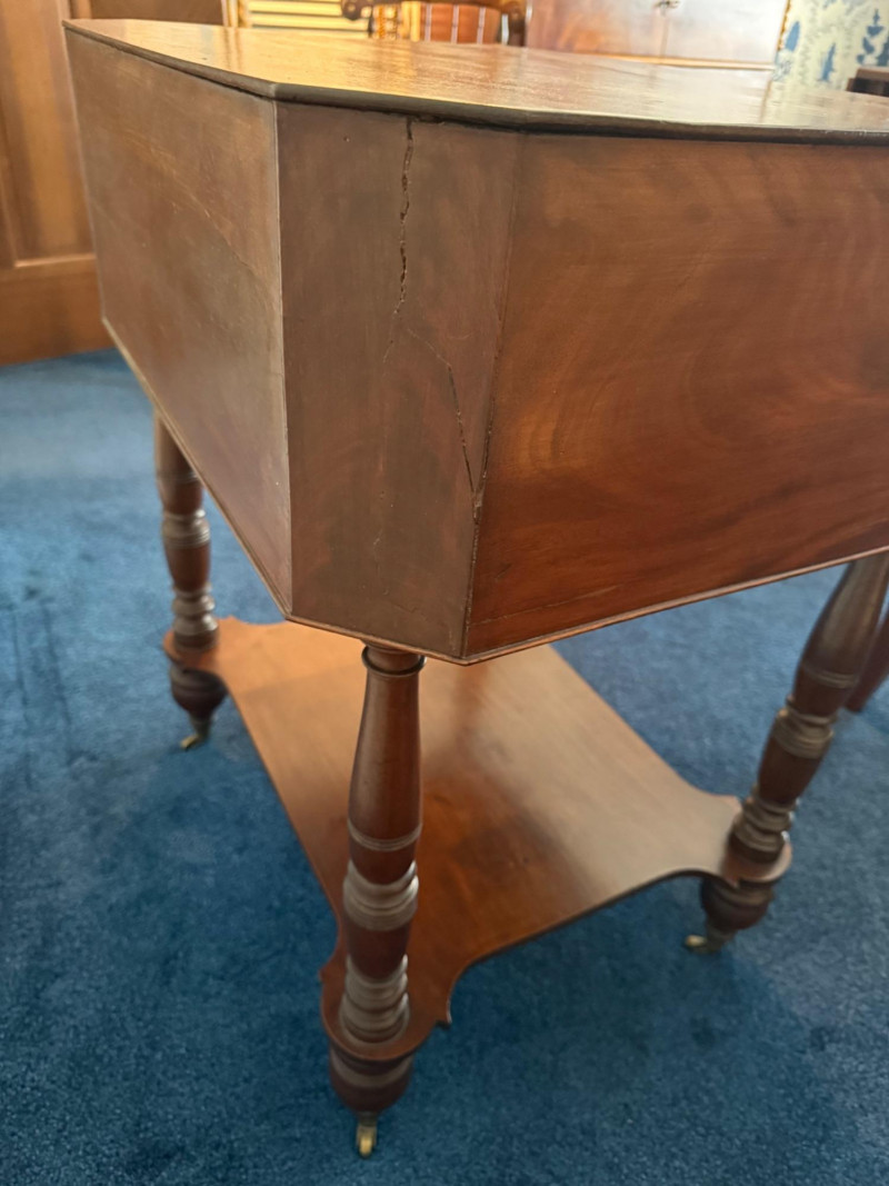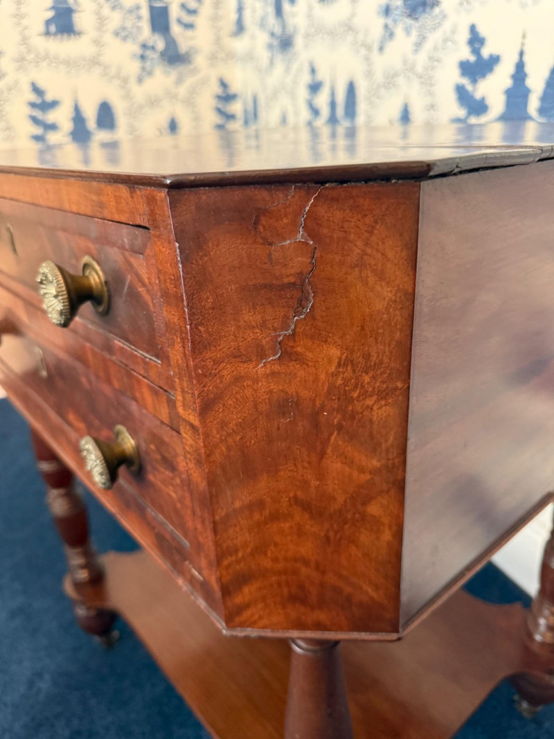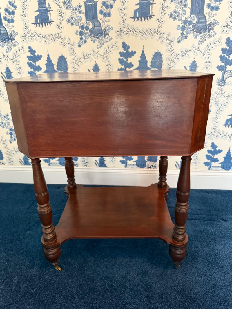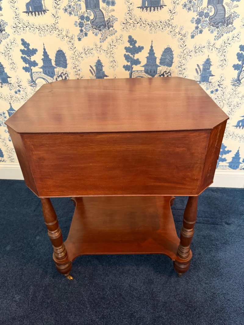 Crafted with warm-toned mahogany veneers, the drawer fronts display subtle figuring, lending depth and richness to this otherwise restrained and versatile form. Originally intended as a lady’s work or dressing table, the piece transitions effortlessly today as a bedside stand, entry accent, or small writing table. A timeless silhouette with clean Regency-inspired lines, offering both function and understated elegance.