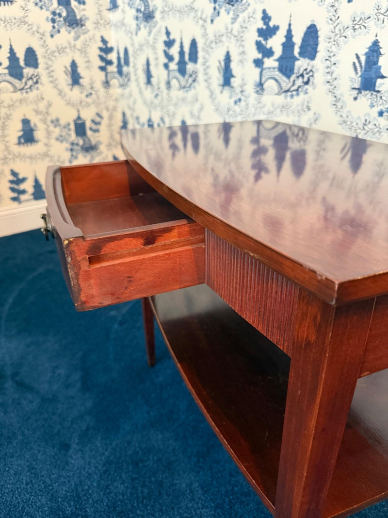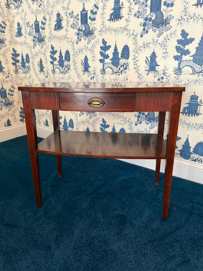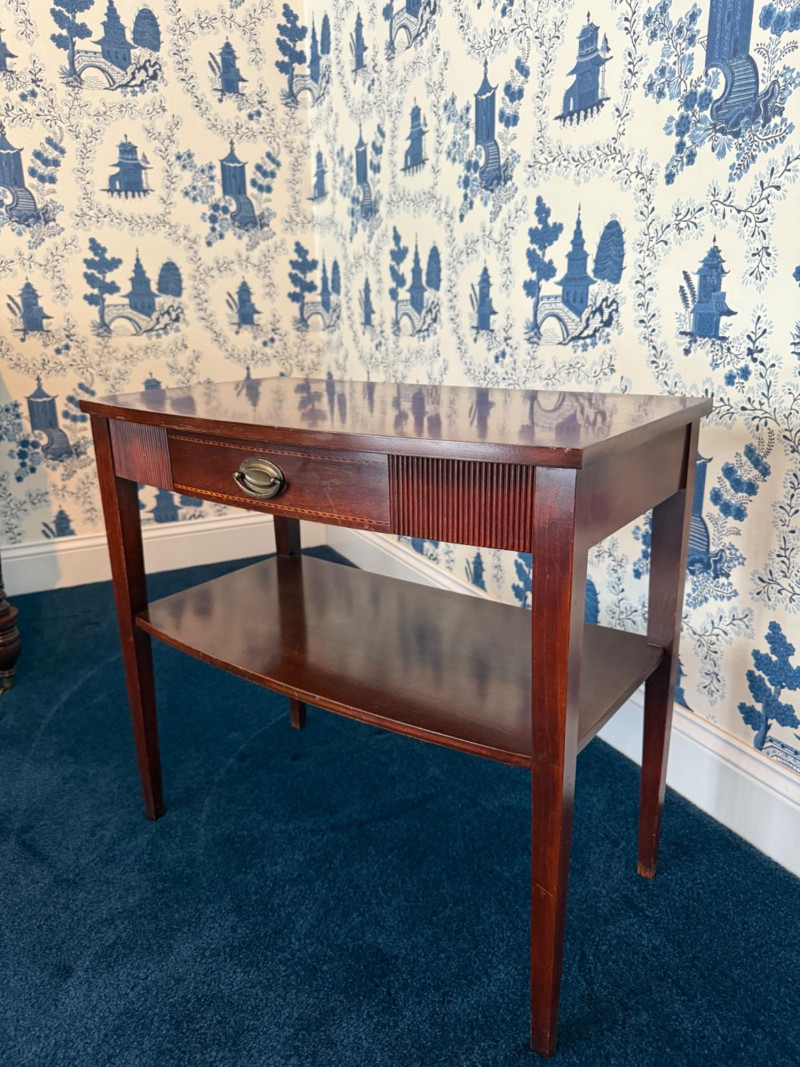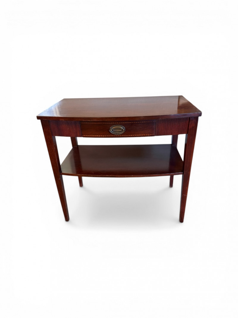 A vintage Mersman Furniture low console or hall table, model 7269, crafted in a warm mahogany finish and inspired by classic Federal design. The piece features a graceful bow front with subtle inlaid detailing, fluted corner accents, and tapered legs, giving it a refined, timeless presence. At a lower profile height of approximately 24 inches, this table is especially versatile—ideal as a low console, behind a low-backed sofa, beneath artwork, or even as a narrow coffee table alternative. The single center drawer retains its original oval brass pull, and the lower shelf provides additional space for books or display. A well-proportioned and highly usable piece with classic styling.