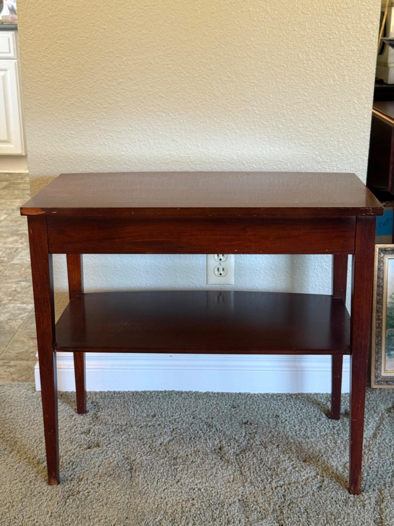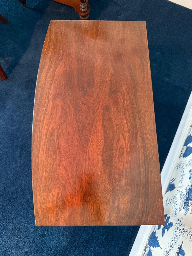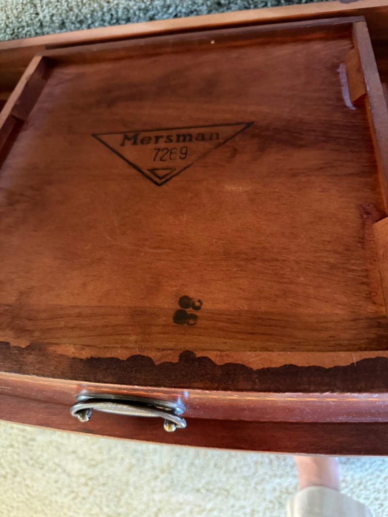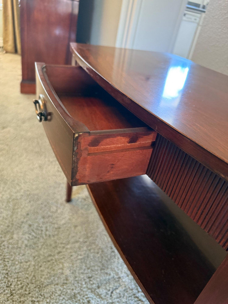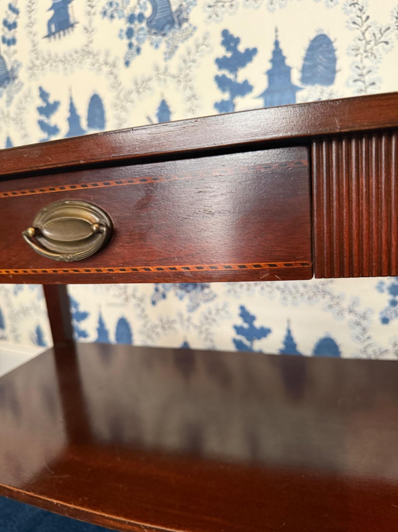 A vintage Mersman Furniture low console or hall table, model 7269, crafted in a warm mahogany finish and inspired by classic Federal design. The piece features a graceful bow front with subtle inlaid detailing, fluted corner accents, and tapered legs, giving it a refined, timeless presence. At a lower profile height of approximately 24 inches, this table is especially versatile—ideal as a low console, behind a low-backed sofa, beneath artwork, or even as a narrow coffee table alternative. The single center drawer retains its original oval brass pull, and the lower shelf provides additional space for books or display. A well-proportioned and highly usable piece with classic styling.