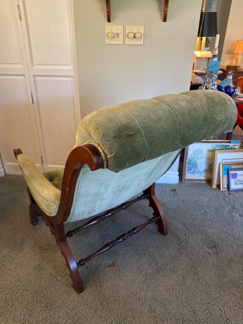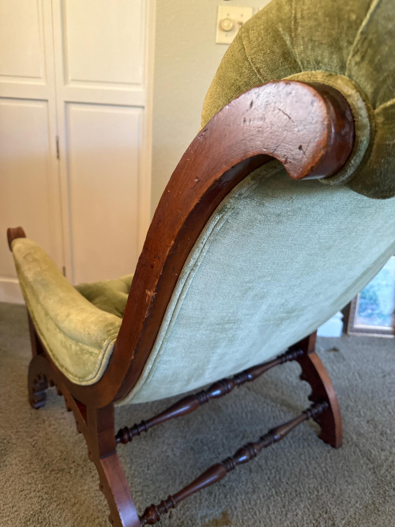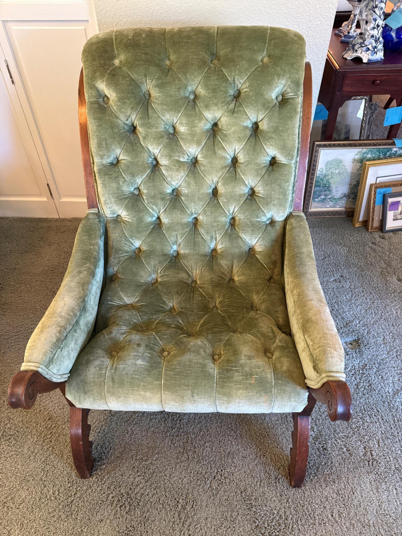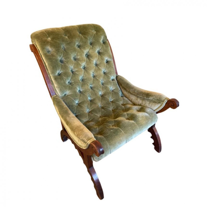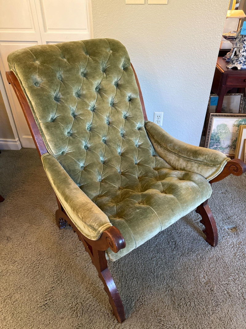 Elegant late‑Victorian upholstered armchair featuring a deeply tufted back and seat in soft green velvet. The carved wooden frame showcases classic period detailing: scroll‑form arms, shaped front legs, and subtle decorative flourishes along the seat rail. Its proportions, upholstery treatment, and carved elements align with late‑19th‑century Victorian parlor seating, a style known for comfort paired with ornamental craftsmanship. 37 H x 29.5 W x Seat Height 16" x seat width 21 W