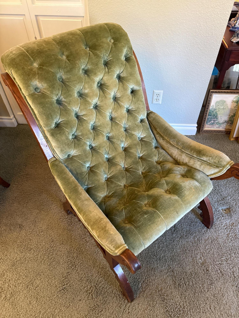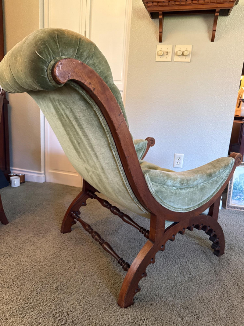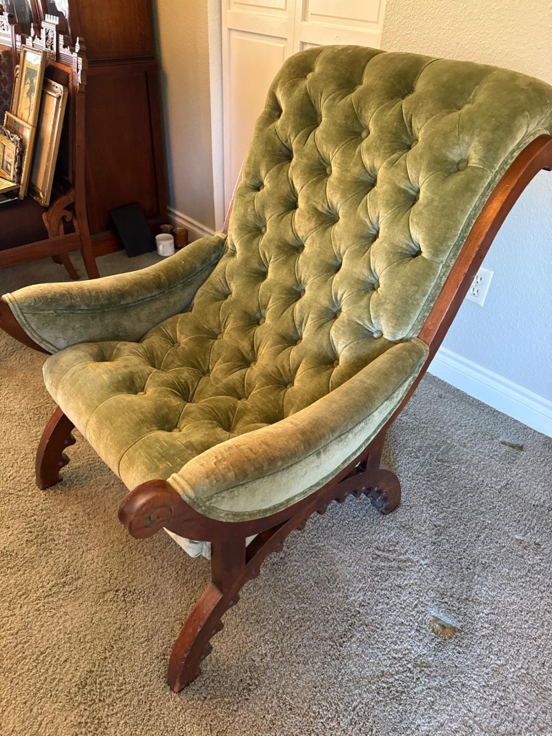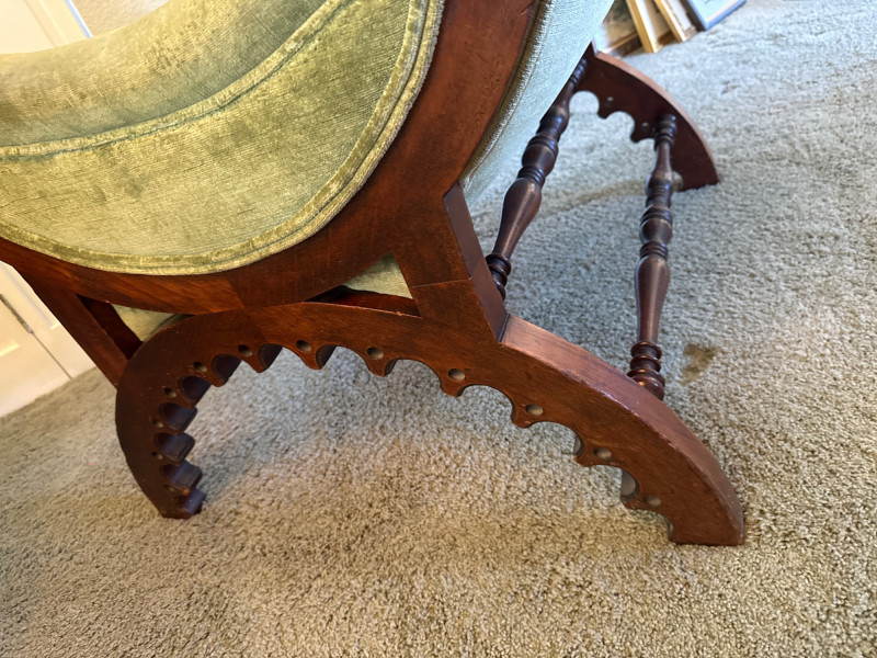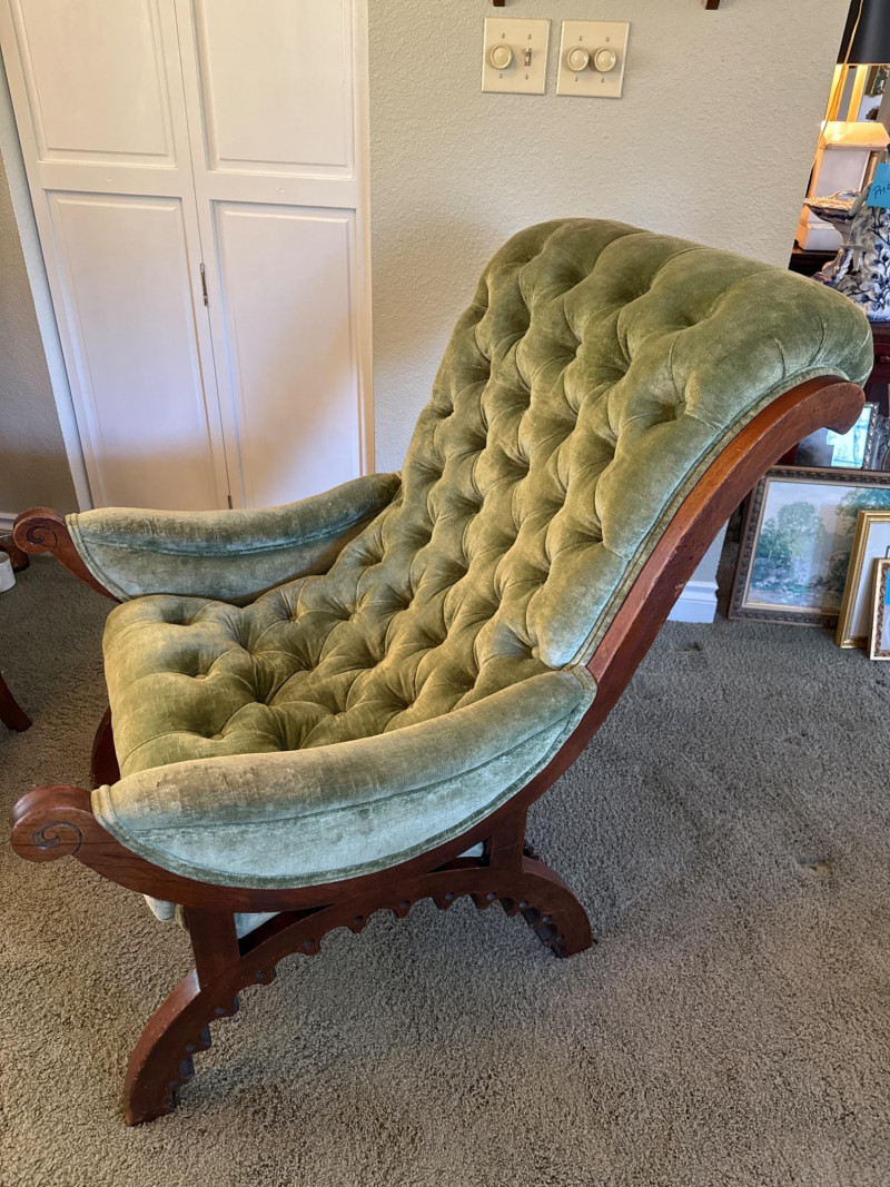 Elegant late‑Victorian upholstered armchair featuring a deeply tufted back and seat in soft green velvet. The carved wooden frame showcases classic period detailing: scroll‑form arms, shaped front legs, and subtle decorative flourishes along the seat rail. Its proportions, upholstery treatment, and carved elements align with late‑19th‑century Victorian parlor seating, a style known for comfort paired with ornamental craftsmanship. 37 H x 29.5 W x Seat Height 16" x seat width 21 W