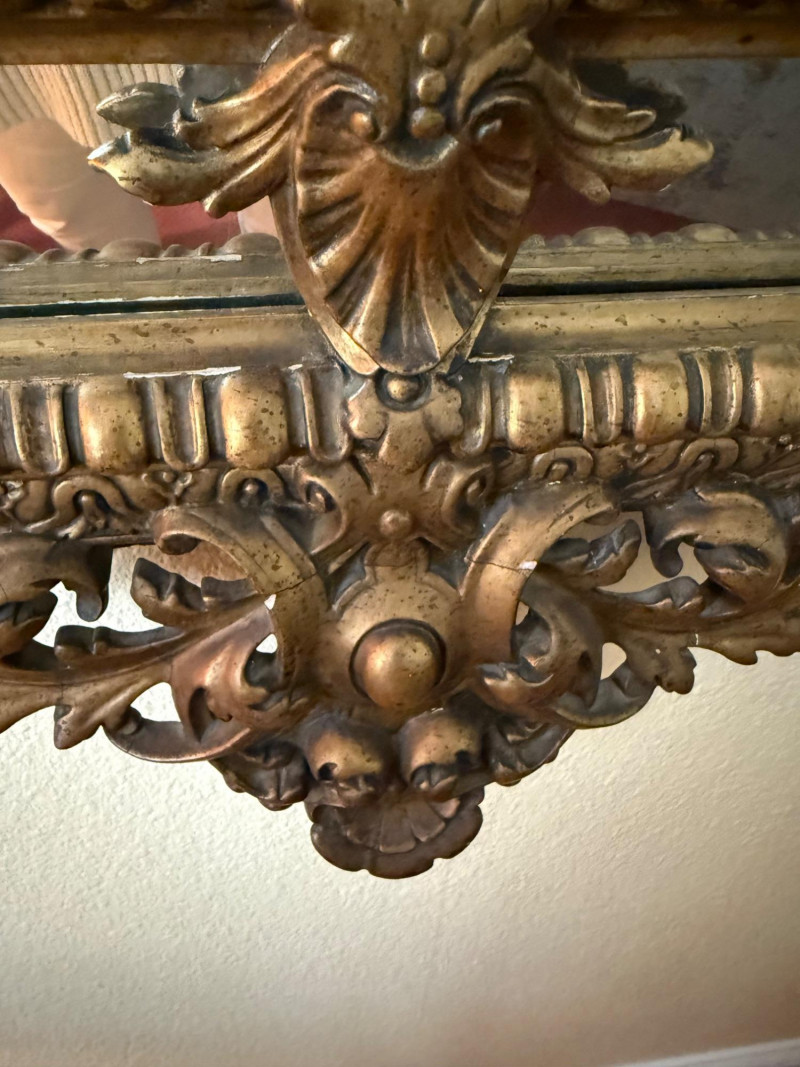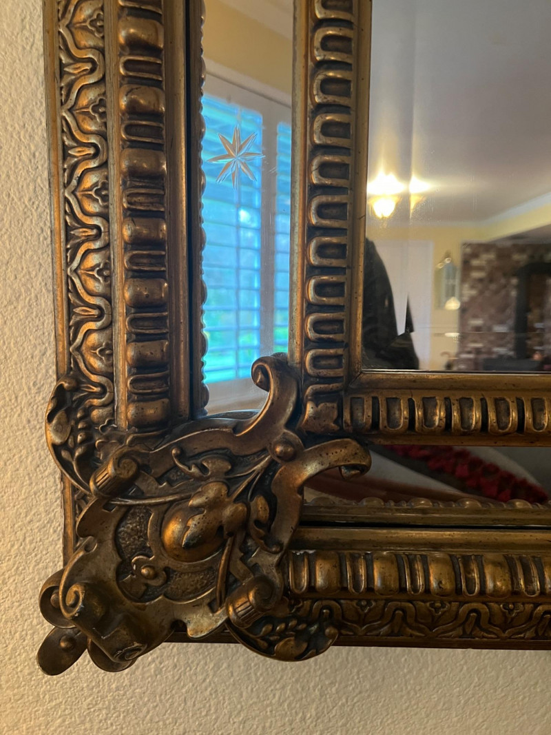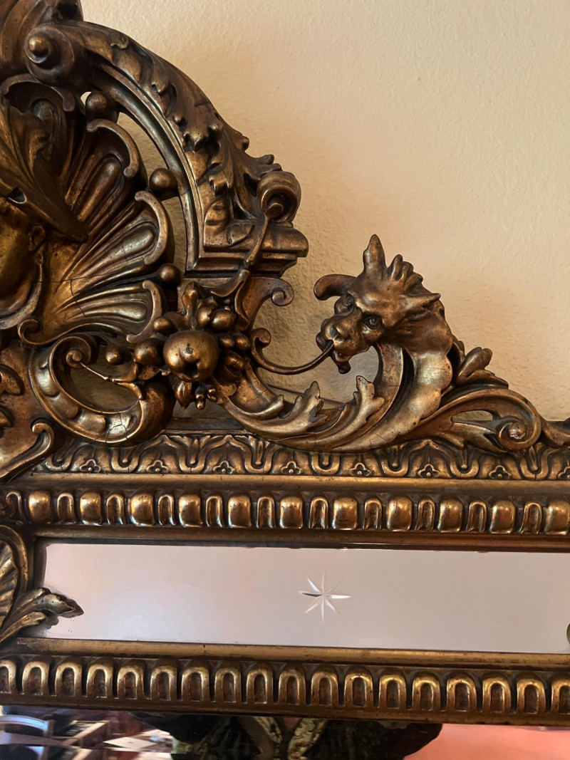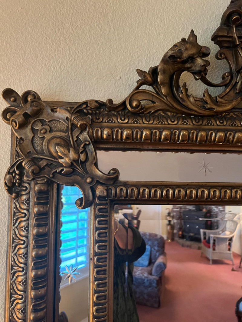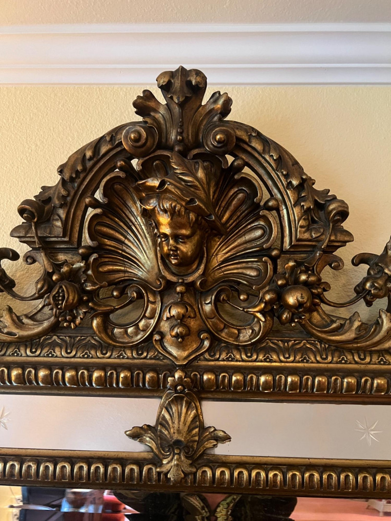 A dramatic and generously scaled wall mirror in the Hollywood Regency taste, featuring an elaborate gilt frame adorned with scrolling acanthus detail and a sculptural cherub crest. The multi-panel mirror design includes subtle etched starburst motifs, adding depth and visual interest while reflecting light beautifully. This statement piece is ideal for overmantel display or as a focal point in a traditional, vintage-inspired, or eclectic interior. Dimensions: 51” W x 46” H Condition: Minor age-appropriate wear to the gilt finish and light surface marks to the mirror; overall presentation is very good with no major structural issues observed.