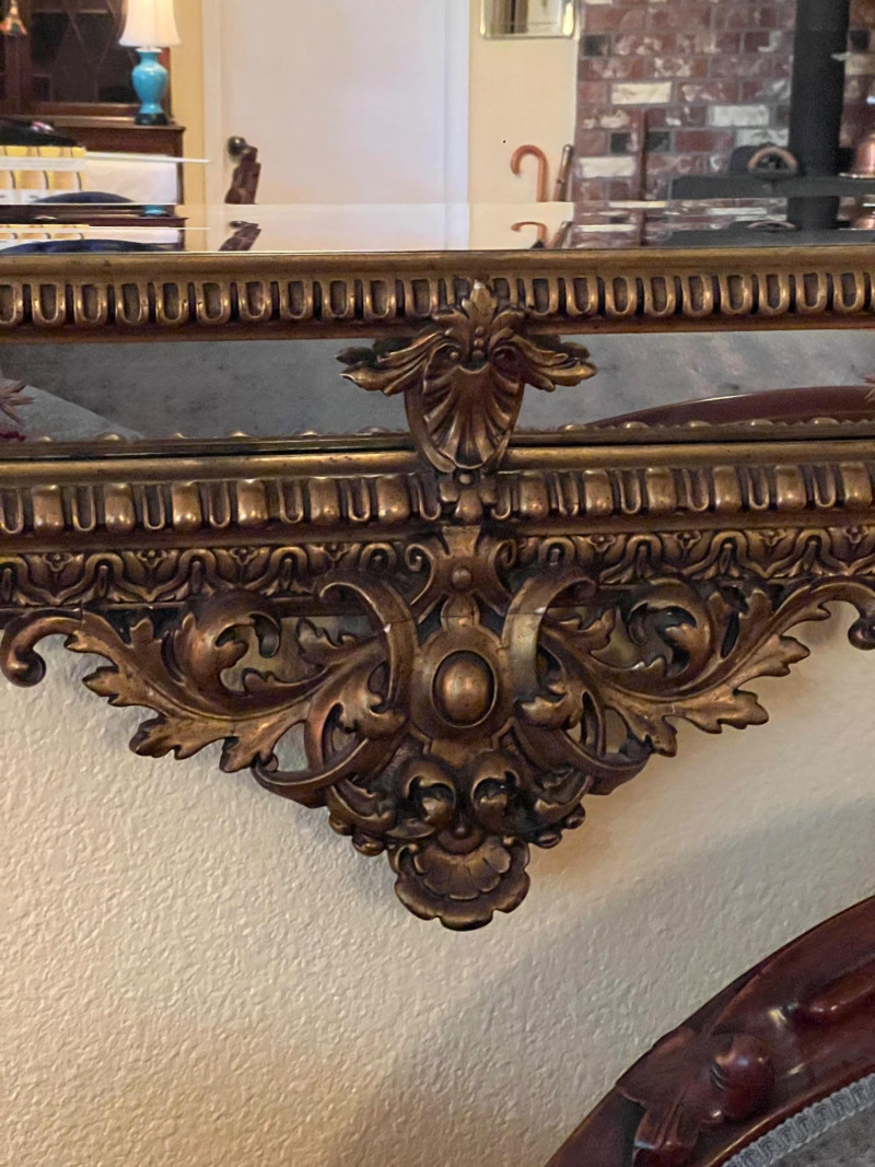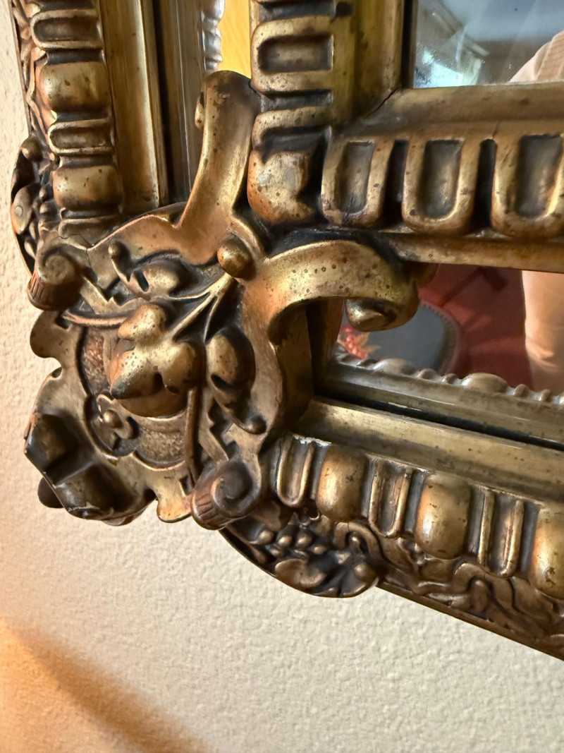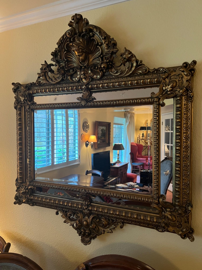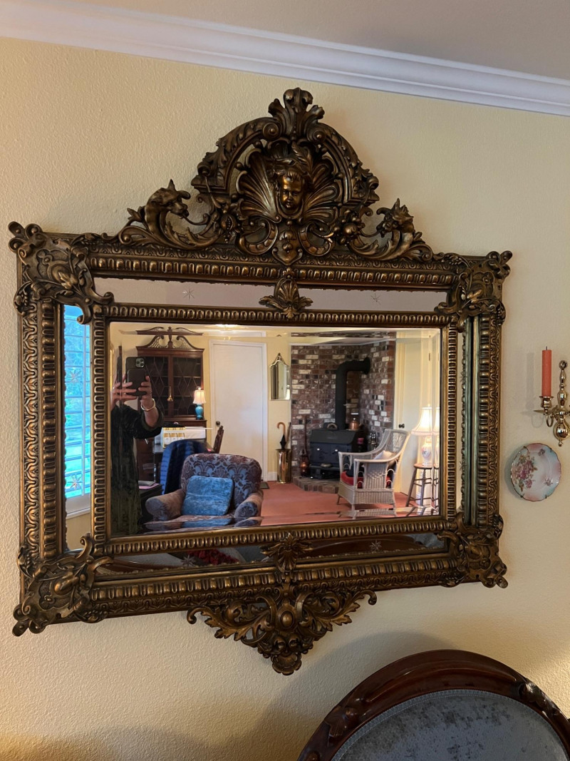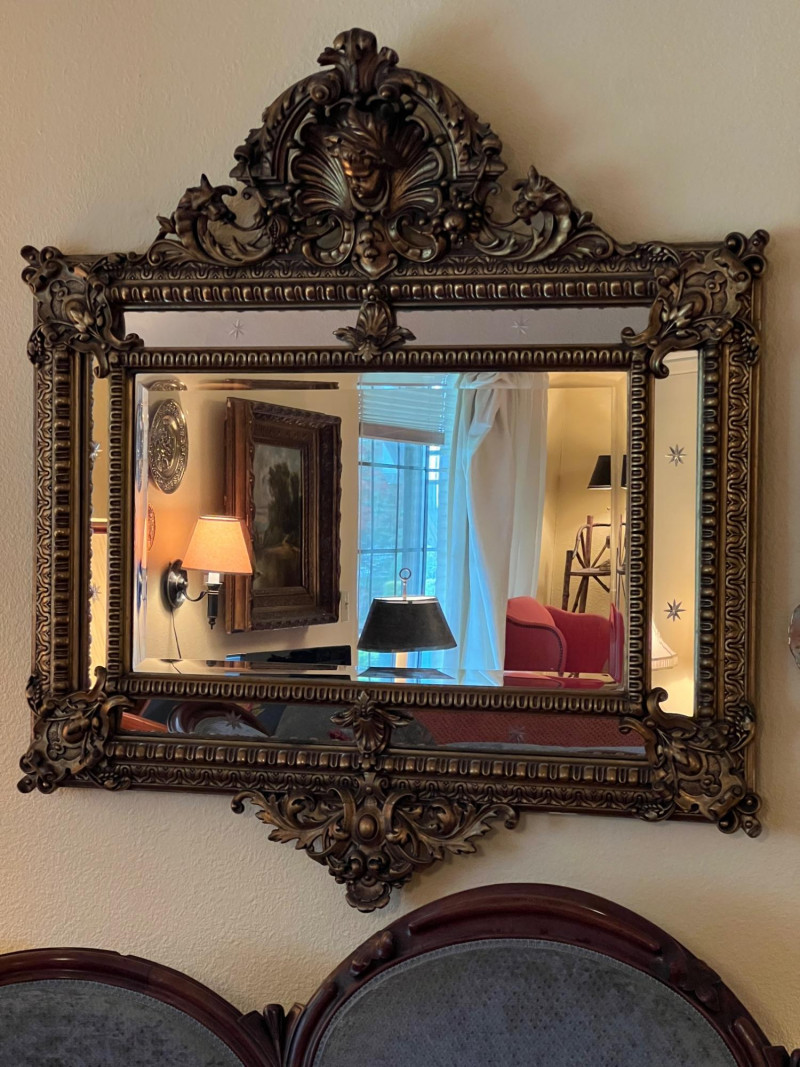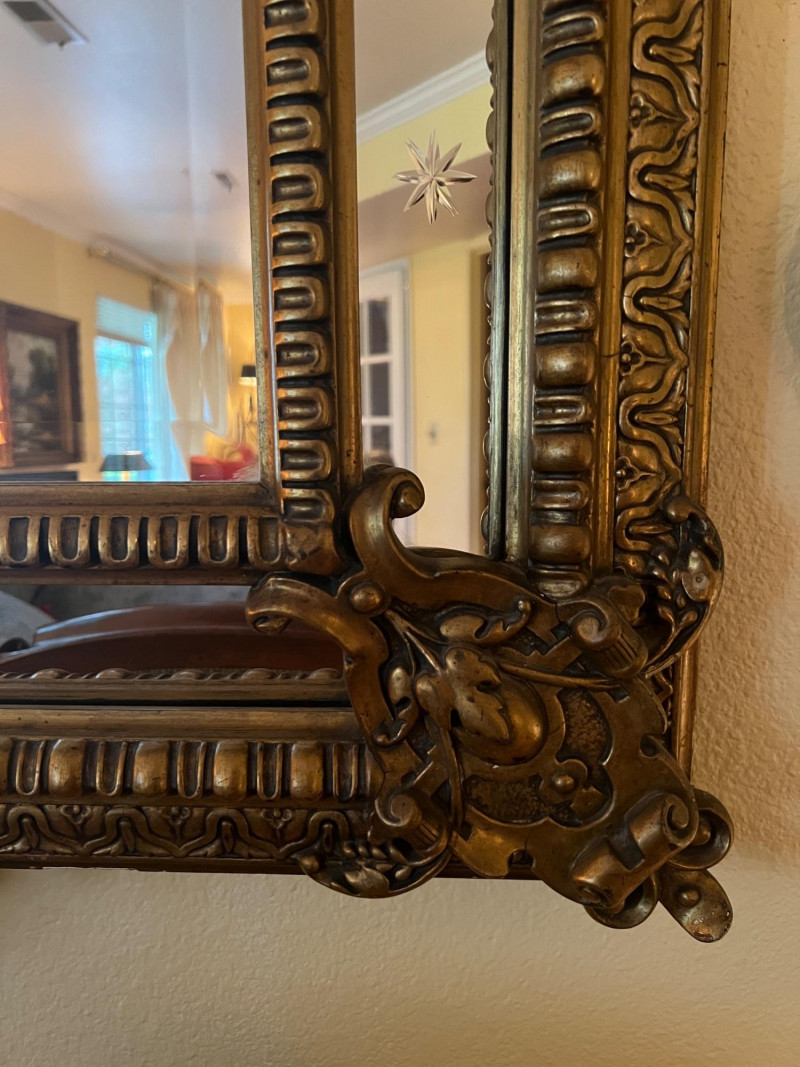 A dramatic and generously scaled wall mirror in the Hollywood Regency taste, featuring an elaborate gilt frame adorned with scrolling acanthus detail and a sculptural cherub crest. The multi-panel mirror design includes subtle etched starburst motifs, adding depth and visual interest while reflecting light beautifully. This statement piece is ideal for overmantel display or as a focal point in a traditional, vintage-inspired, or eclectic interior. Dimensions: 51” W x 46” H Condition: Minor age-appropriate wear to the gilt finish and light surface marks to the mirror; overall presentation is very good with no major structural issues observed.
