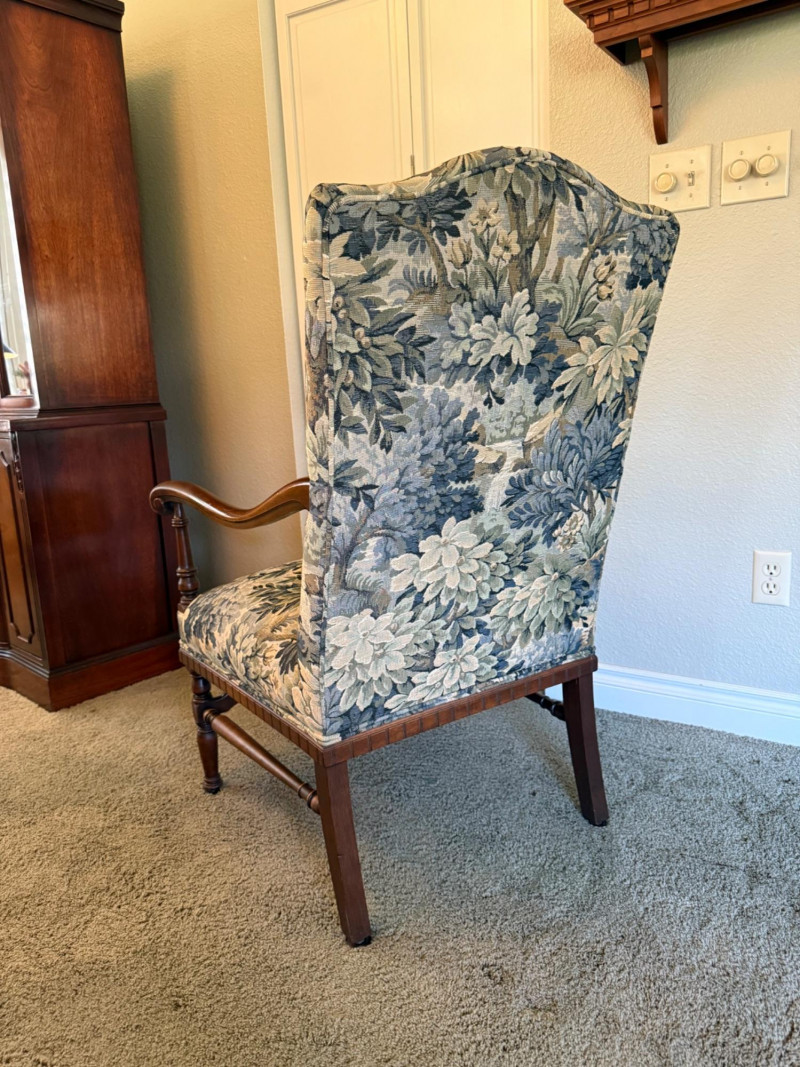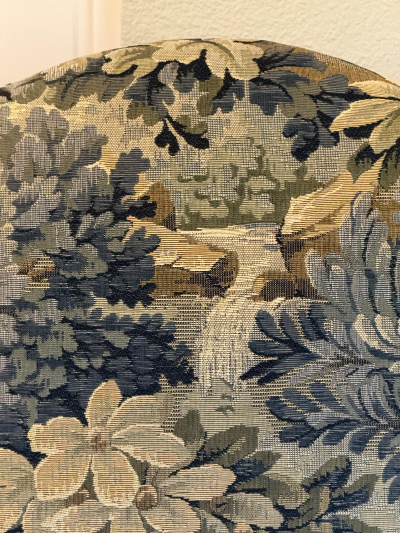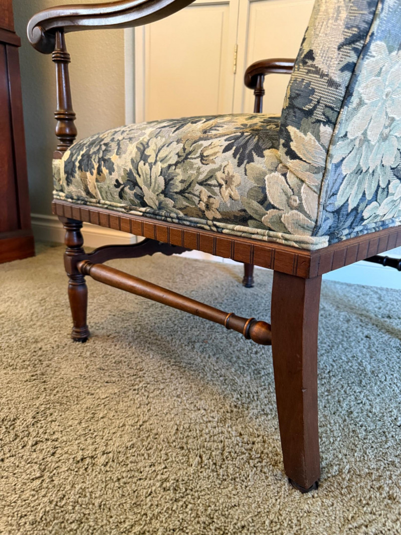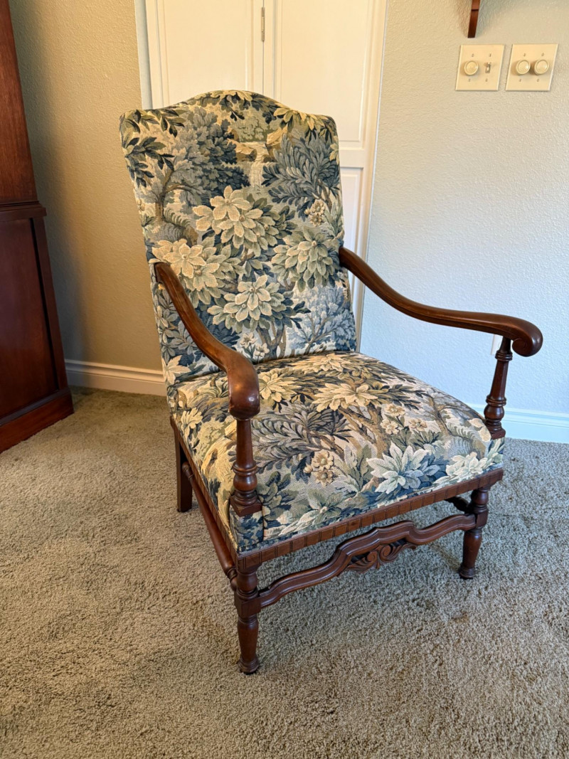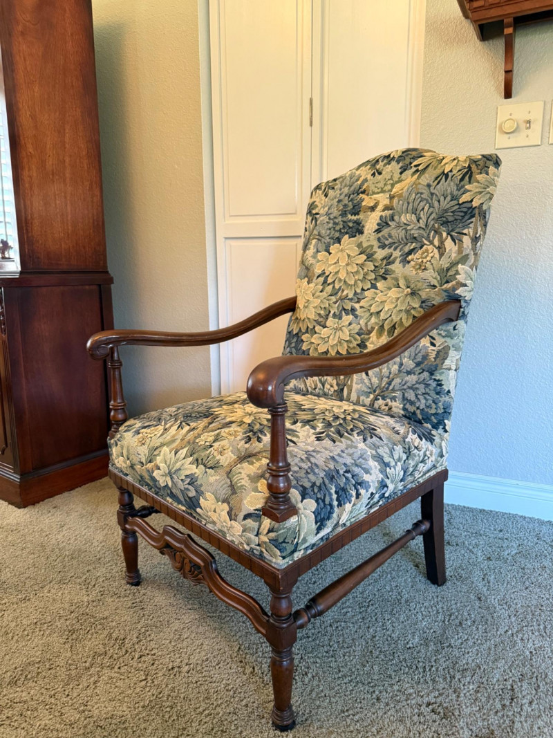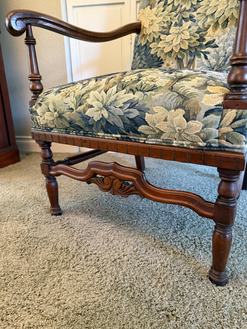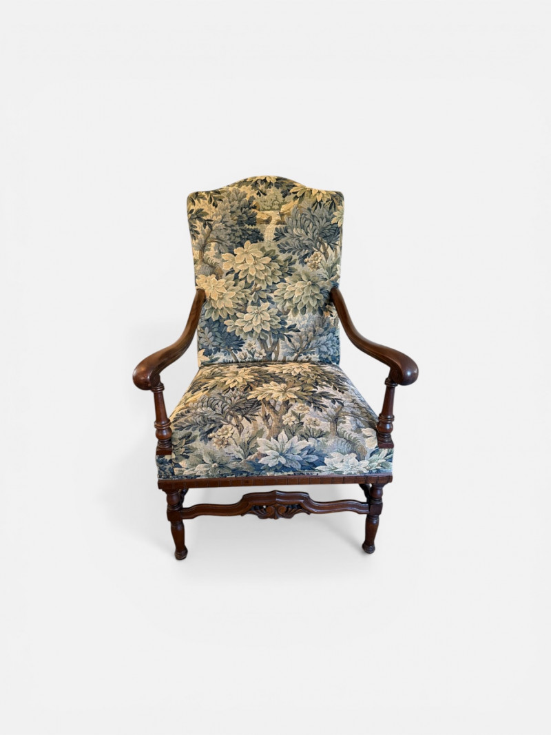 An elegant French Provincial-style fauteuil featuring a hand-carved walnut frame with scrolling arms, turned supports, and a shaped apron with central foliate carving. Professionally restored and newly upholstered in a richly woven verdure-style tapestry, the fabric presents layered botanical motifs in soft greens, blues, and warm neutrals. The tall, gently arched back and generous proportions offer both comfort and visual presence, making this an ideal accent chair for traditional, European, or collected interiors. A refined statement piece that balances craftsmanship with decorative impact. Professionally restored and newly upholstered. Structurally sound with minor, age-appropriate surface wear to the wood frame. Upholstery is clean and in excellent condition. Seat height is 18"
