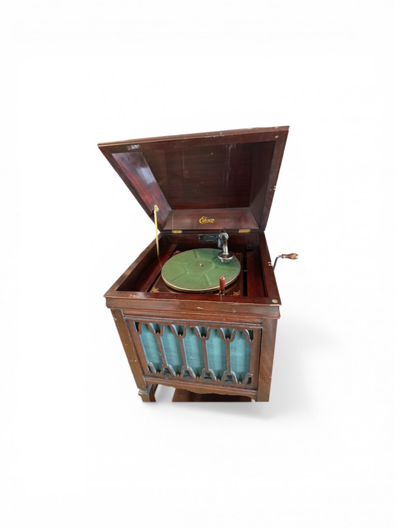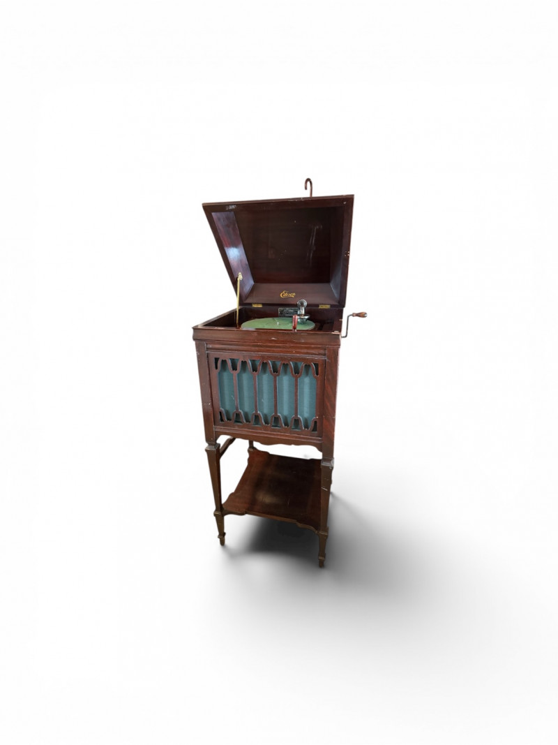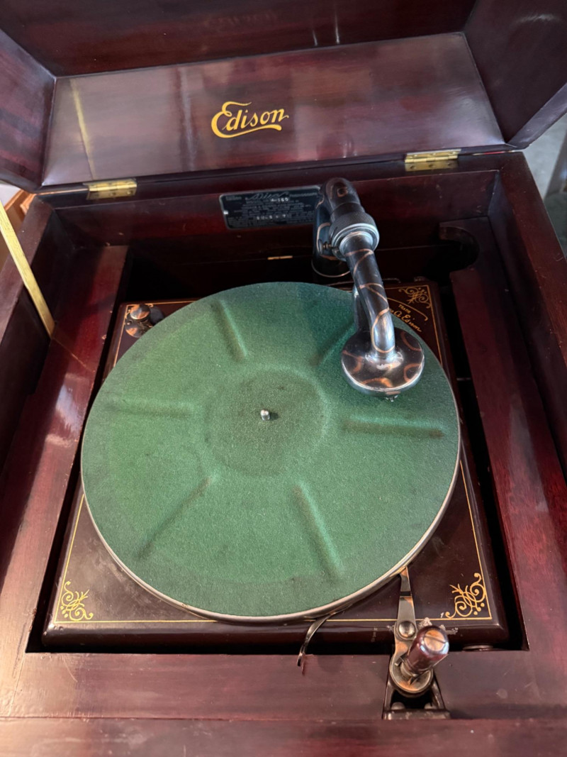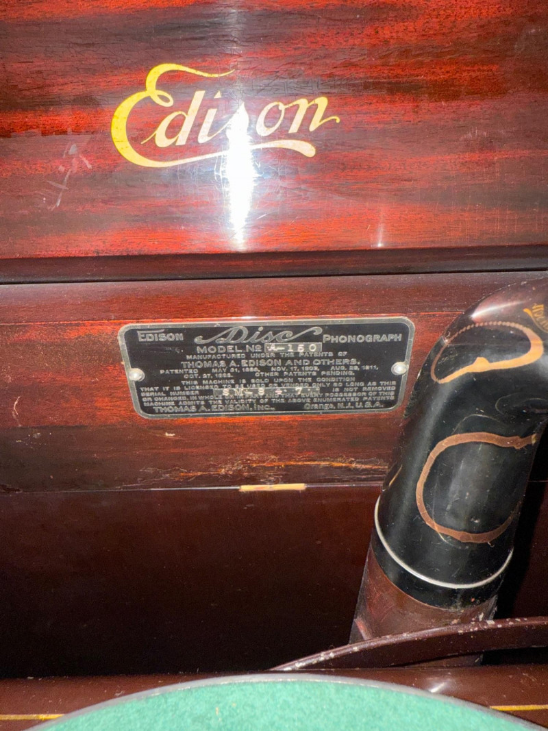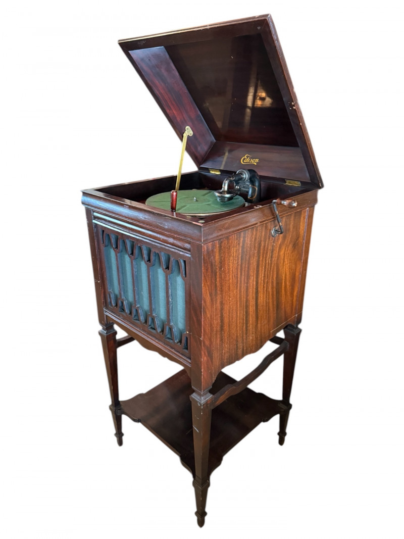 An authentic early 20th century Edison Disc Phonograph, Model A250, housed in a richly toned mahogany cabinet and accompanied by a group of original Edison Diamond Disc records with period sleeves and storage box. Manufactured by Thomas A. Edison, Inc. (Orange, New Jersey), this phonograph represents one of Edison’s most refined acoustic machines, engineered specifically for use with Diamond Disc records. The interior retains its original plaque and components, showcasing the craftsmanship and mechanical ingenuity of the era. Included in this lot is a collection of vintage Edison records, many with original printed sleeves, offering both display appeal and collectible value. These records were part of Edison’s proprietary system and are not compatible with standard phonographs, adding to their niche desirability among collectors. A compelling estate piece with strong decorative presence—ideal for display, restoration, or incorporation into a period interior.