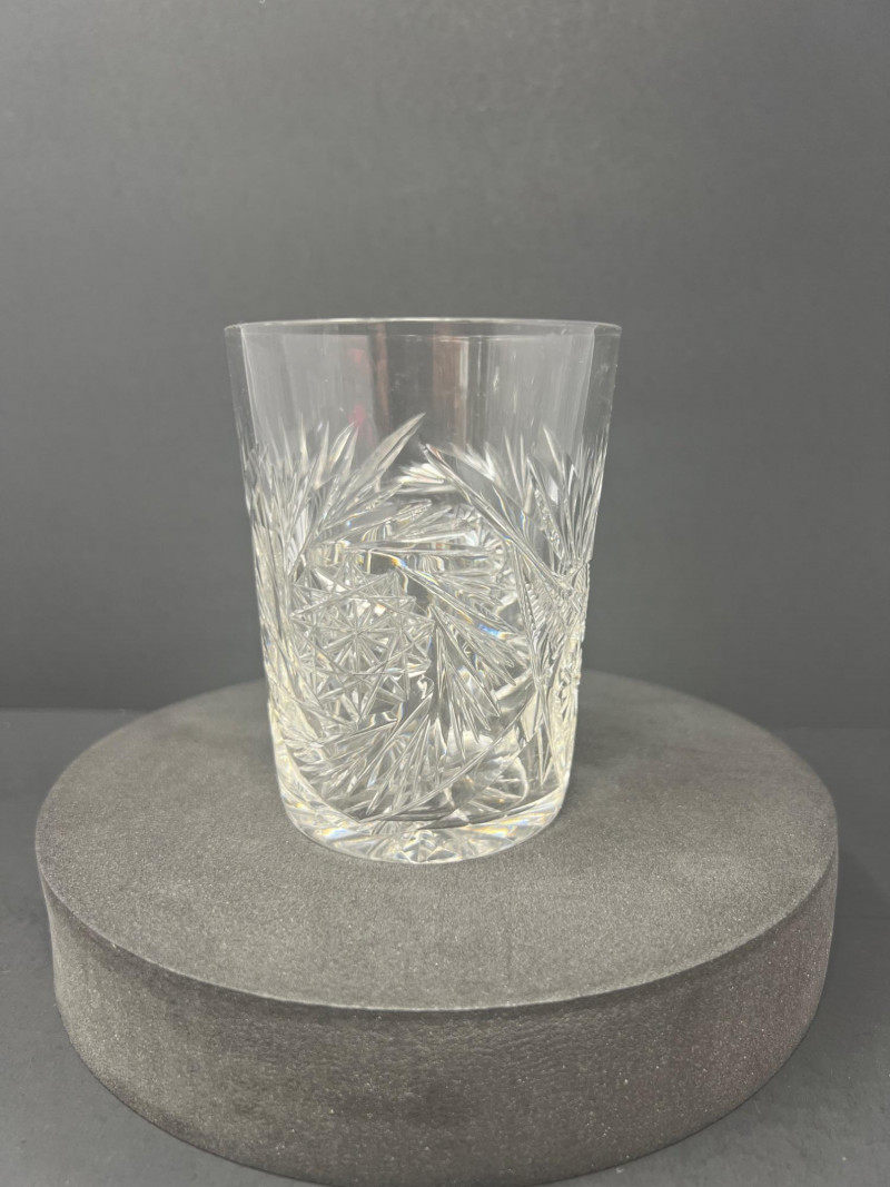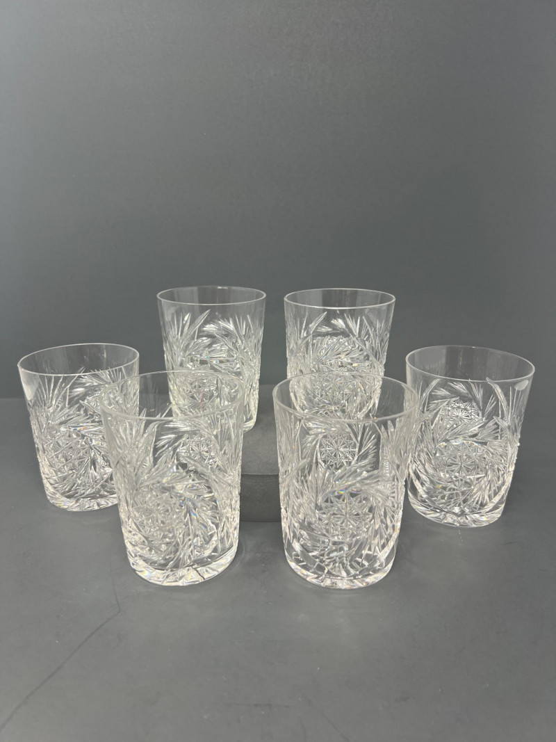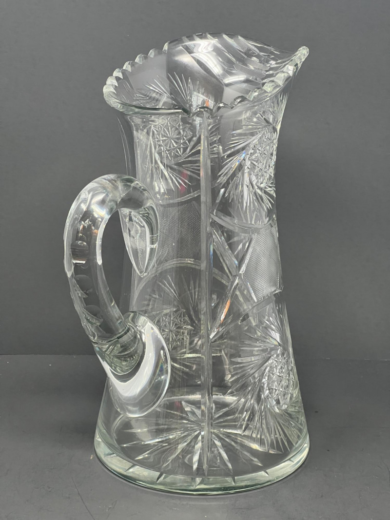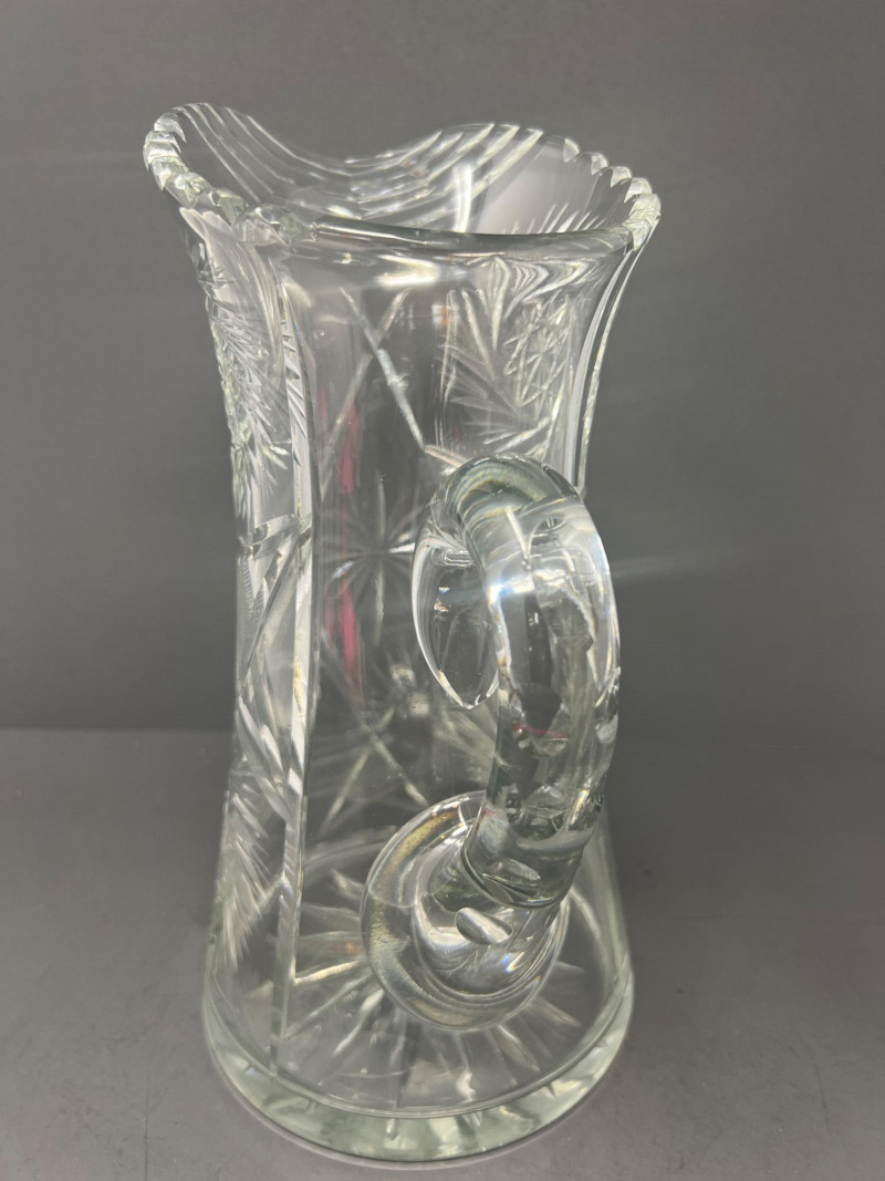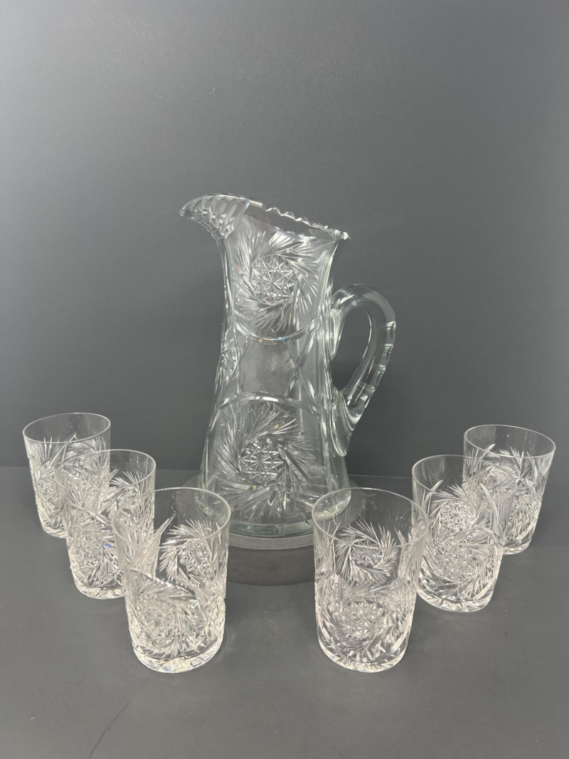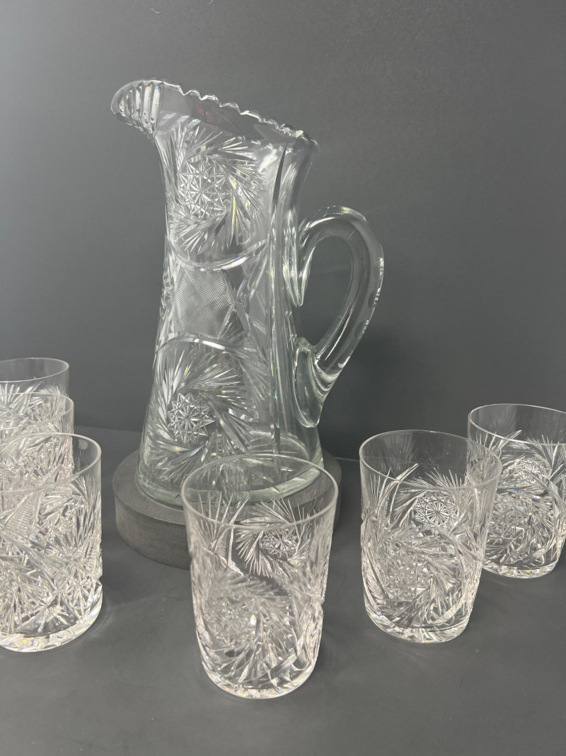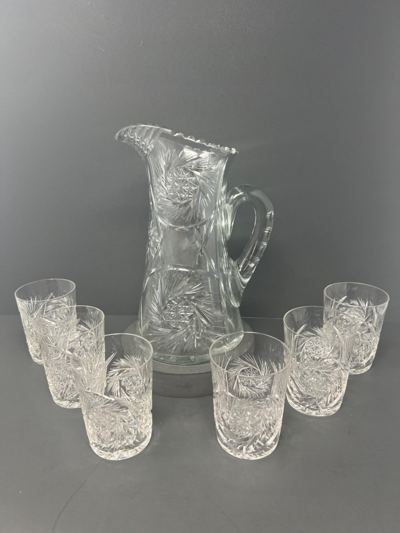 Beautiful vintage cut crystal (or fine cut glass) pitcher with matching set of six tumblers. Features deep hand-cut starburst and fan patterns with crosshatch details, creating exceptional sparkle and brilliance. The pitcher has a classic form with a notched (sawtooth) rim and applied handle. A substantial, heavy set ideal for entertaining or display, reflecting early 20th century American Brilliant–style craftsmanship. Condition: Very good vintage condition with typical minor wear; no major damage noted (please see photos).