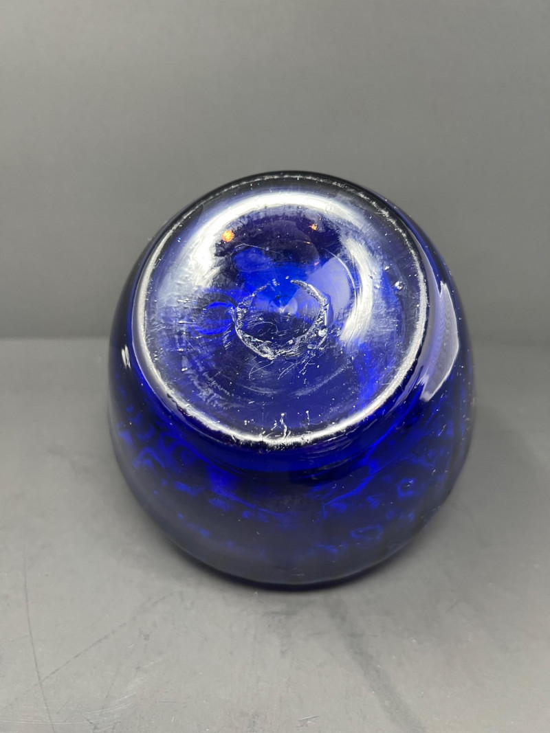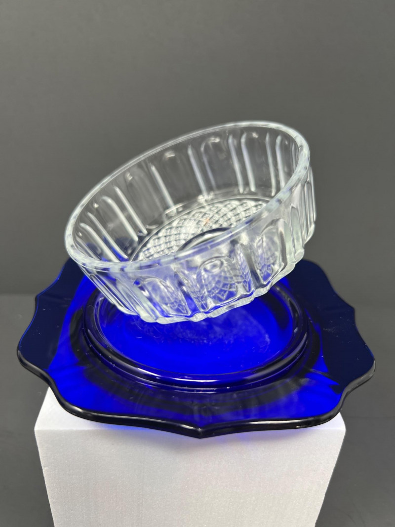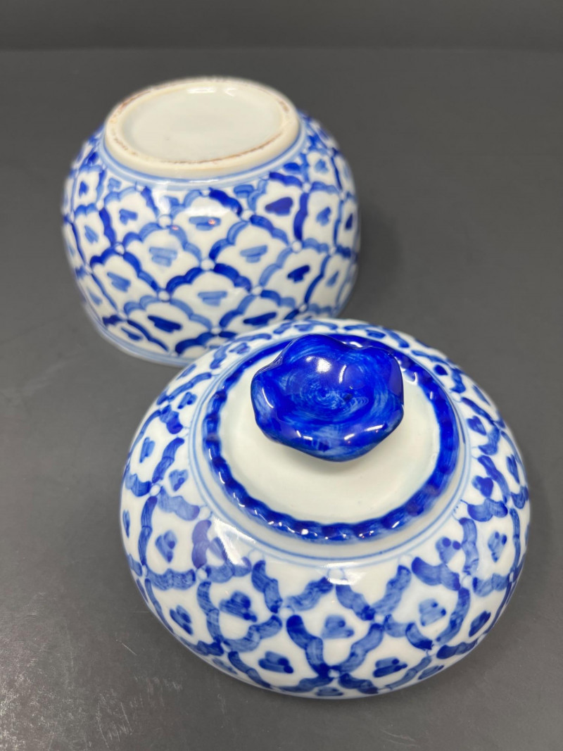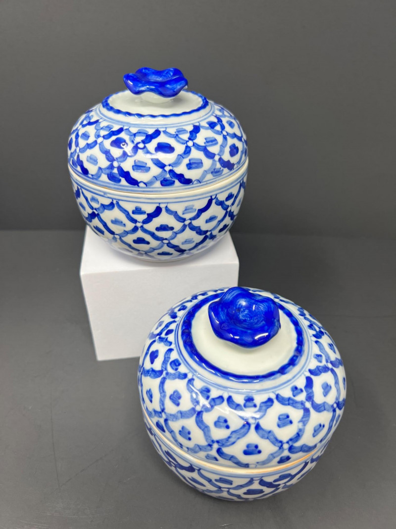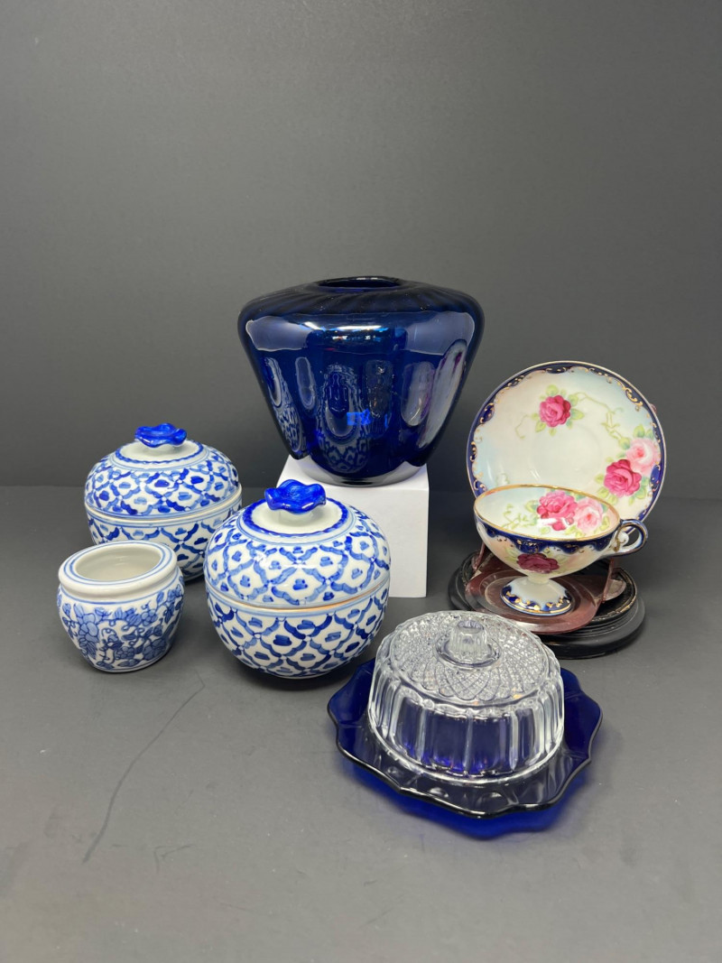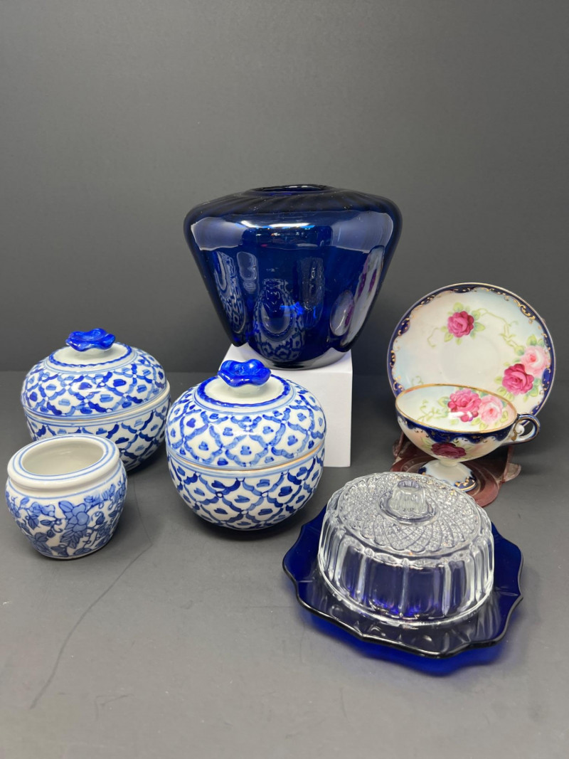 Decorative grouping featuring a cobalt art glass vase, two blue-and-white porcelain covered jars with matching small open vessel, a cobalt and clear pressed glass covered butter dish, and a hand-painted Japanese demitasse cup and saucer with floral design and gilt accents. A cohesive mix of classic blue-and-white and bold cobalt glass—ideal for display or resale. The art glass vase is 5" tall, 6" in diameter, the pair of covered jars are 4" tall & 4" in diameter.
