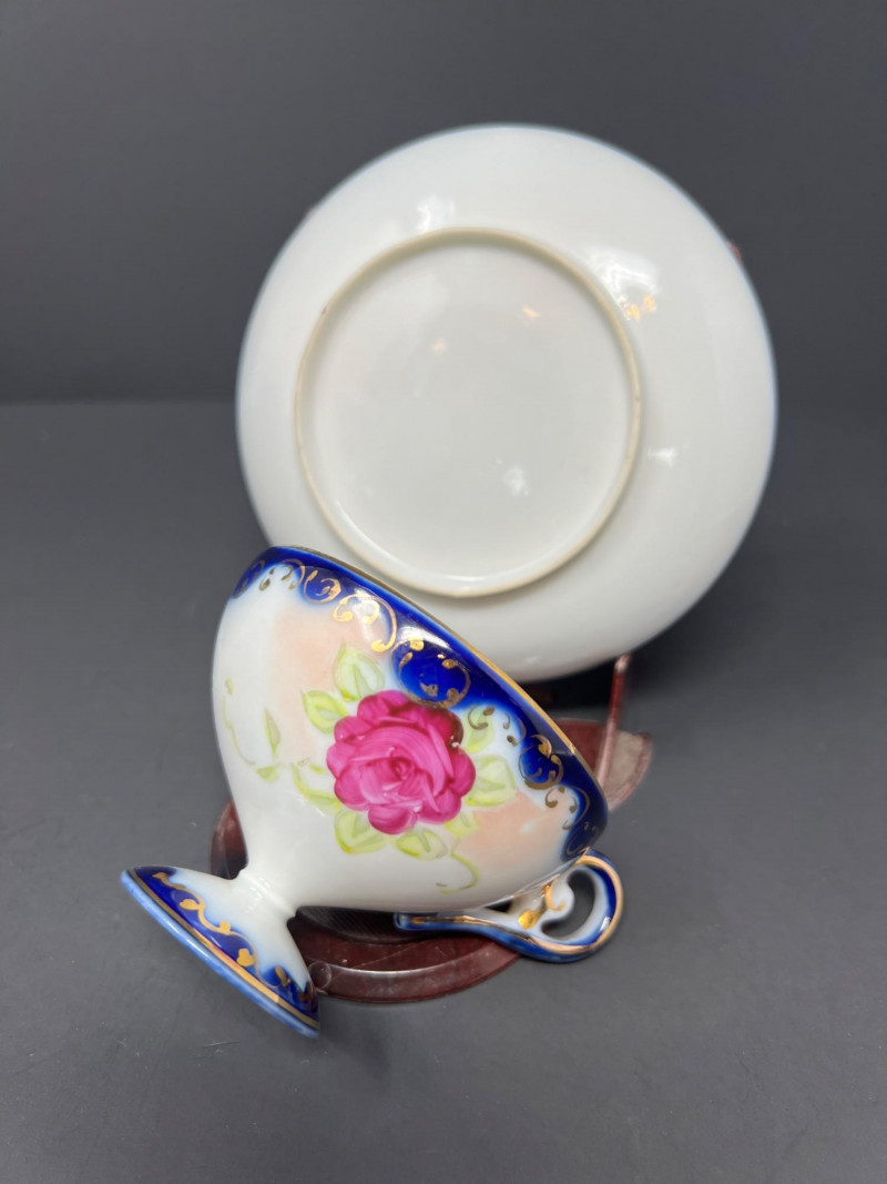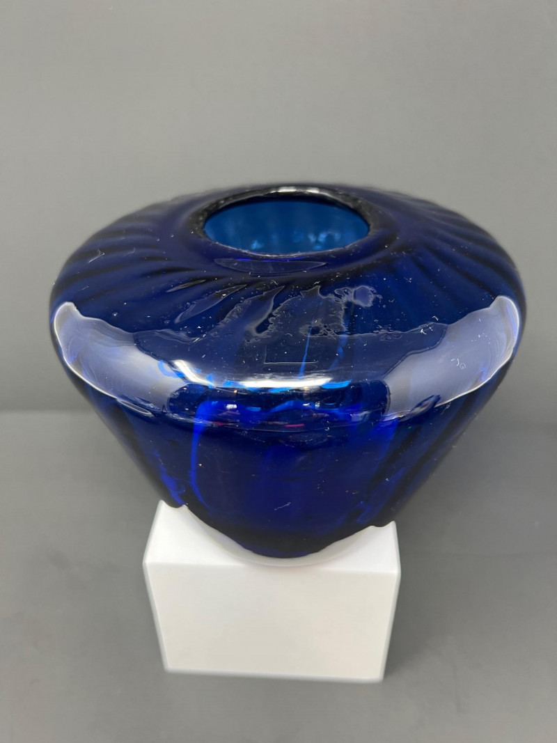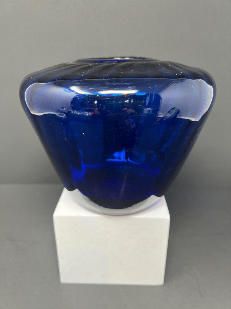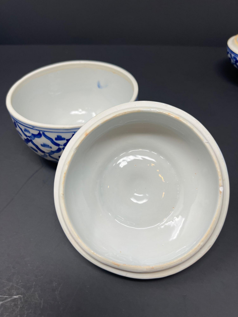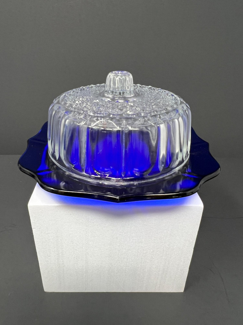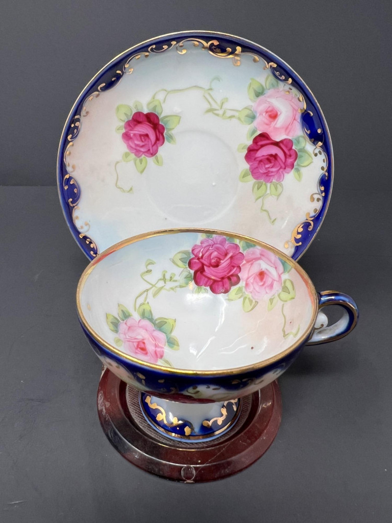 Decorative grouping featuring a cobalt art glass vase, two blue-and-white porcelain covered jars with matching small open vessel, a cobalt and clear pressed glass covered butter dish, and a hand-painted Japanese demitasse cup and saucer with floral design and gilt accents. A cohesive mix of classic blue-and-white and bold cobalt glass—ideal for display or resale. The art glass vase is 5" tall, 6" in diameter, the pair of covered jars are 4" tall & 4" in diameter.