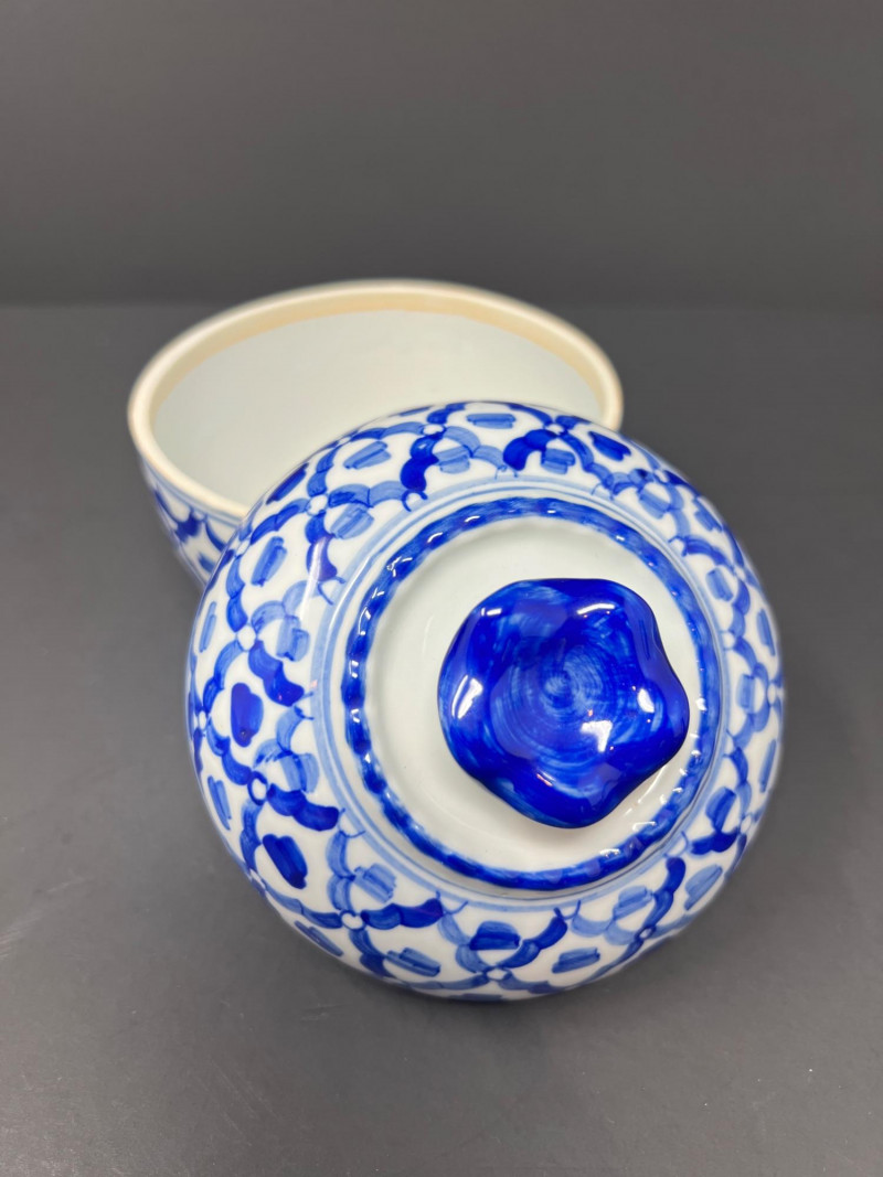 Lot # 99 - Blue White Collection – Vase, Covered Jars, Butter Dish, Cup & Saucer