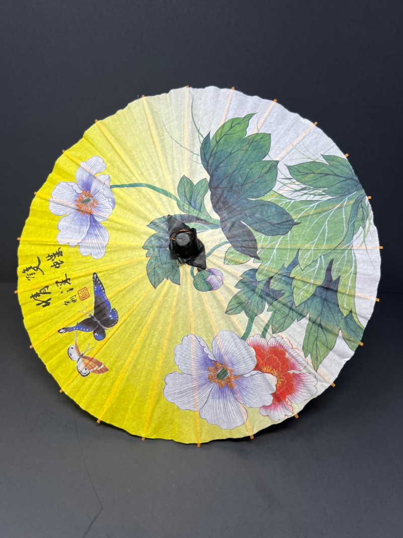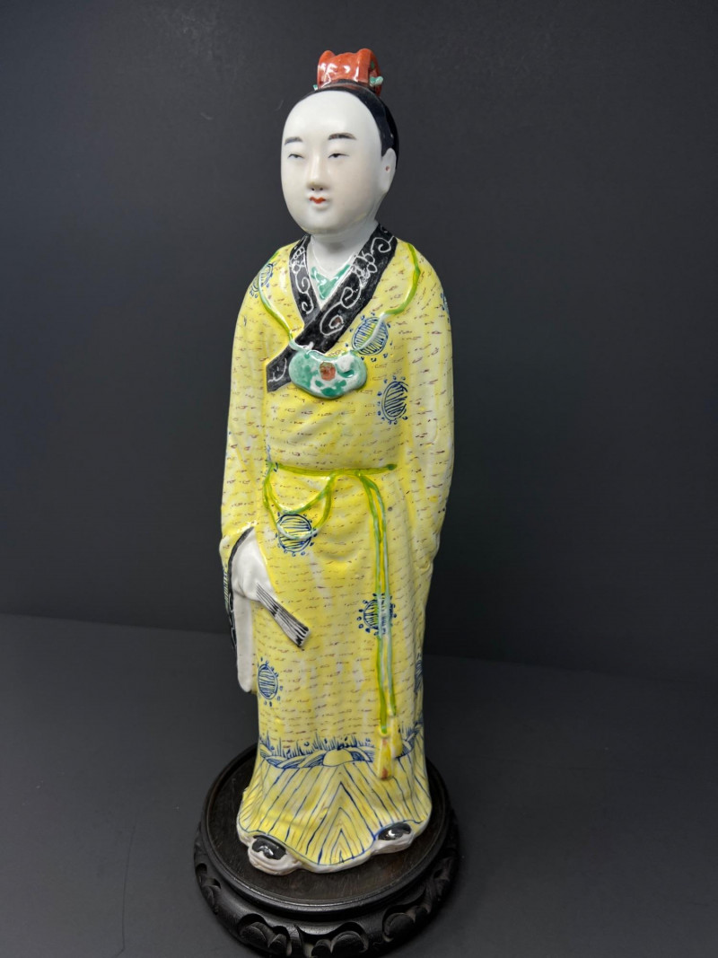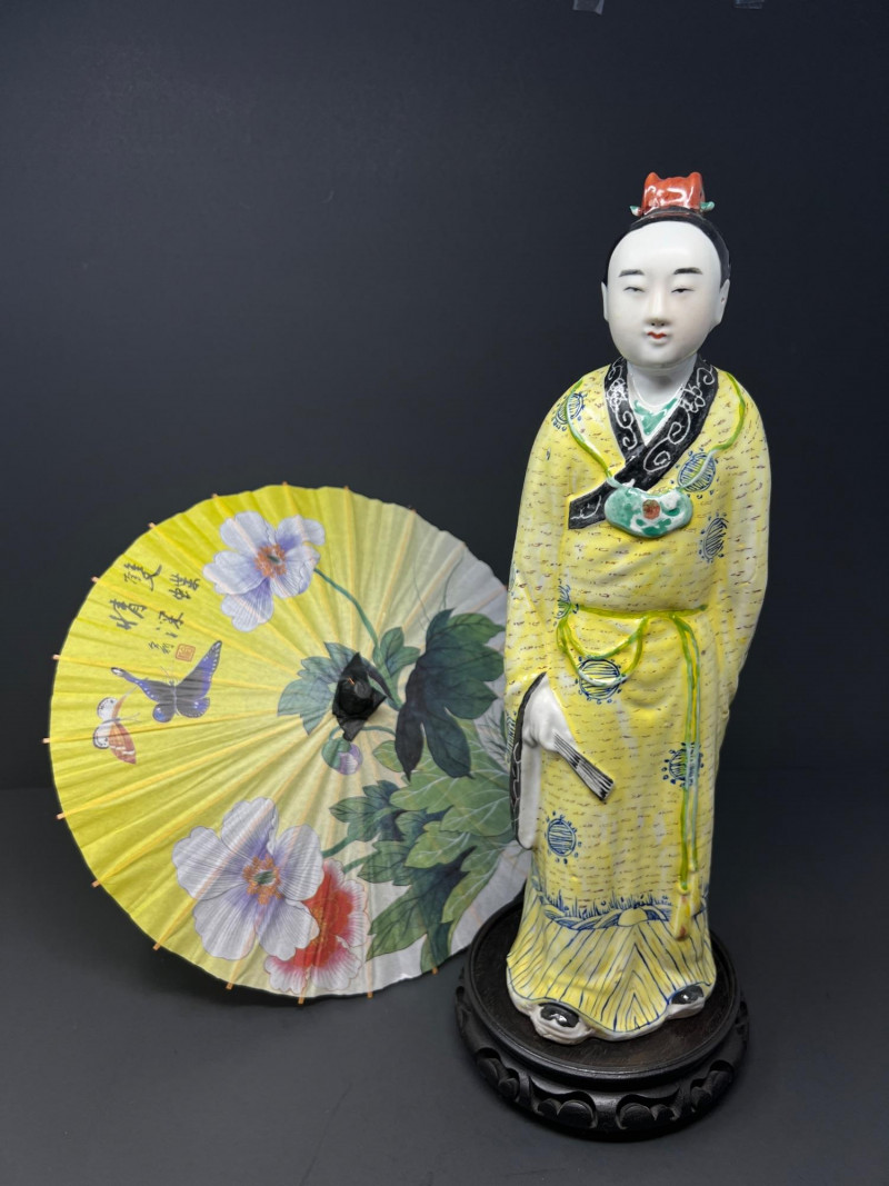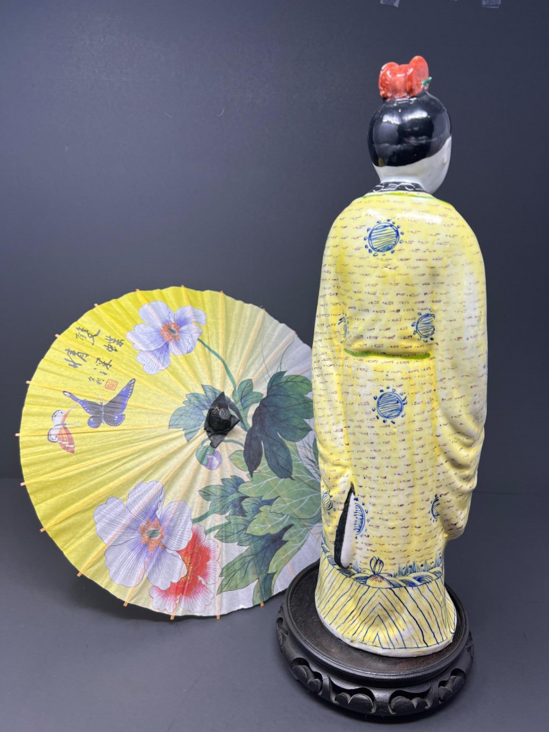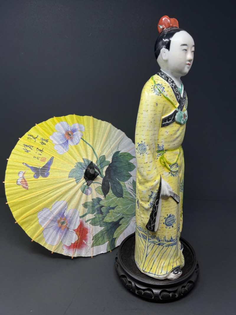 Beautiful Asian-inspired decorative grouping featuring a hand-painted Chinese lady figurine standing approximately 14 inches tall, displayed on a carved wood base. The figure is dressed in a vibrant yellow robe with delicate blue and green accents and holds a fan, showcasing classic Chinese court style. Included with the figure is a colorful paper parasol and a vintage black lacquer box with floral decoration, creating a striking chinoiserie vignette ready for display. A wonderful decorative set perfect for Asian-inspired interiors or collectors of vintage decor. Good vintage condition with light age-appropriate wear. Please see photos for details. Lady figurine 14" in height Parasol 11" in diameter Box 6.5" in diameter