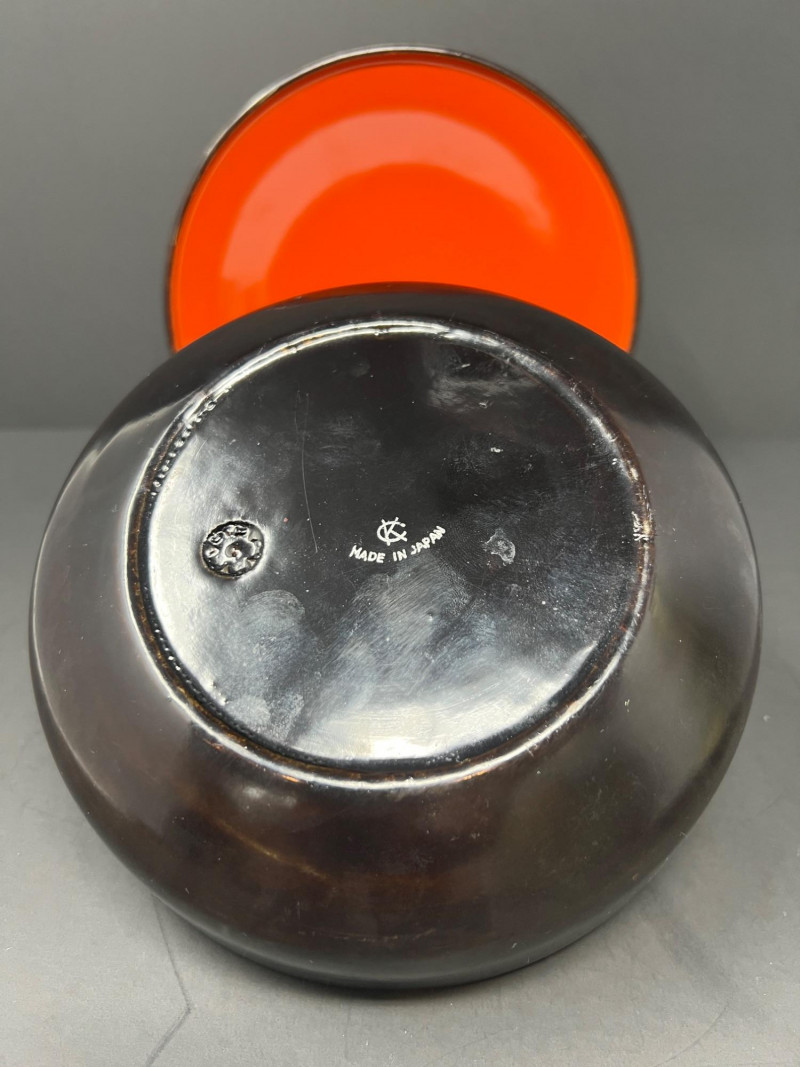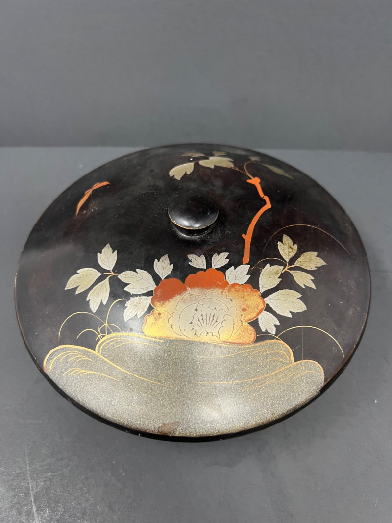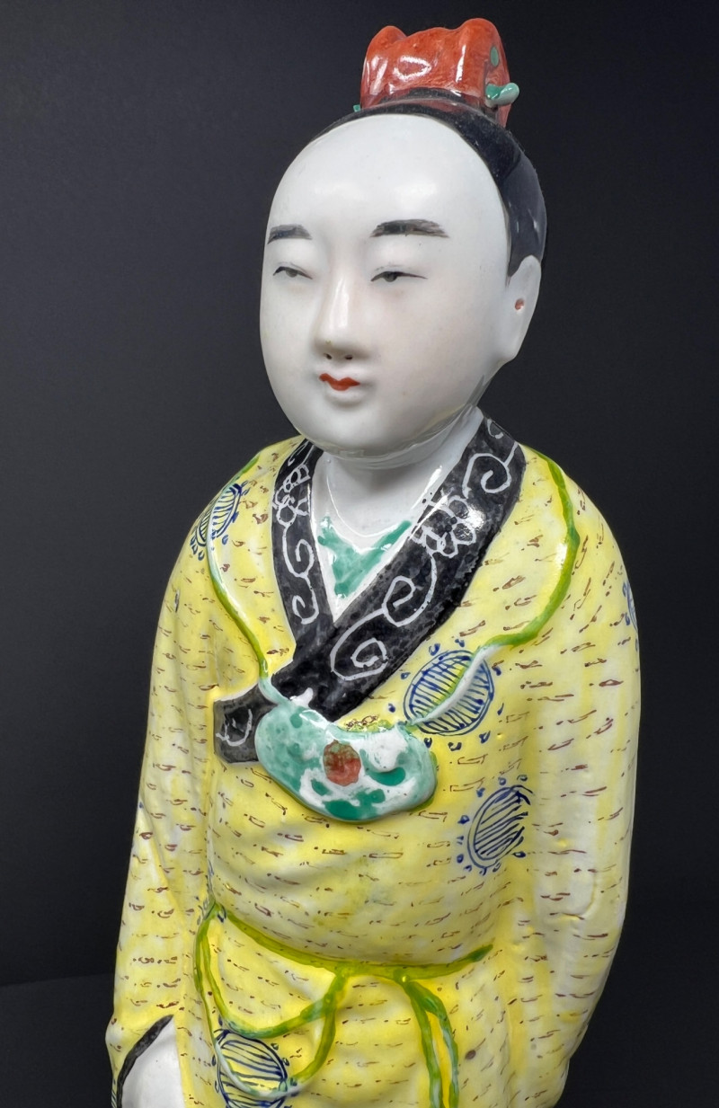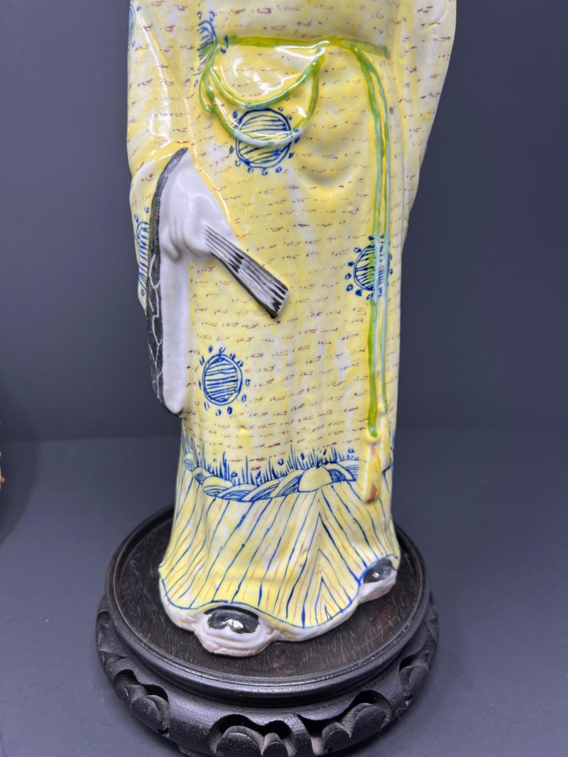 Beautiful Asian-inspired decorative grouping featuring a hand-painted Chinese lady figurine standing approximately 14 inches tall, displayed on a carved wood base. The figure is dressed in a vibrant yellow robe with delicate blue and green accents and holds a fan, showcasing classic Chinese court style. Included with the figure is a colorful paper parasol and a vintage black lacquer box with floral decoration, creating a striking chinoiserie vignette ready for display. A wonderful decorative set perfect for Asian-inspired interiors or collectors of vintage decor. Good vintage condition with light age-appropriate wear. Please see photos for details. Lady figurine 14" in height Parasol 11" in diameter Box 6.5" in diameter