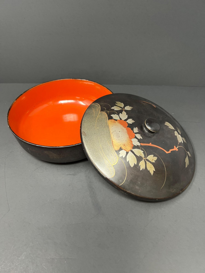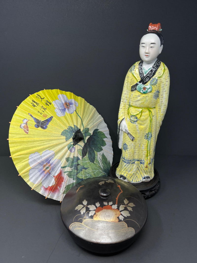 Lot # 100 - Vintage Chinese Lady Figurine w/ Stand, Parasol & Lacquer Box