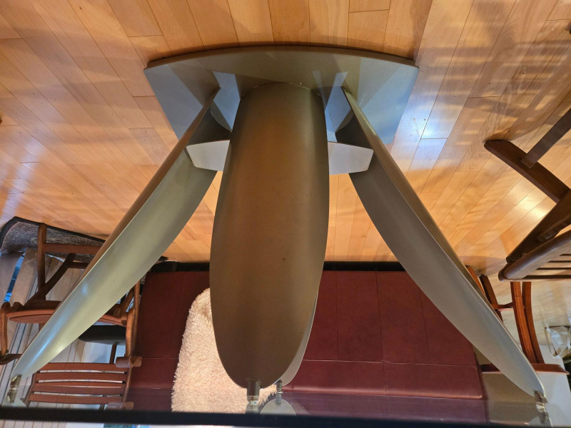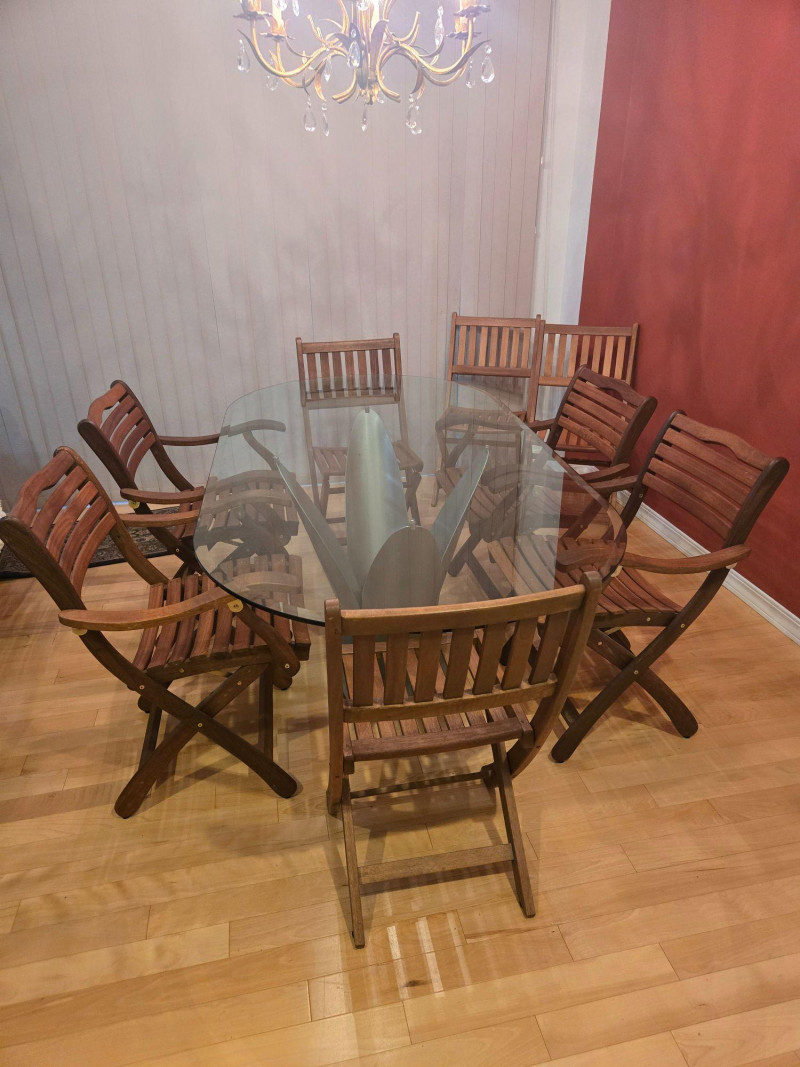 A contemporary dining set featuring a large oval glass‑top table paired with eight matching wooden chairs. The table rests on a sculptural wooden base that provides both stability and visual interest. The clear glass top allows the base design to remain visible, giving the set an open, modern feel. The eight chairs, 4 w/arms and 4 armless, are constructed in a coordinated wood tone and feature a slatted back design with gently curved lines for comfort and support. Their clean, streamlined profile complements the table’s modern aesthetic while maintaining a warm, natural look. This set is well‑suited for spacious dining rooms or open‑concept living areas, offering seating for eight and a striking centerpiece for gatherings. Condition Notes