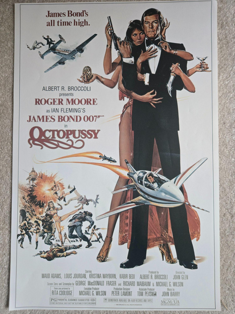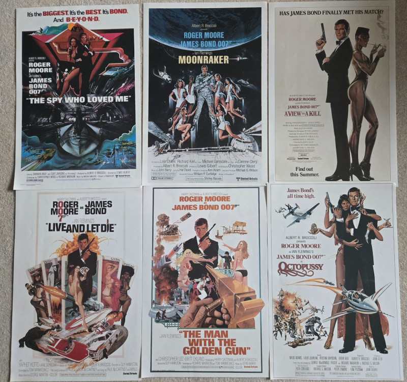 Approx 11" x 15" A bold, colorful collection of six vintage‑style James Bond film posters featuring Roger Moore in his iconic run as Agent 007. These posters capture the high‑style, globe‑trotting energy of the 1970s–1980s Bond era—full of daring stunts, glamorous intrigue, and the unmistakable charm of Moore’s portrayal. Vibrant, high‑contrast artwork typical of the Moore era Dynamic action scenes—speedboats, space shuttles, exotic locales, and signature Bond gadgets Strong retro design aesthetic with bold typography Cohesive as a set; excellent for gallery‑style display Posters are clean and well‑preserved based on the provided image No visible rips, creases, or moisture damageLot #5 — Set of 6 Vintage James Bond Movie Posters (Roger Moore Era)