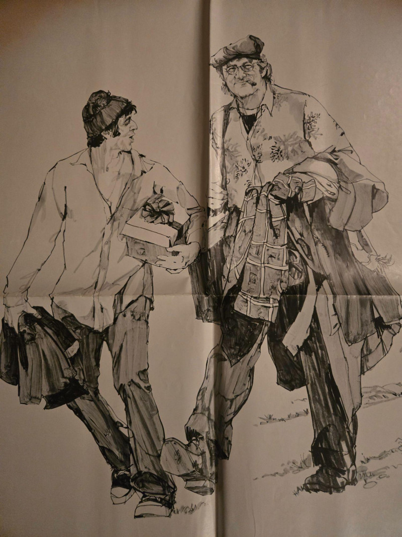 A striking, minimalist vintage‑style movie poster for “Scarecrow” (1973), the acclaimed road‑drama starring Al Pacino and Gene Hackman. This decorative reprint captures the film’s gritty, character‑driven tone with its sketch‑style artwork and understated design—perfect for collectors who appreciate 1970s cinema at its most soulful. The poster features a hand‑drawn illustration of the two drifters walking together, symbolizing the film’s themes of friendship, hardship, and the search for purpose across America. Above the artwork, the bold typography highlights both stars’ names, with the title centered beneath a small scarecrow icon. The clean layout and muted palette give the piece a timeless, art‑house feel. Starring Gene Hackman & Al Pacino Written by Garry Michael White Directed by Jerry Schatzberg Produced by Robert M. Sherman A Warner Bros. release Presented in Panavision & Technicolor Rated R Visible creases, pictured UnframedLarge “Scarecrow” w/ Al Pacino & Gene Hackman Movie Poster
