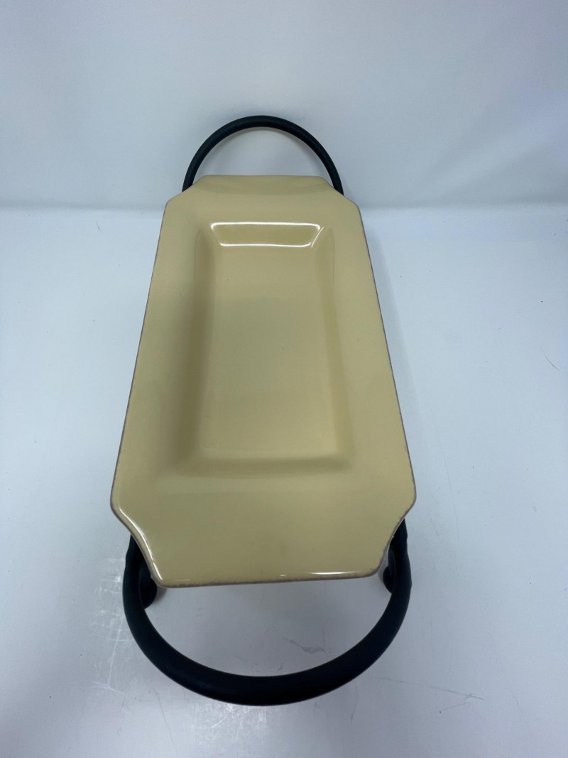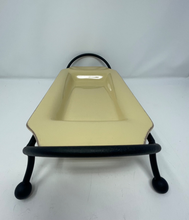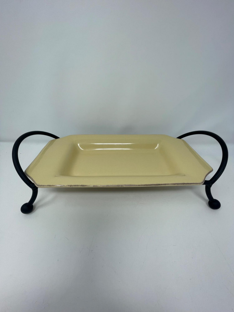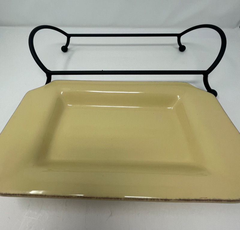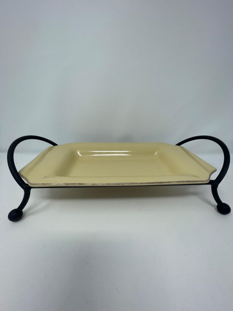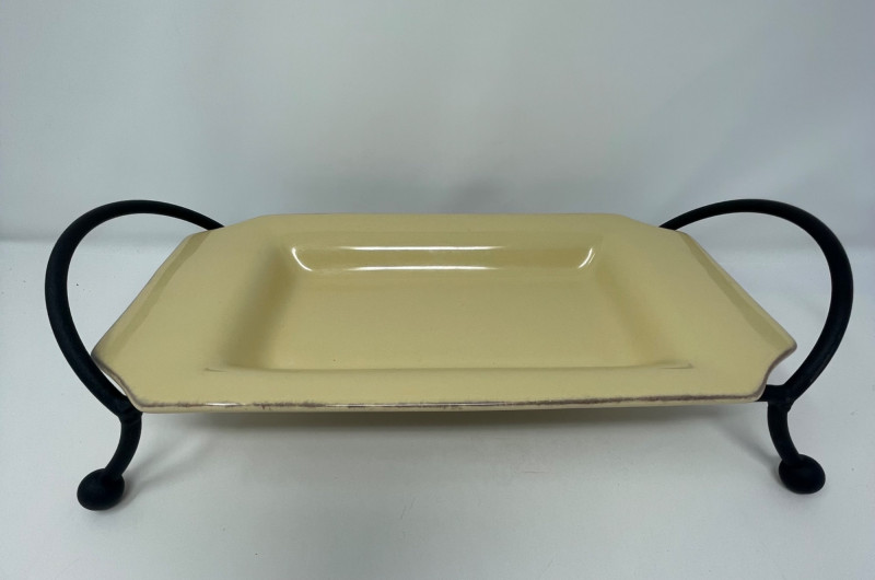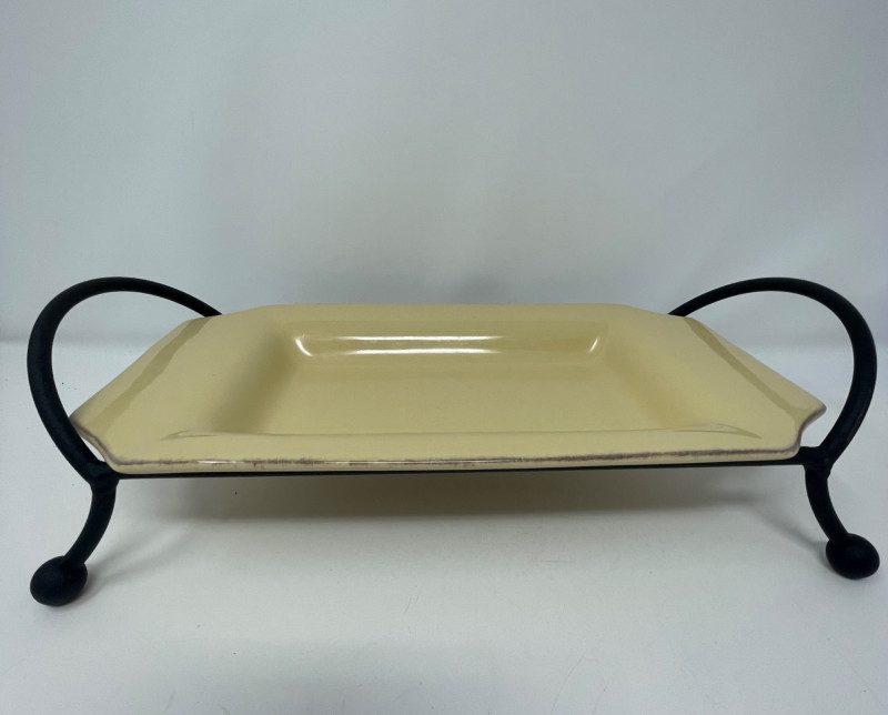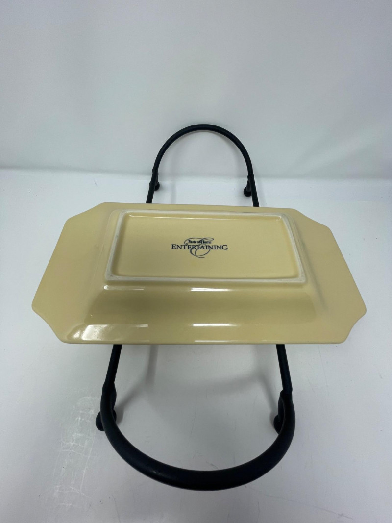 Rectangular Platter & Stand: The rectangular serving tray resting on a black metal base is Taste of Home rectangular platter, typically paired with a wrought iron stand.