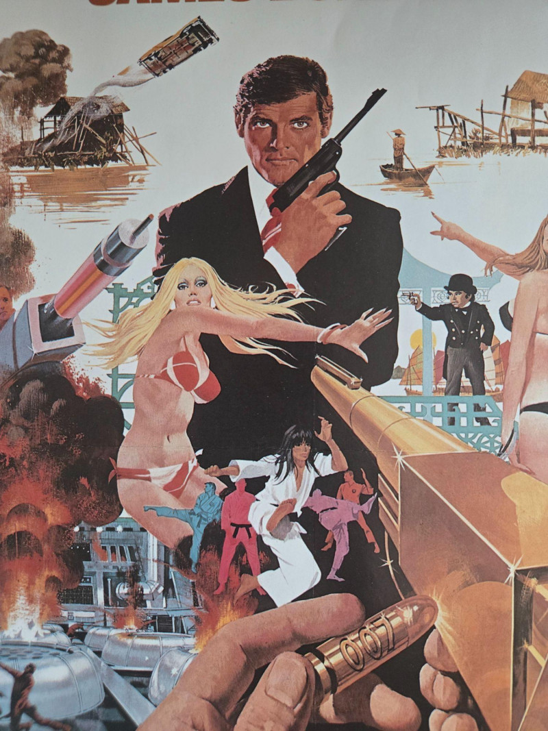 A striking design centered around the legendary golden gun, surrounded by martial‑arts action, island intrigue, and Bond’s duel with the assassin Scaramanga. Bright colors and dramatic composition make this one especially eye‑catching. Both posters are clean and well‑preserved based on the provided image No visible tears, creases, or moisture damage Unframed,Pair of James Bond Movie Posters:
