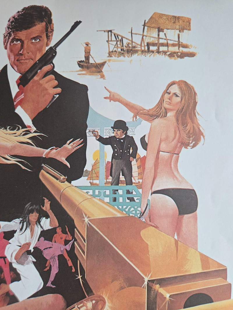 A vibrant collage of tarot cards, speedboats, explosions, and Bond’s signature cool under pressure. The artwork highlights the film’s blend of voodoo mystique, New Orleans flair, and high‑octane chase sequences. The Man with the Golden Gun (1974)
