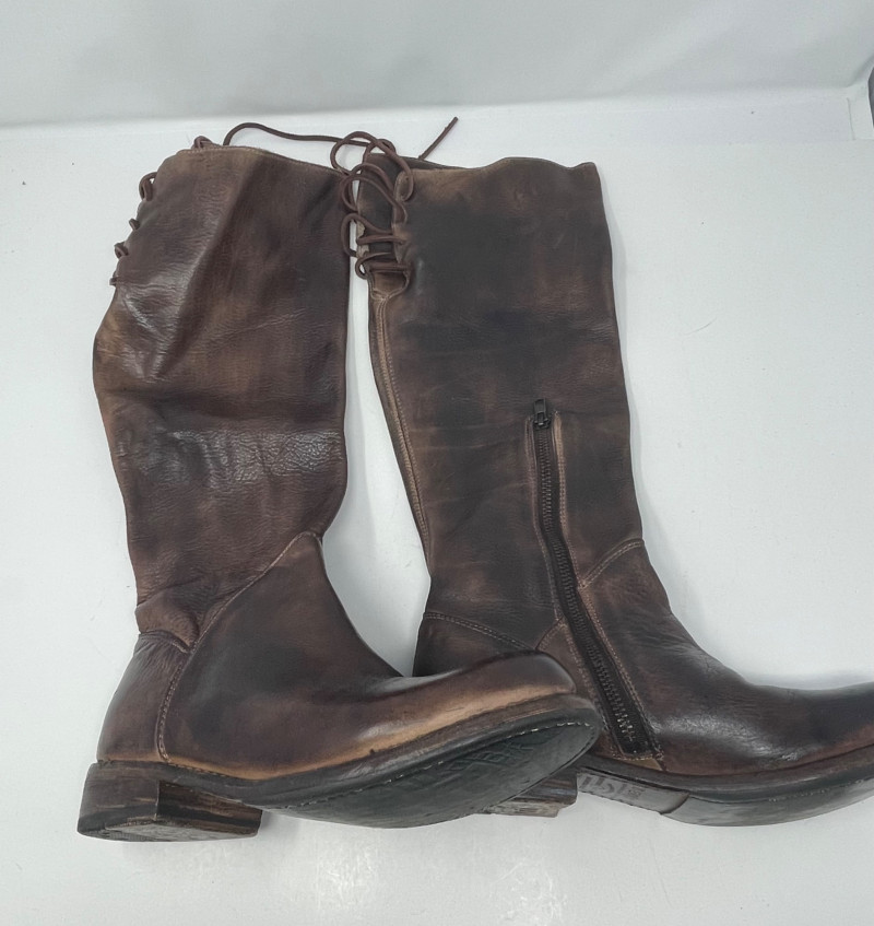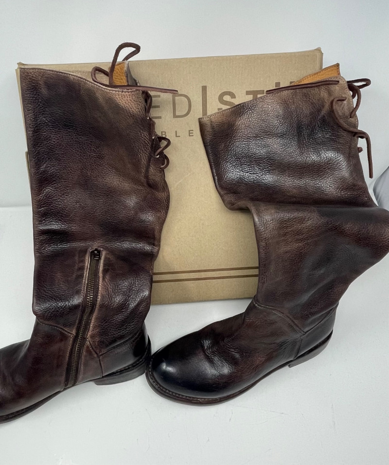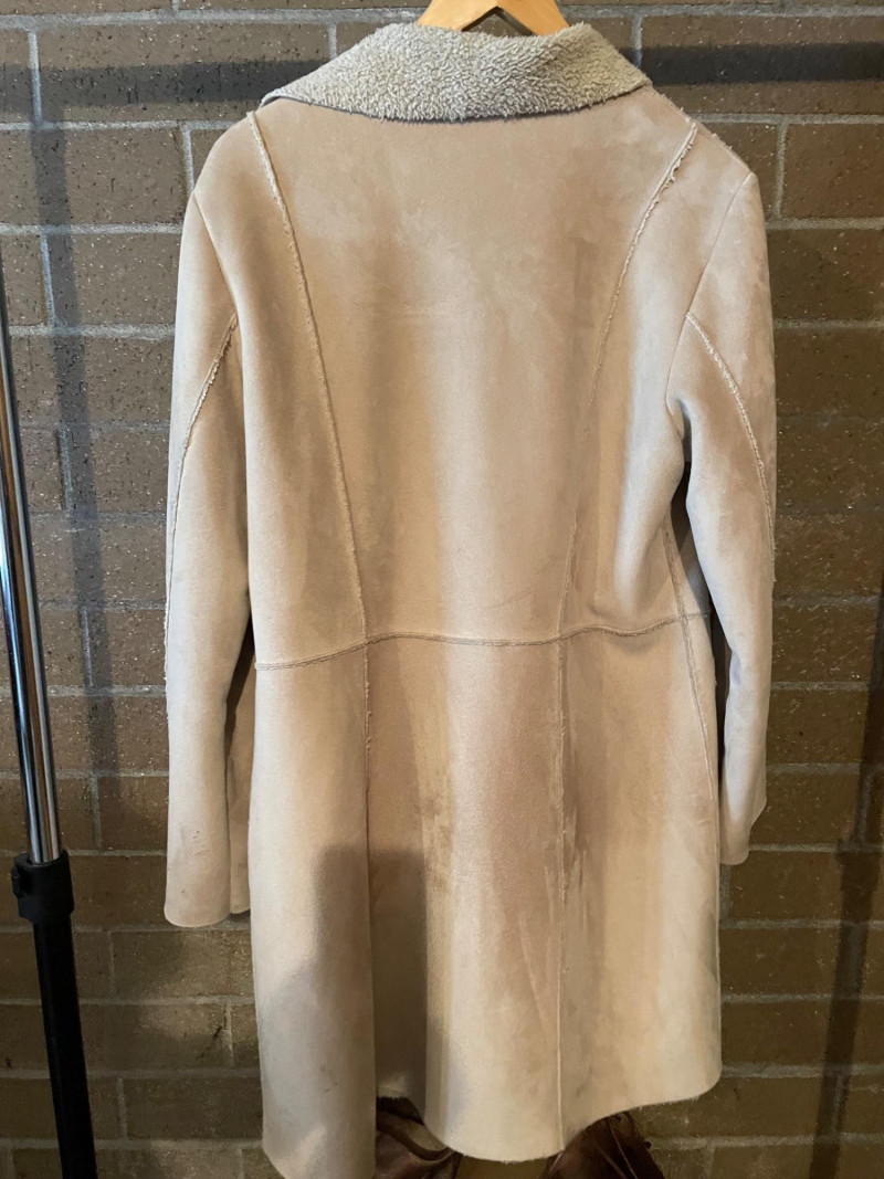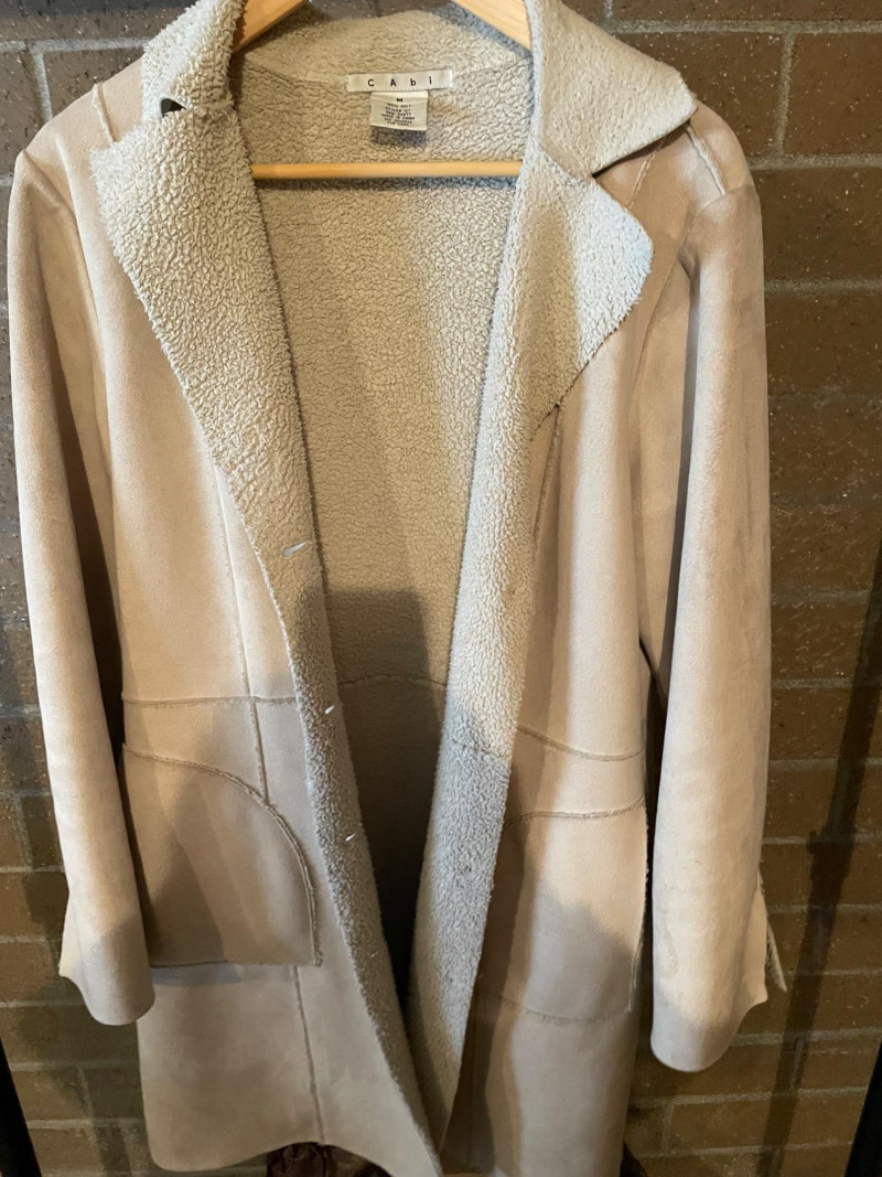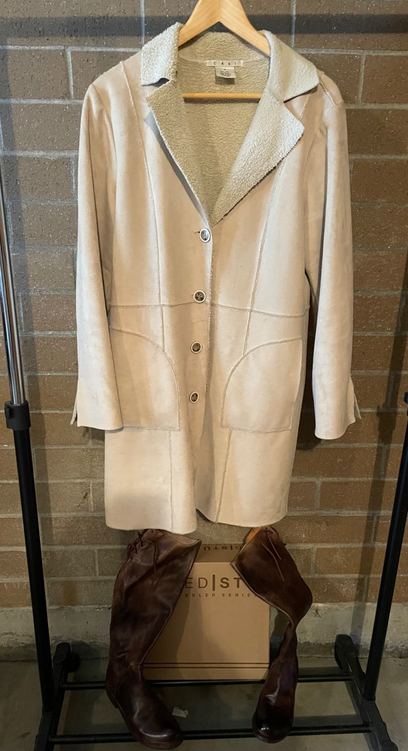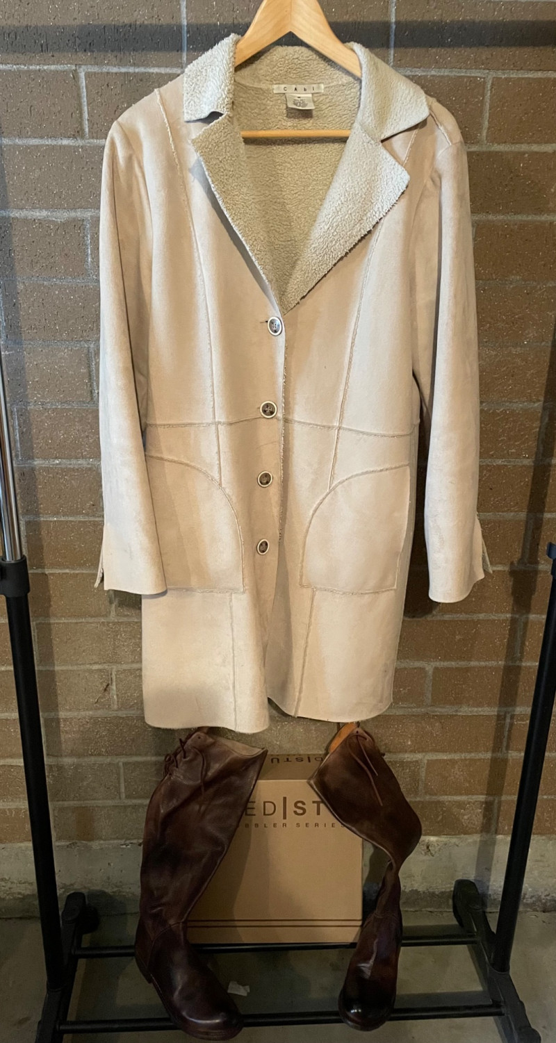 Distressed BED STU Manchester II Style Woman’s Boots In Teak Rustic color and Size 7 Woman’s Cabi Cream Knee Length Jacket size Medium. Bed|Stü Manchester II tall leather boots in the color Teak Rustic, part of their Cobbler Series Design: Features a classic round or almond-shaped toe, a half inner-ankle zipper for easy entry, and decorative leather lacing at the upper back shaft. Construction: Built with a durable Goodyear welt and a manhole-inspired rubber traction outsole. CAbi Faux Suede Shearling Coat (Style #127). It is a knee-length, beige coat featuring a soft faux suede exterior and a contrast faux shearling (sherpa) lining.