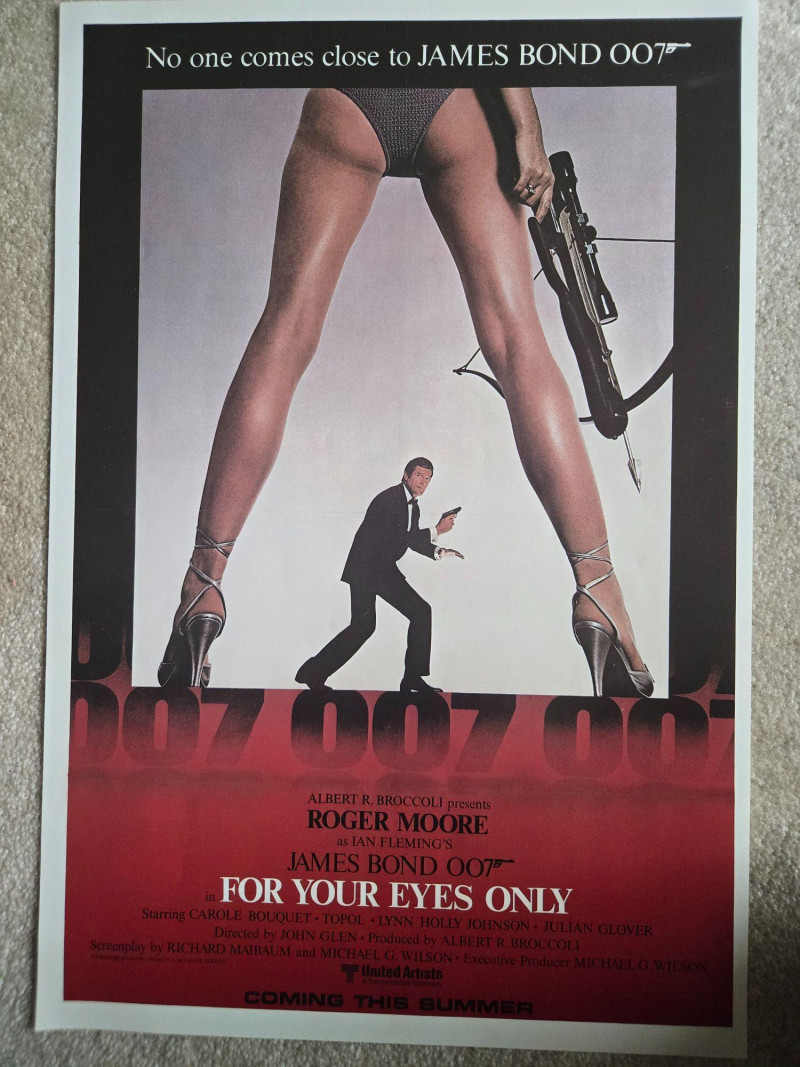 A striking vintage‑style movie poster for “For Your Eyes Only” (1981), starring Roger Moore as James Bond 007. This decorative reprint captures one of the most iconic poster designs of the Moore era—sleek, bold, and unmistakably Bond. The artwork features the unforgettable composition of a crossbow‑wielding heroine framed above Bond in his classic stance, set against a gradient backdrop that transitions into the repeating 007 motif. The design blends glamour, danger, and Cold War intrigue, perfectly reflecting the film’s return to grounded espionage after the sci‑fi spectacle of Moonraker. Starring Roger Moore Co‑starring Carole Bouquet, Topol, Lynn‑Holly Johnson, Julian Glover Directed by John Glen Produced by Albert R. Broccoli Screenplay by Richard Maibaum & Michael G. Wilson A United Artists release Poster is clean and well‑preserved based on the provided image No tears, creases, or moisture damage UnframedJames Bond “For Your Eyes Only” Movie Poster