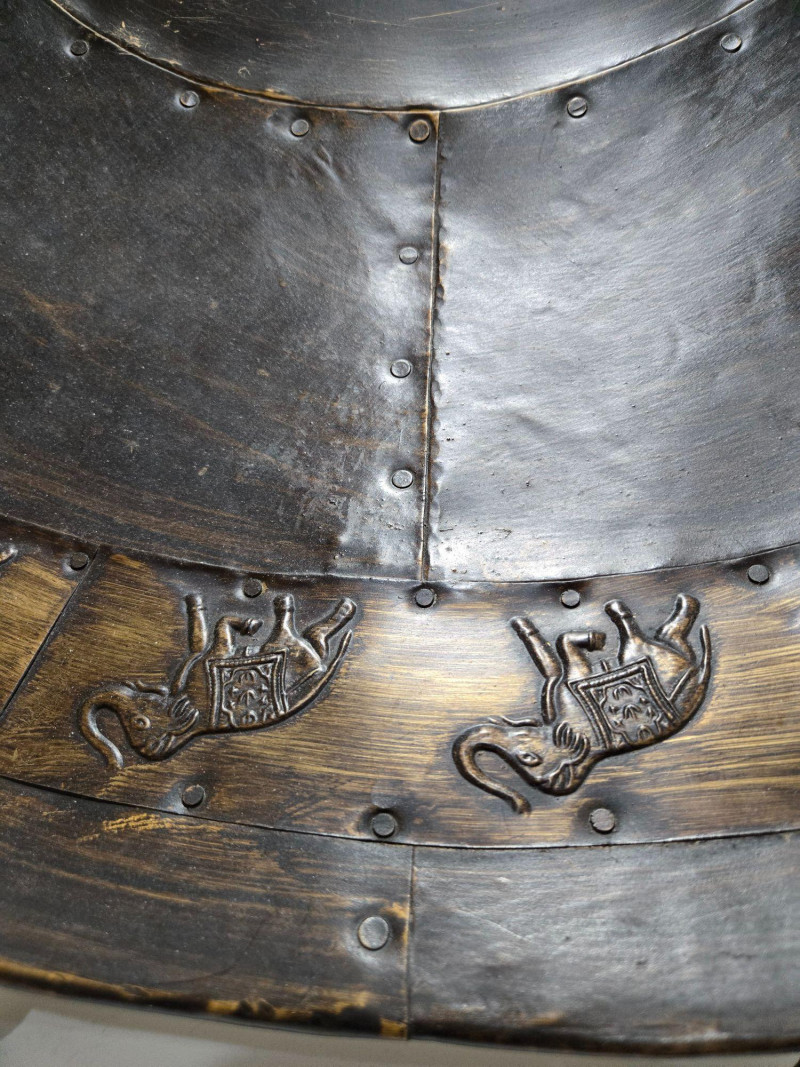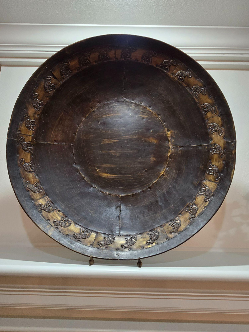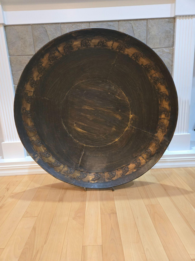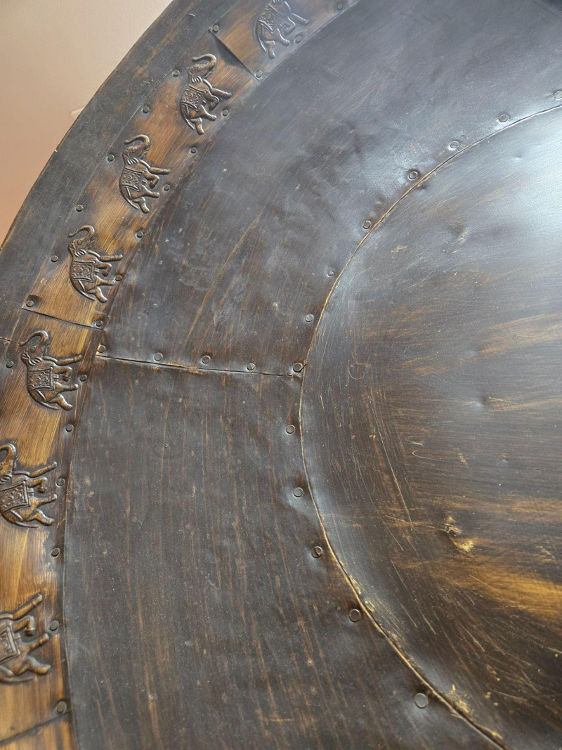 A striking round embossed metal wall piece measuring approximately 36 inches in diameter. The design features a continuous ring of elephants in raised relief, each depicted in a walking stance with trunks lifted. The surface shows a dark, aged patina with visible segmenting and riveted joins, giving the piece a handcrafted, old‑world character. The bold circular form and repeating elephant motif make this an eye‑catching decorative accent suitable for entryways, living rooms, or global‑inspired interiors. Its substantial size allows it to function as a standalone statement piece. Condition Notes