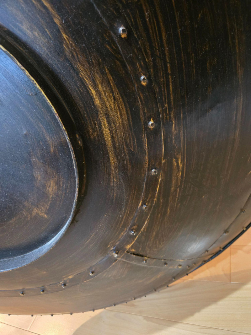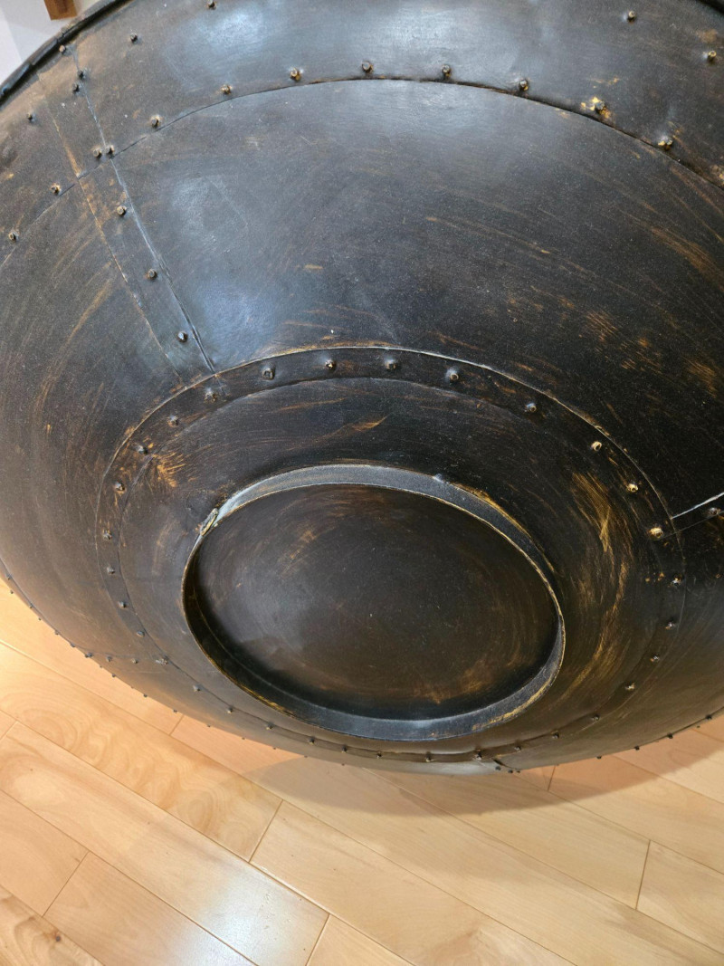 The metal surface shows intentional aging and textural variation consistent with its design. No dents or structural issues. As with all decorative metalwork, expect natural wear consistent with display. Size: 36" Round x 12" D