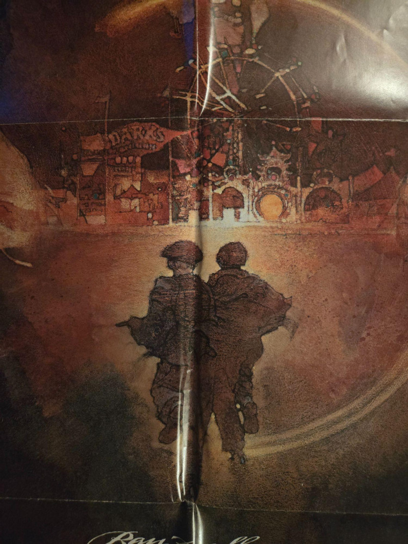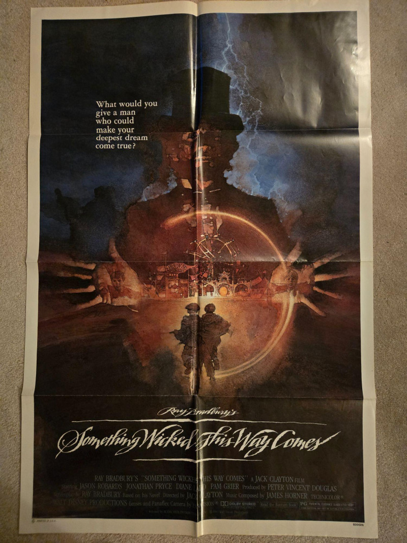 A haunting and atmospheric vintage‑style movie poster for “Ray Bradbury’s Something Wicked This Way Comes” (1983), the dark fantasy classic starring Jason Robards and Jonathan Pryce. This decorative reprint captures the film’s eerie blend of magic, temptation, and small‑town mystery. The artwork centers on the ominous figure of Mr. Dark, his silhouette merging with storm clouds and lightning, creating an unforgettable sense of foreboding. Below him glows the carnival—beautiful, dangerous, and irresistible—while two boys approach, hinting at the story’s themes of courage, innocence, and the seductive pull of dreams. The poster’s deep blues, purples, and golds evoke the film’s supernatural tone and Bradbury’s lyrical storytelling. Starring Jason Robards, Jonathan Pryce, Diane Ladd, Pam Grier Screenplay by Ray Bradbury, based on his novel Directed by Jack Clayton Music by James Horner A Bryna Company Production Released by Walt Disney Productions Rated PG Visible creases, picyured UnframedLarge “Something Wicked This Way Comes” Movie Poster