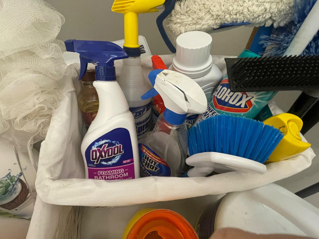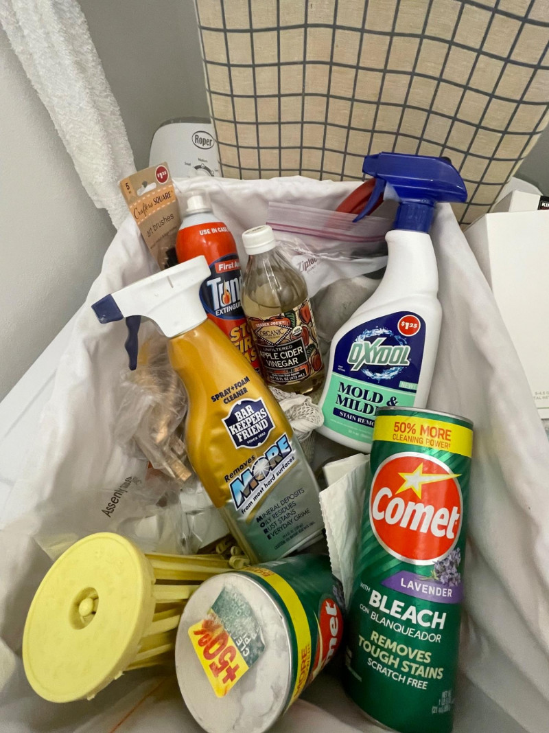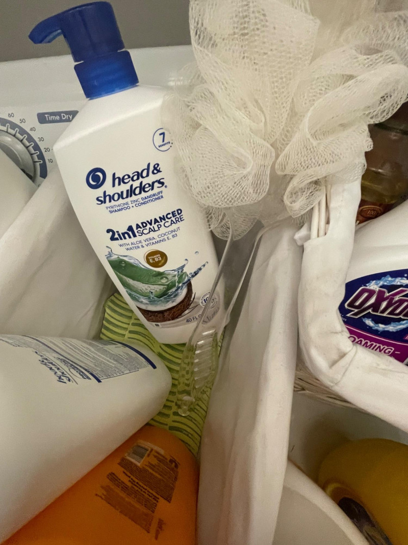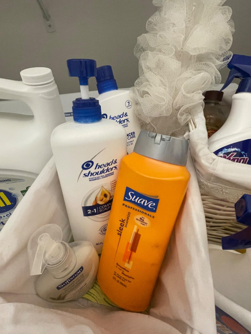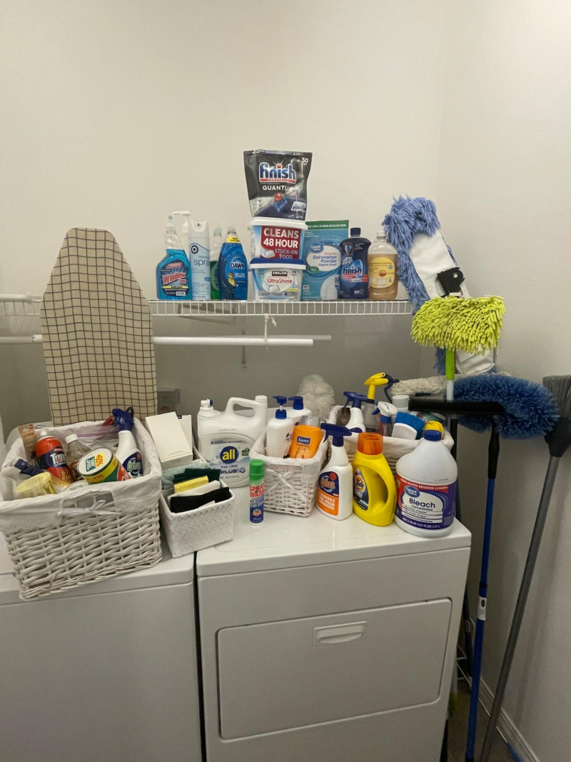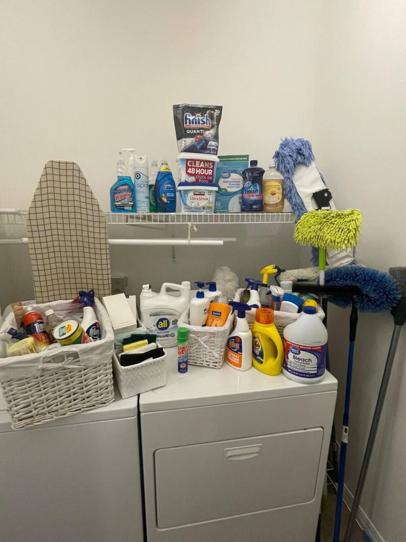 House hold cleaning products,, some full and some partial full. Dishwasher tabs are both full, rags for cleaning, laundry soap full, bleach almost full, 2 boxes of Kirkland Bar Soap, head and shoulders 1 partial, 1 never opened, etc. Table top Iron Board 32”x12 and Many other items. Baskets included. Washer and Dryer not included.