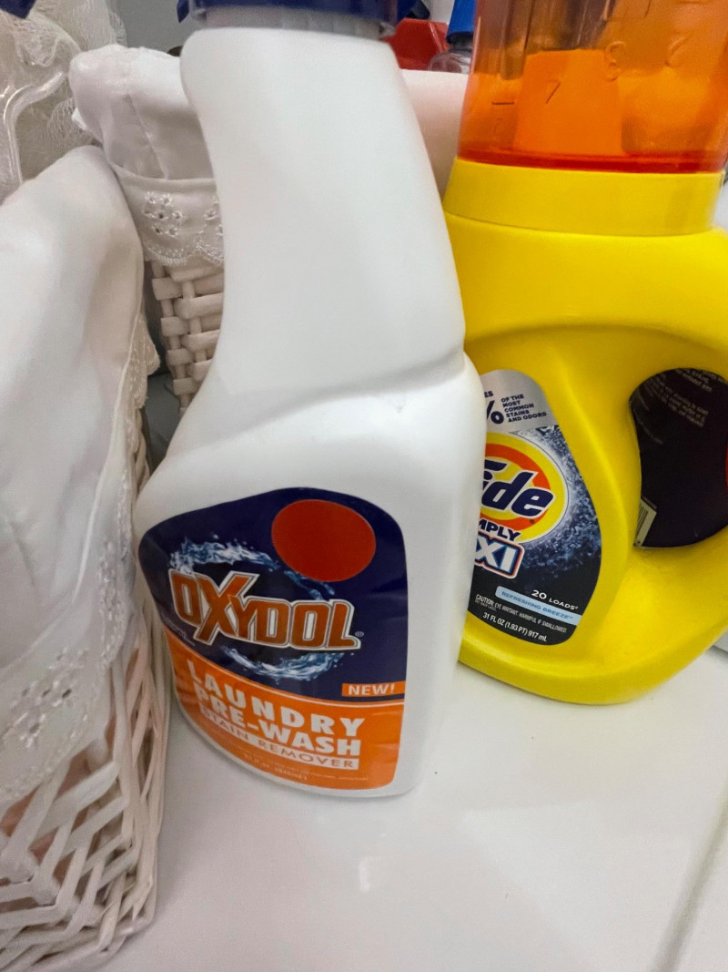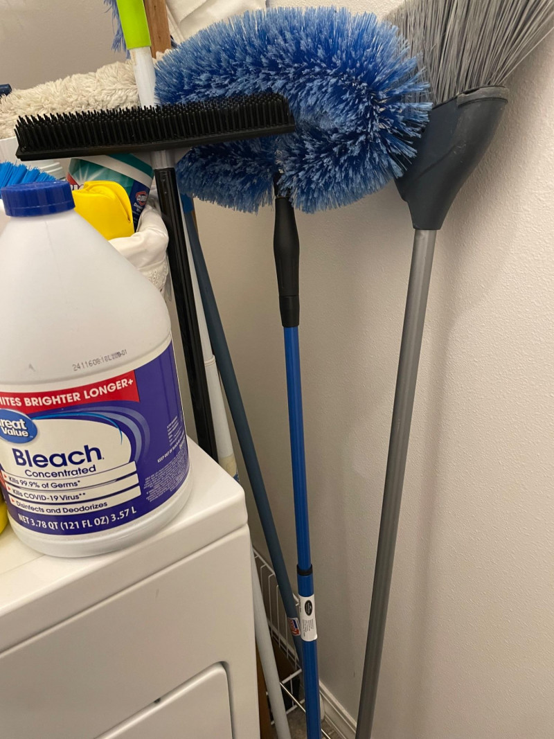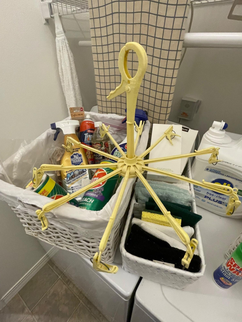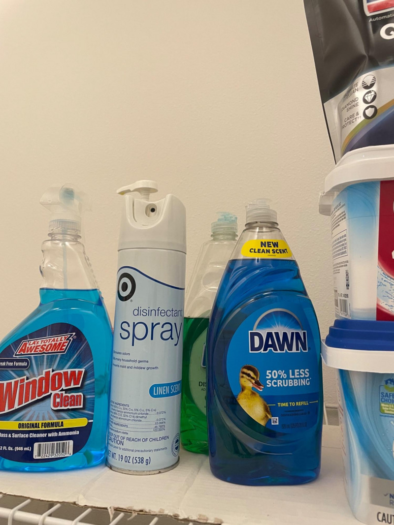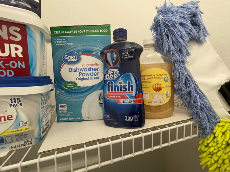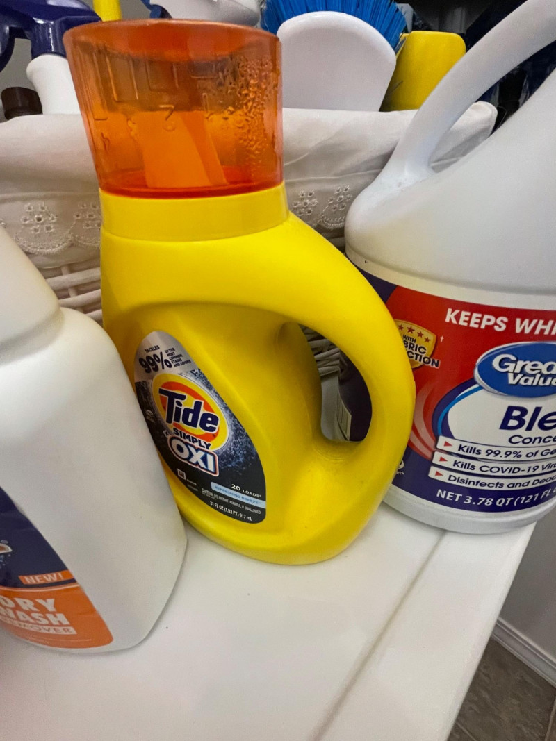 House hold cleaning products,, some full and some partial full. Dishwasher tabs are both full, rags for cleaning, laundry soap full, bleach almost full, 2 boxes of Kirkland Bar Soap, head and shoulders 1 partial, 1 never opened, etc. Table top Iron Board 32”x12 and Many other items. Baskets included. Washer and Dryer not included.