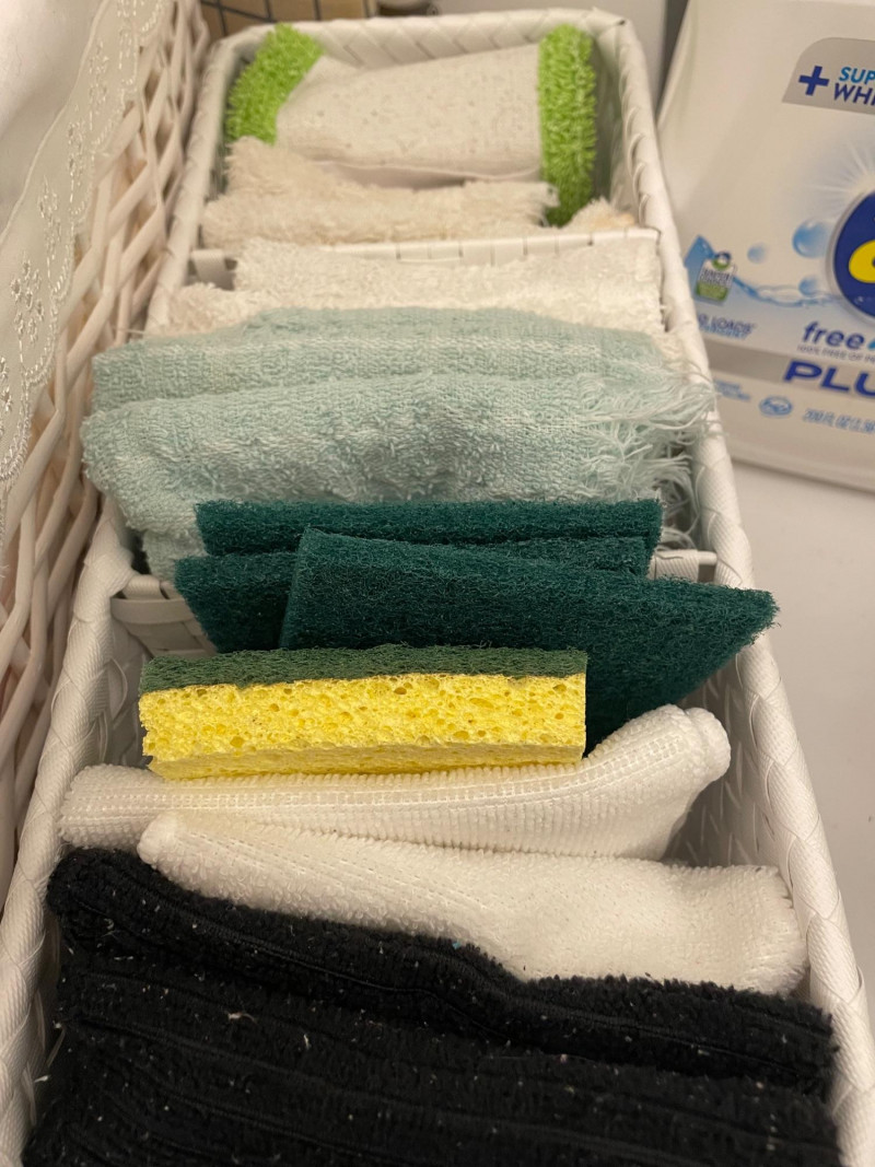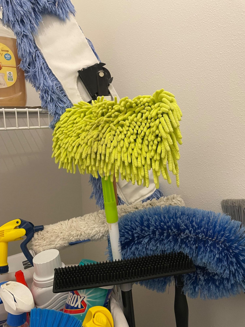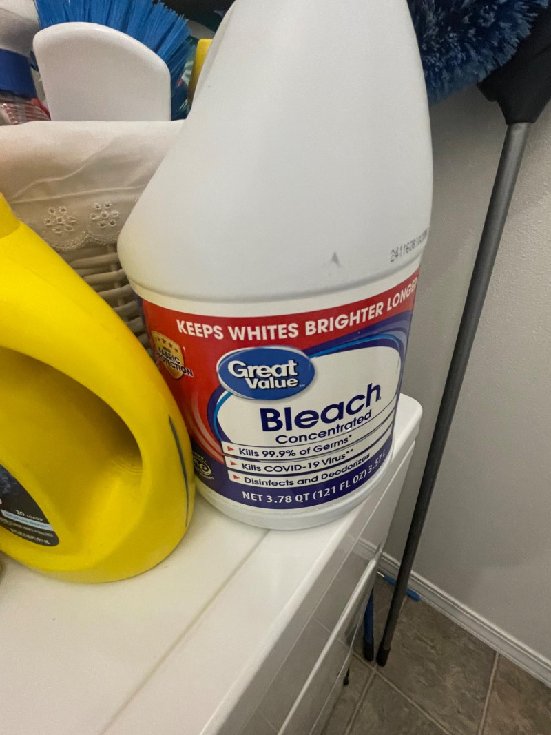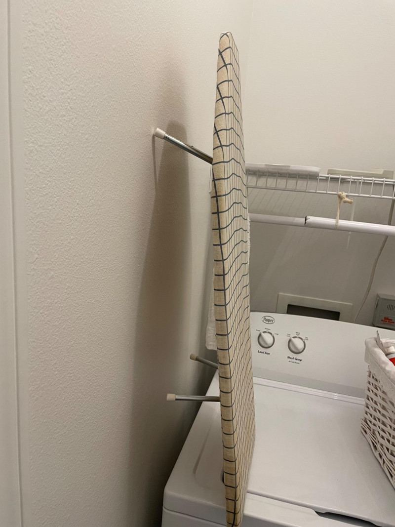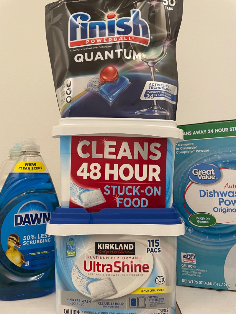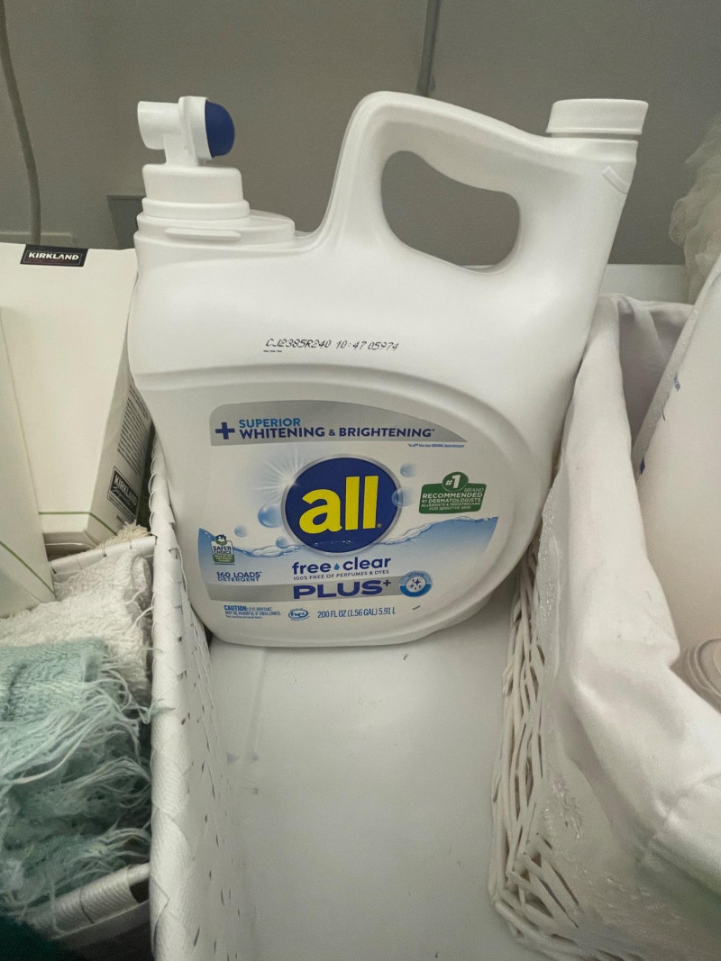 House hold cleaning products,, some full and some partial full. Dishwasher tabs are both full, rags for cleaning, laundry soap full, bleach almost full, 2 boxes of Kirkland Bar Soap, head and shoulders 1 partial, 1 never opened, etc. Table top Iron Board 32”x12 and Many other items. Baskets included. Washer and Dryer not included.