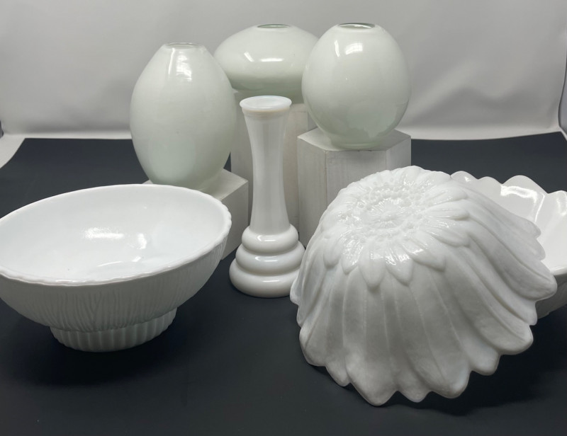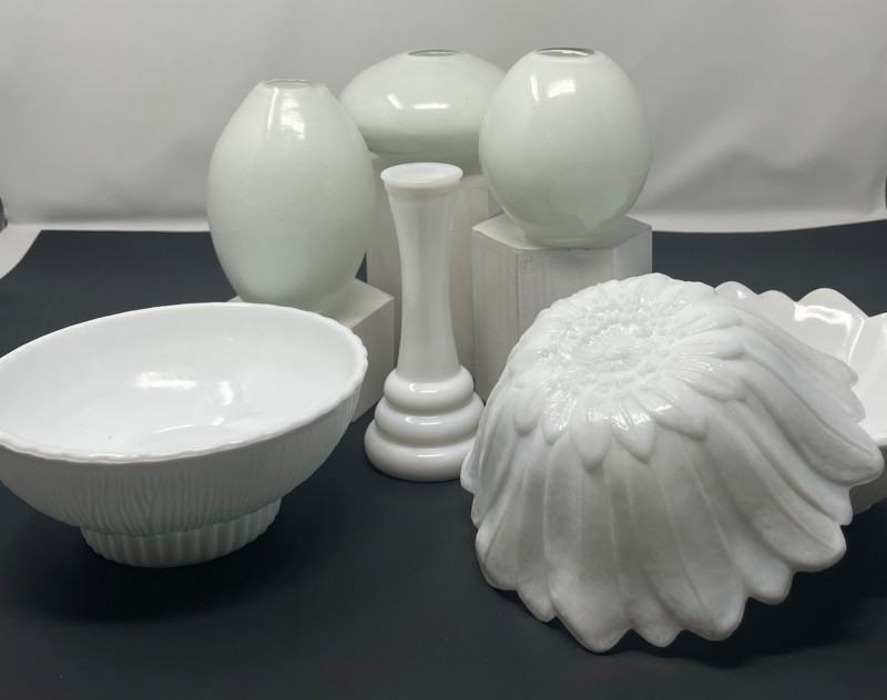 Milk Glass Tulip Bowls 7” x 4” - Total 2 Milk Glass Bud Vase 6” x 2 1/2” Torre & Tagus Mini Luster Glass Vases 3” to 6 FTD Glass Flower Bowl 7” x 4”